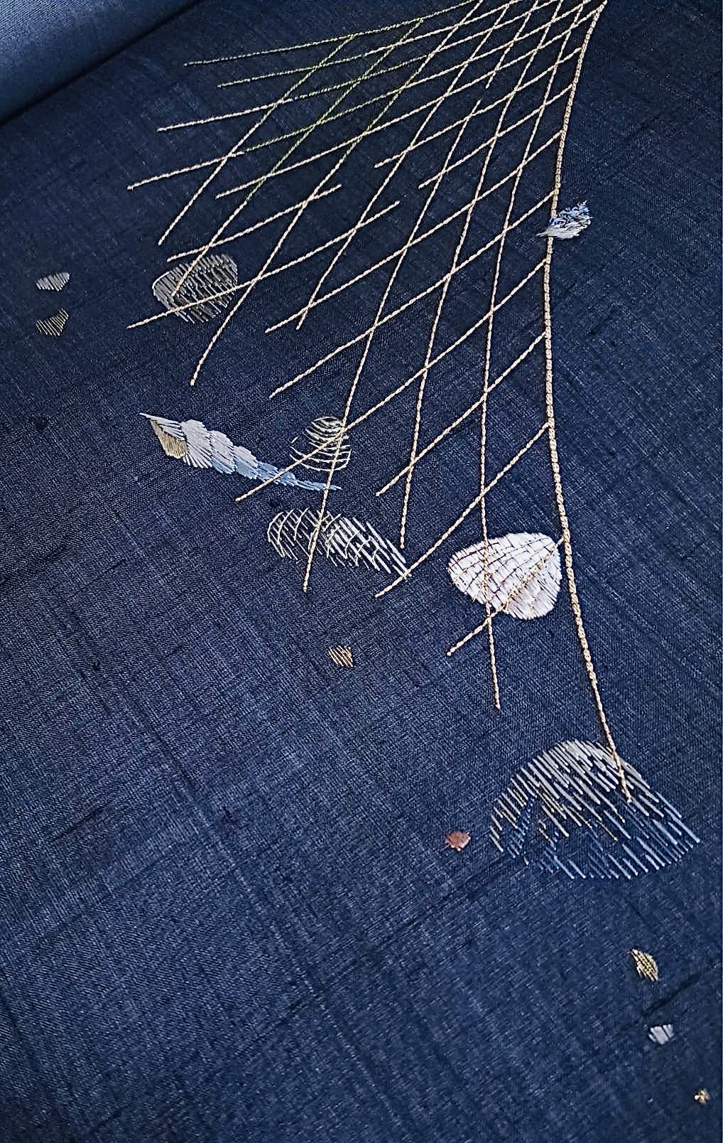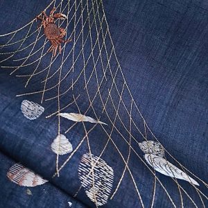 松や楓を得意の藍の濃淡で挿し、摺箔、刺繍で遠山、洲浜・・・技巧を凝らした絵画のような逸品です。