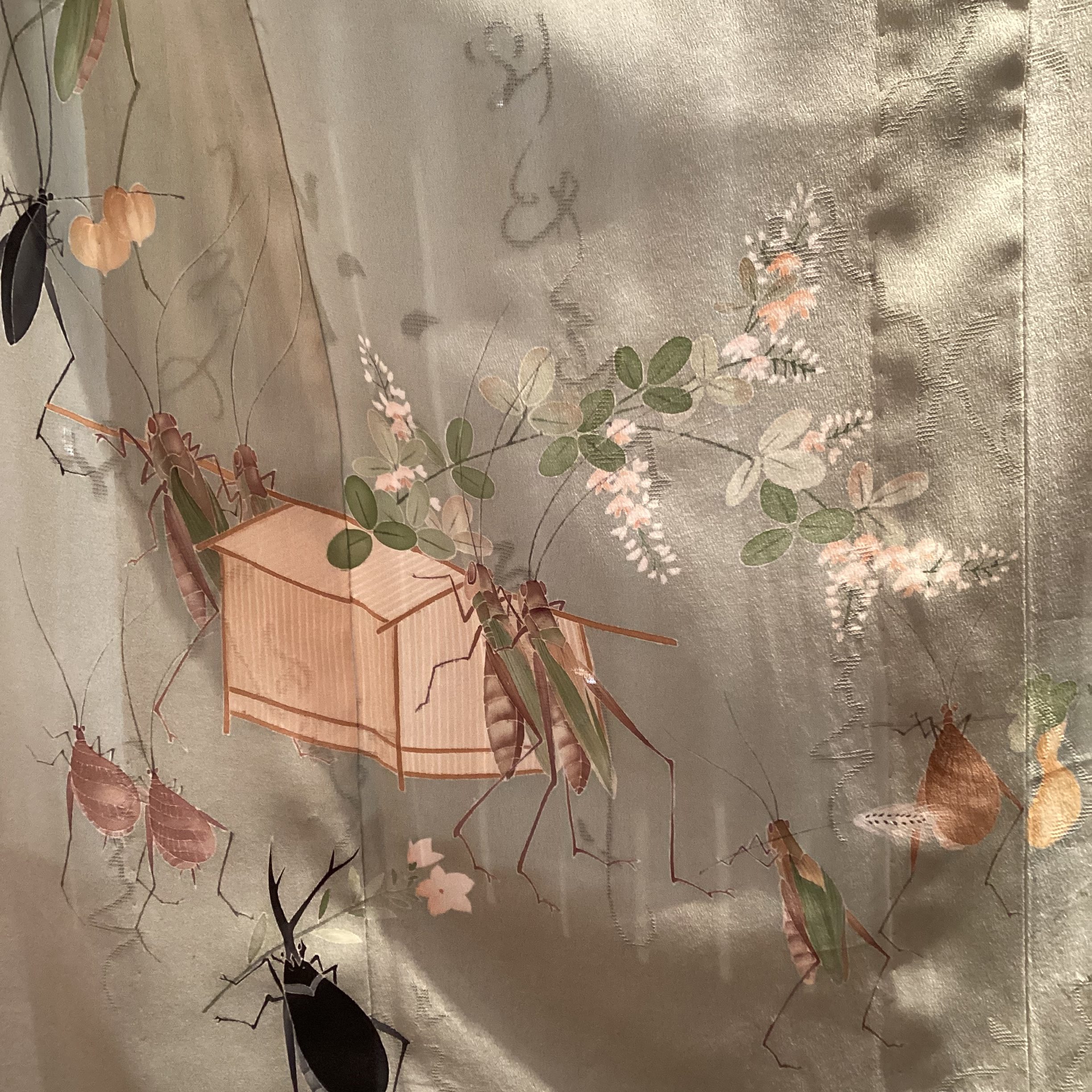 ご紹介の着物は、地紋に竹が織り出されていて裾に愛らしい雀達が描かれた付下げです。