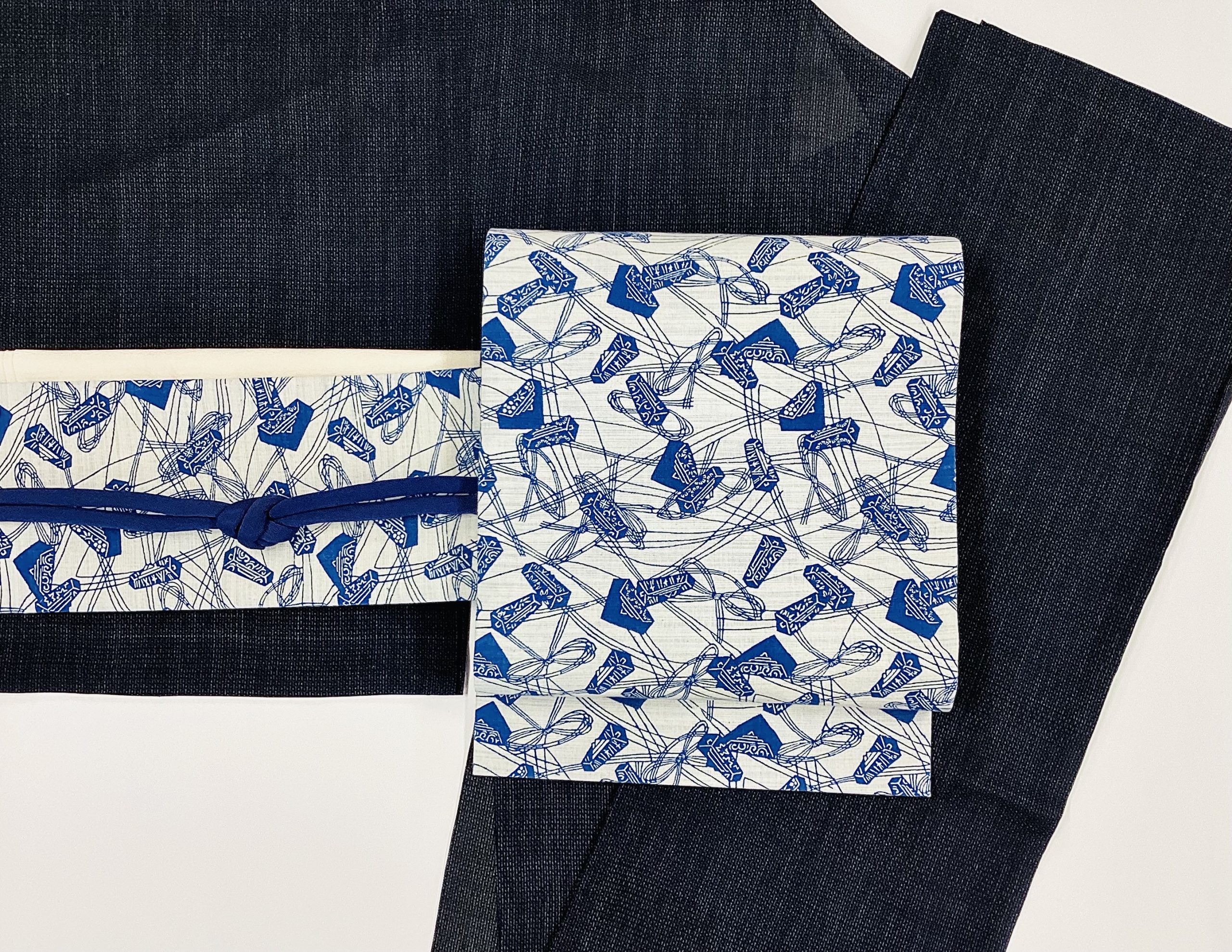 合わせた帯は灯屋2デザイン名物裂の切り継ぎ。