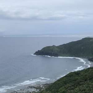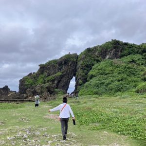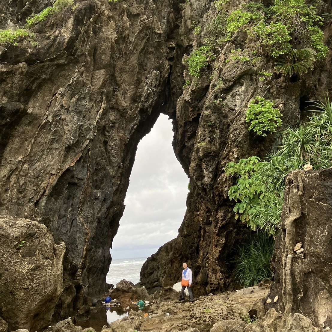 つづいても久米島の名所。ミーフーガーは石灰岩と礫岩の一種がぶつかり合ってできたという地質学的にも貴重なパワースポット。この日は岩と岩の間から荒々しい海が見えました。