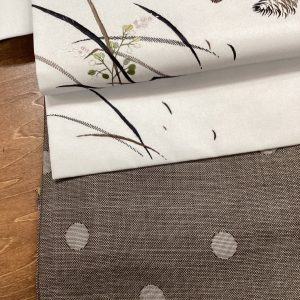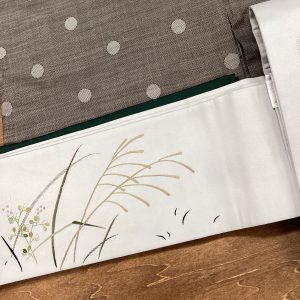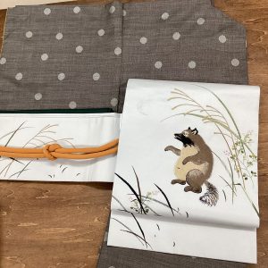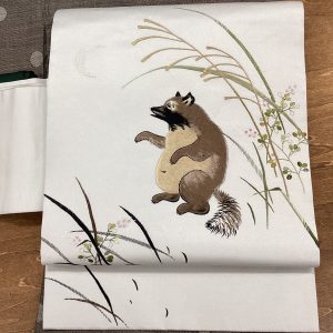 そこで本日ご紹介するのは秋草とススキと戯れる狸の刺繍帯。