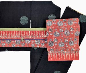 黒地源氏香文様絣結城縮の着物にインド フルカリ刺繍の名古屋帯