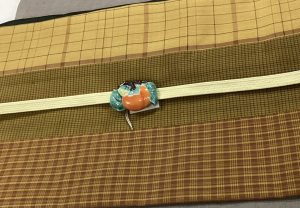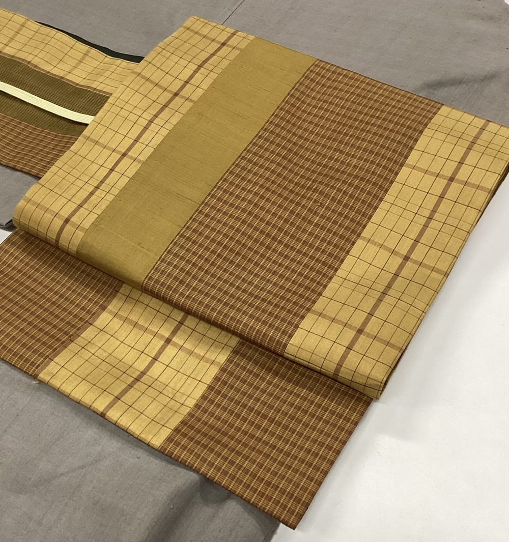 春を感じる黄色と秋色の焦茶を継ぎ合わせたことで、季節を選ばず、使いやいす黄八丈の帯になっています。