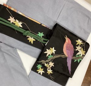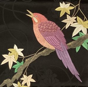 帯は、紅葉の枝に尾長の刺繍名古屋帯です。