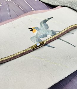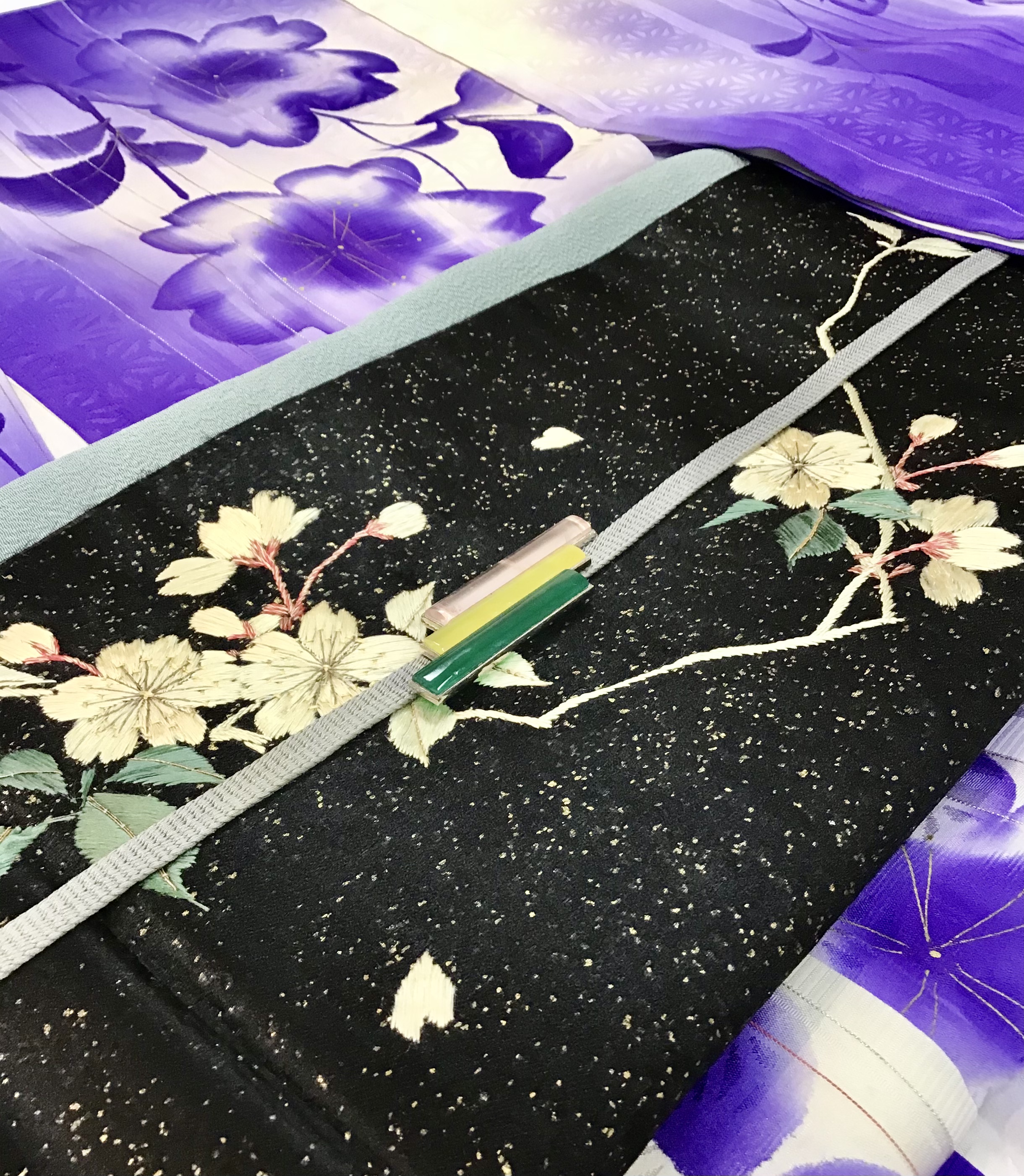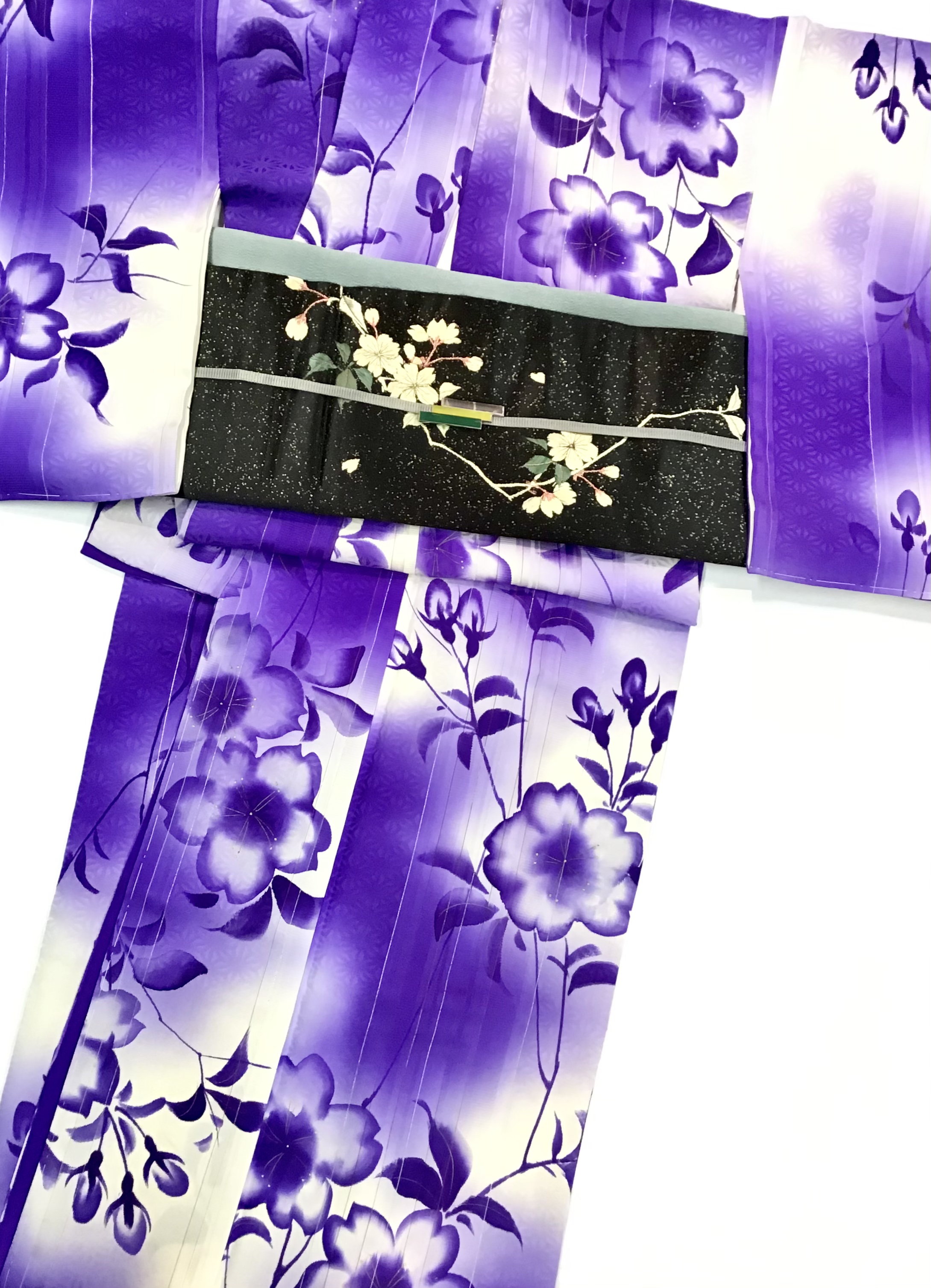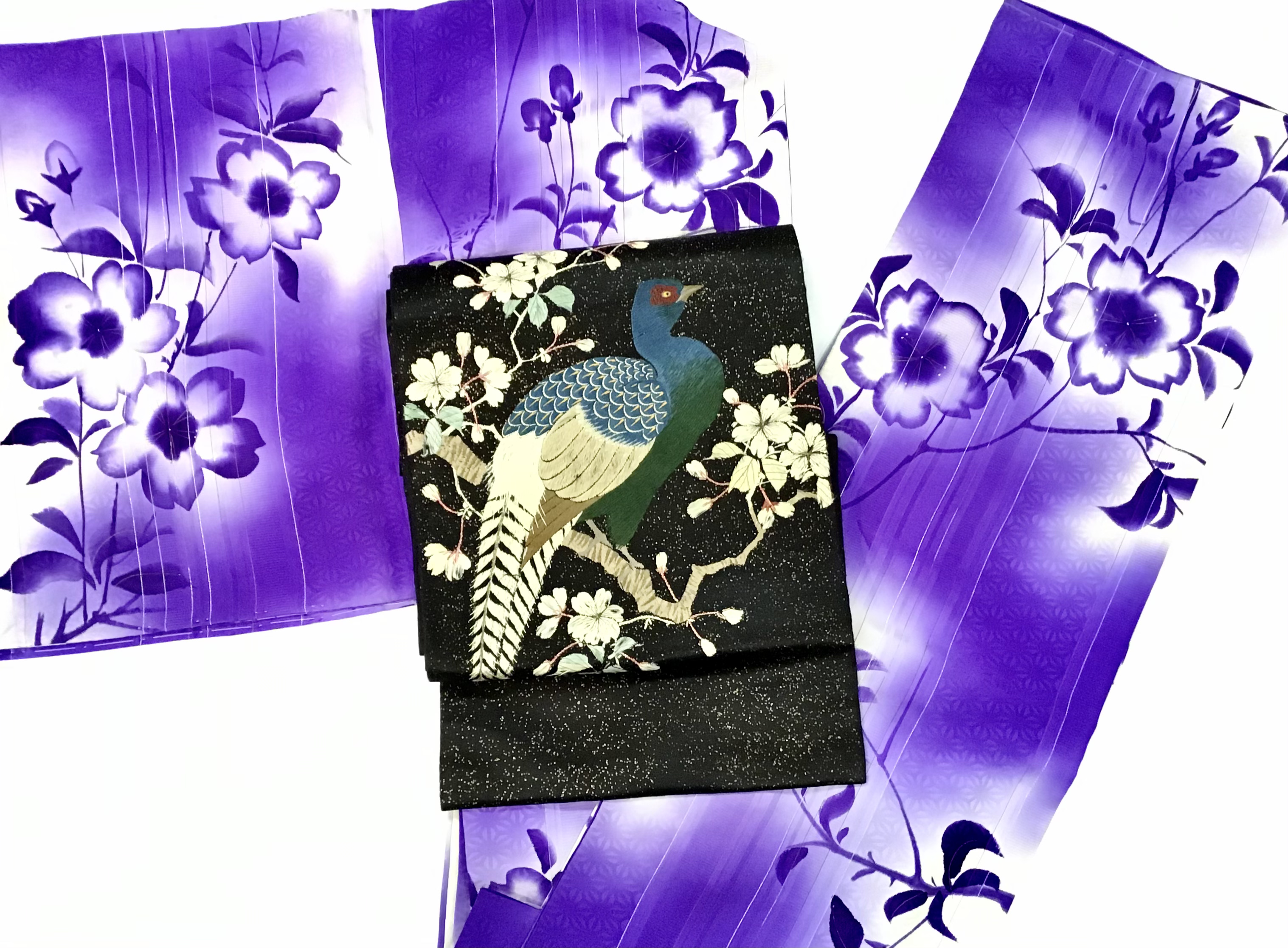 合わせた帯は、紫陽花や牡丹、朝顔、沢瀉など春から夏の季節の花々が描かれた夏帯です。