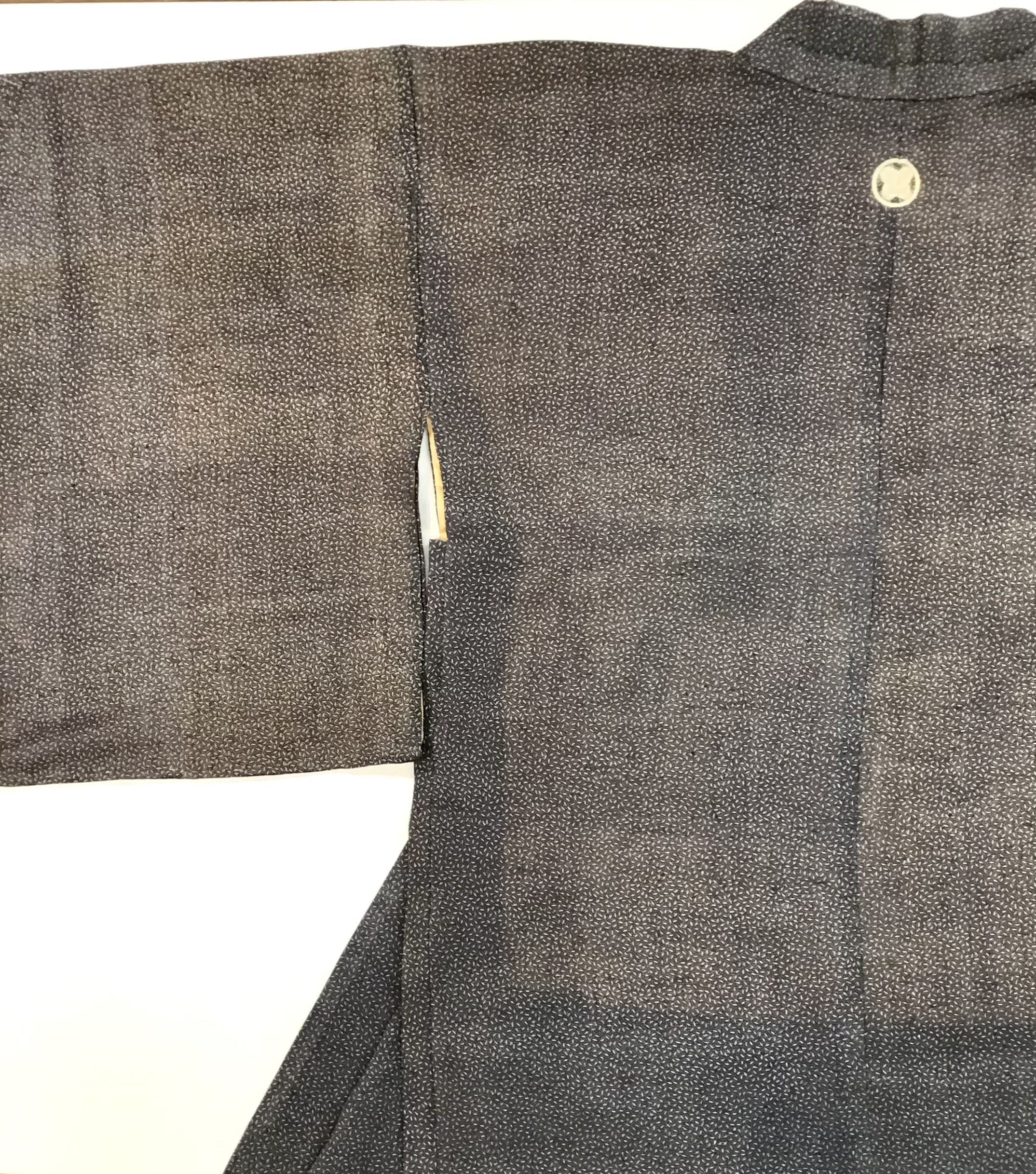 黒地にぼんやり浮かぶ様子が絞り風に丁寧に表現されて、夏の風情が美しい小紋です。
