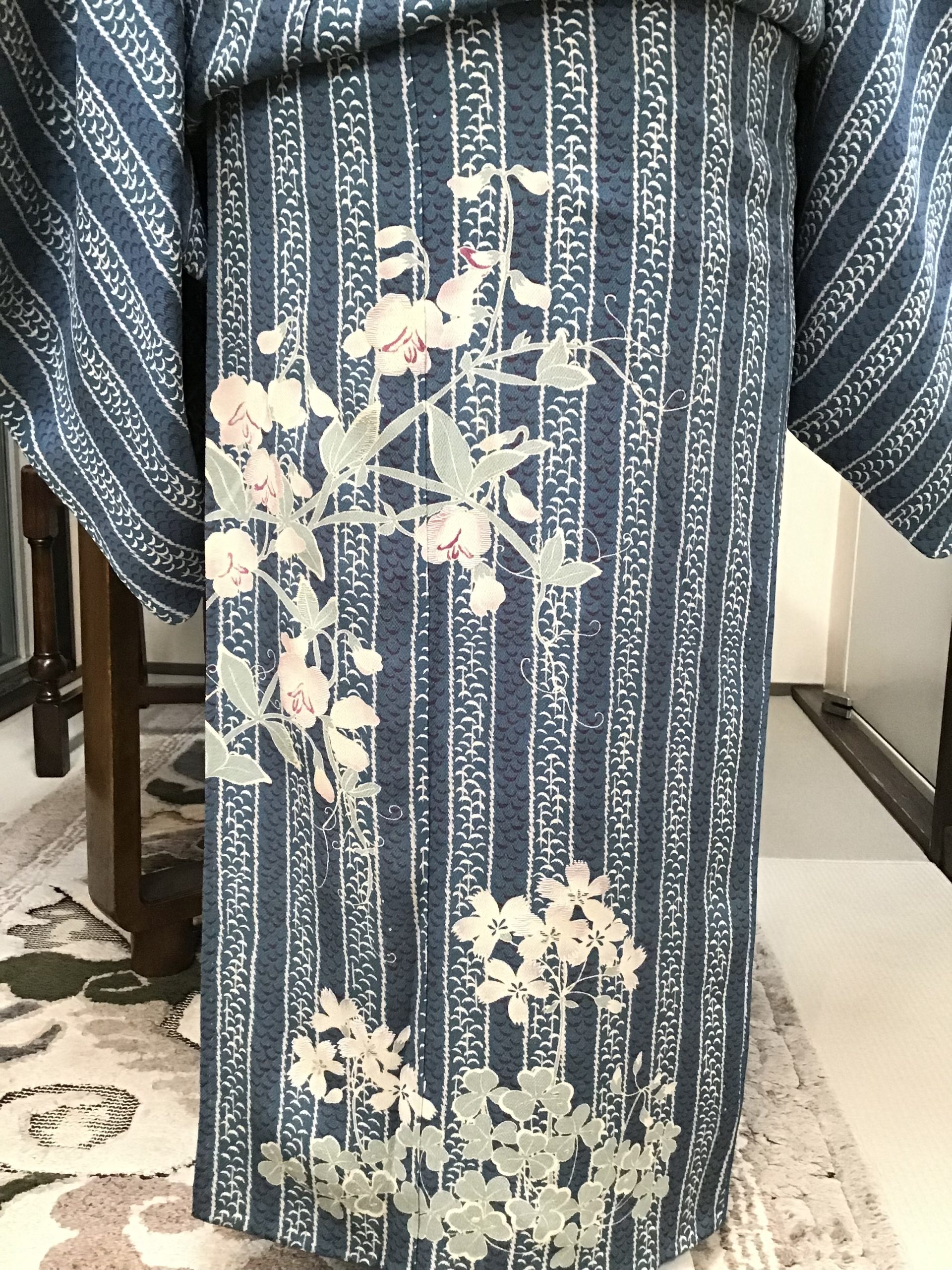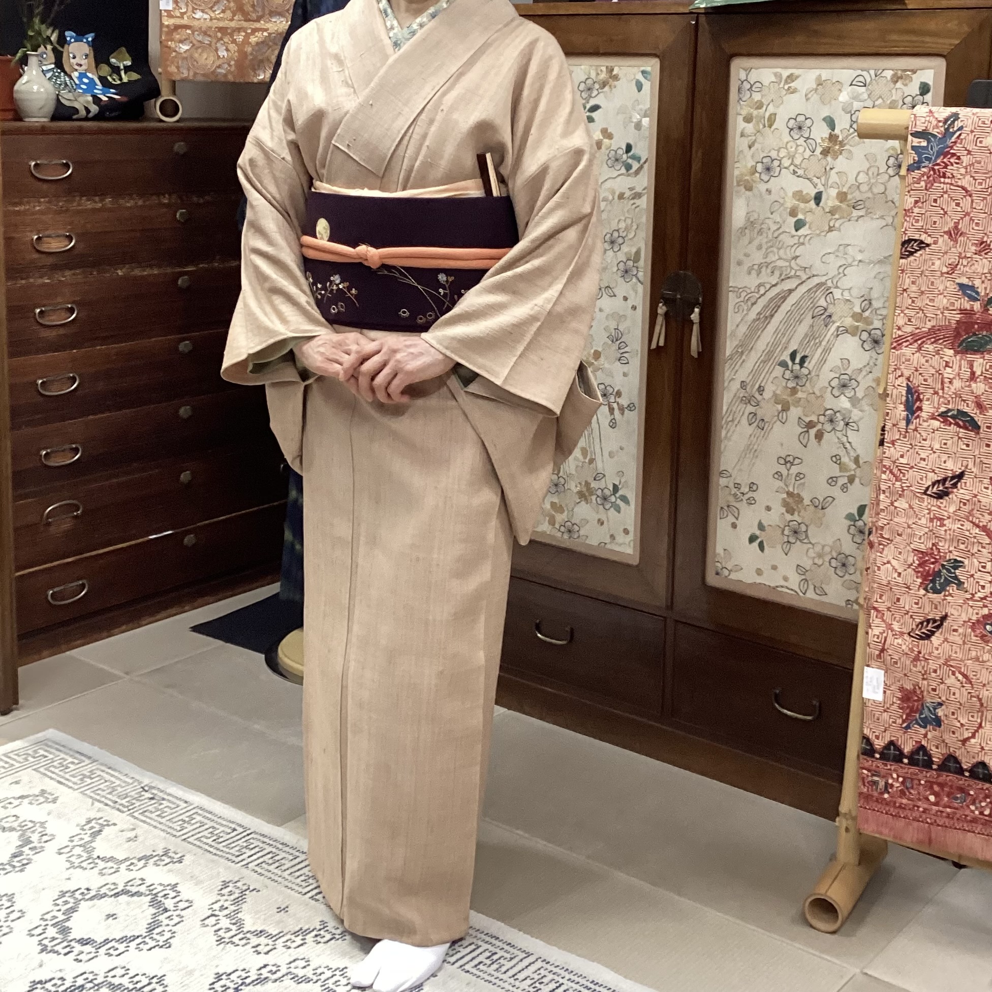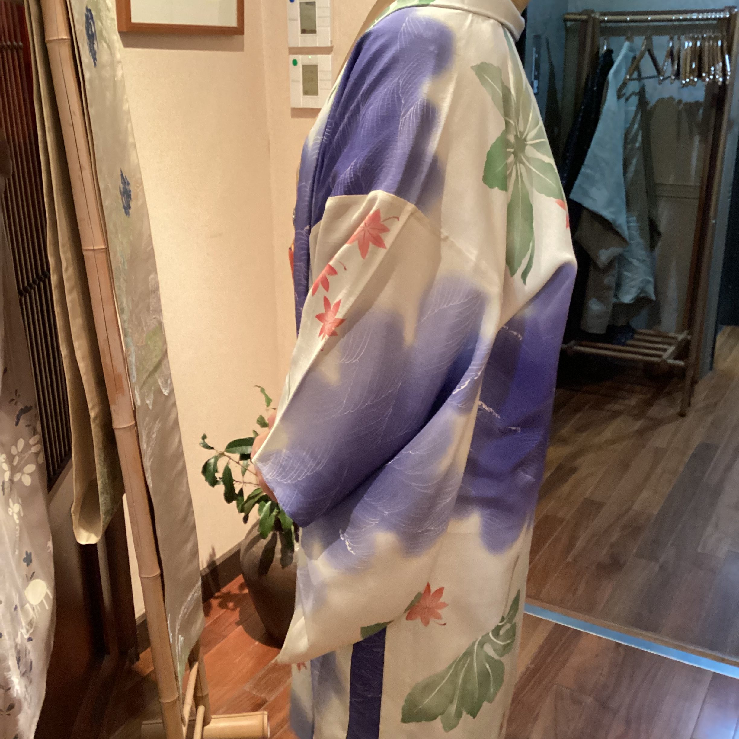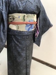 こちらのアンティークの小紋は萩が一面に描かれた単衣。とても細い絹糸で織られた錦紗と呼ばれる着物ですので、軽やか。秋と言っても蒸し暑い最近の気候に身体に優しい着物です。