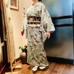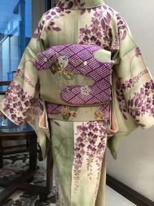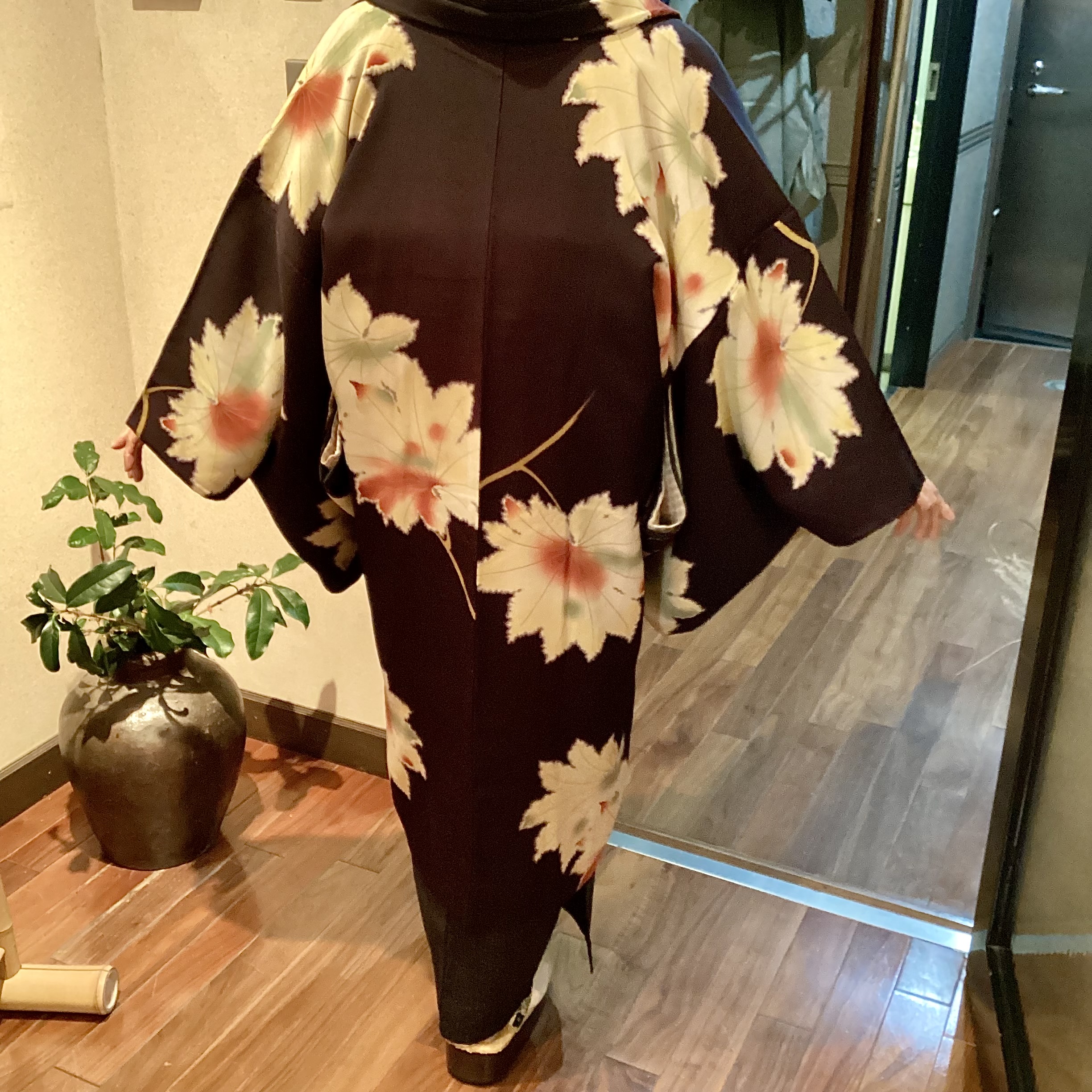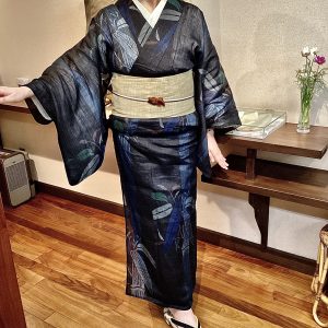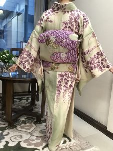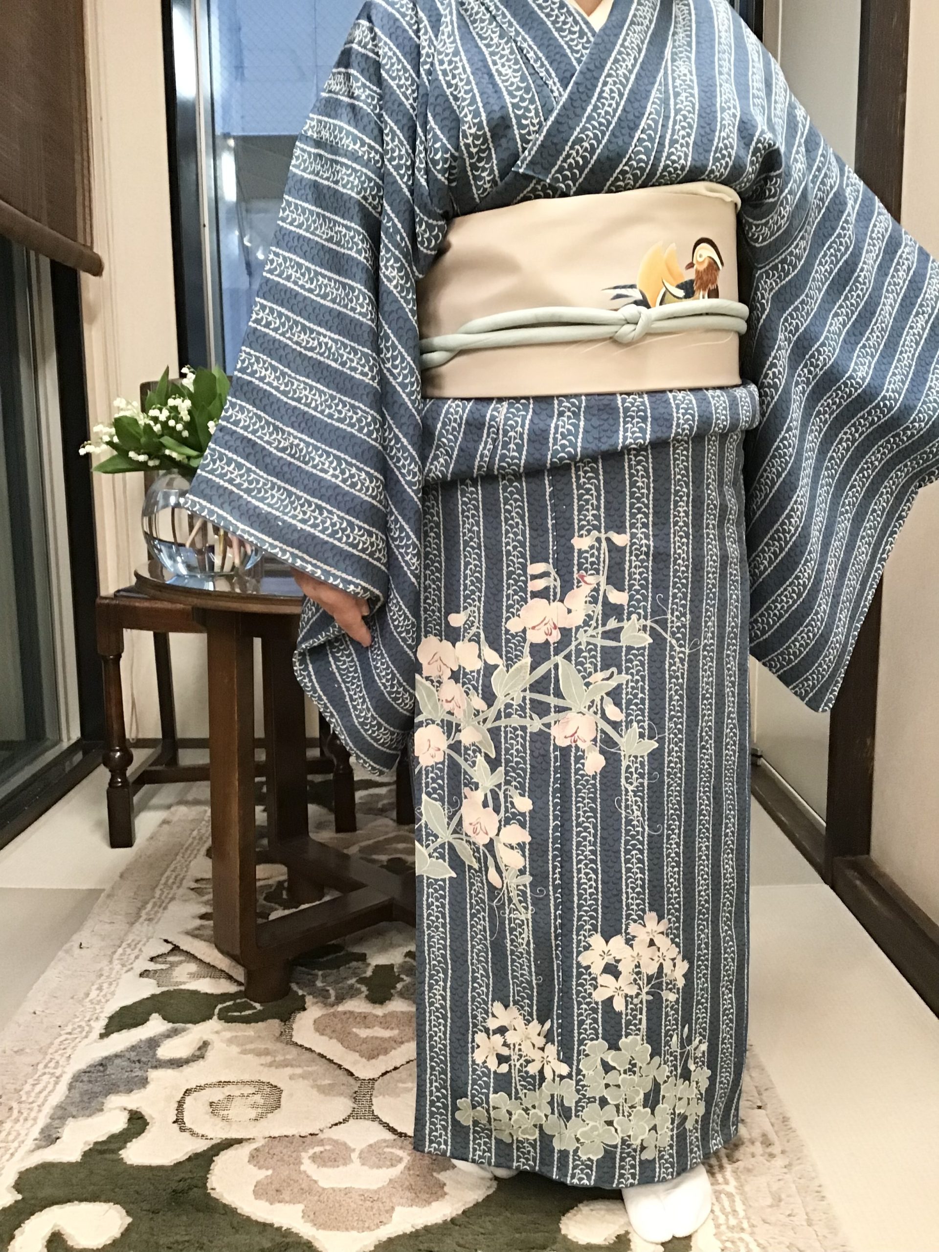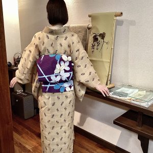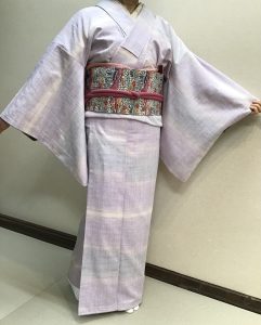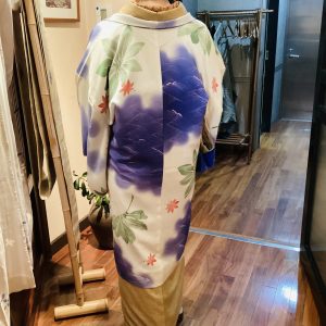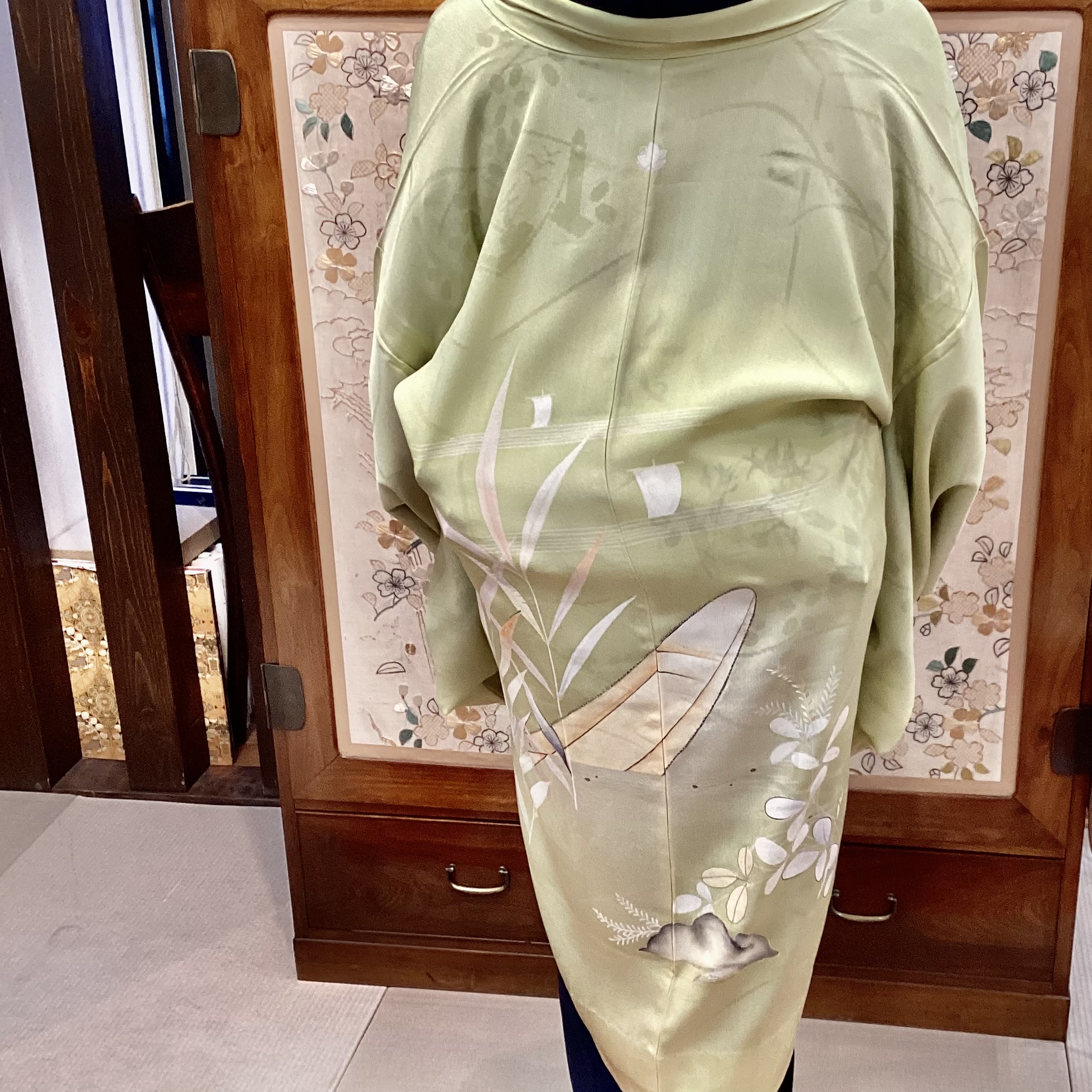 こちらのアンティークの小紋は萩が一面に描かれた単衣。とても細い絹糸で織られた錦紗と呼ばれる着物ですので、軽やか。秋と言っても蒸し暑い最近の気候に身体に優しい着物です。
