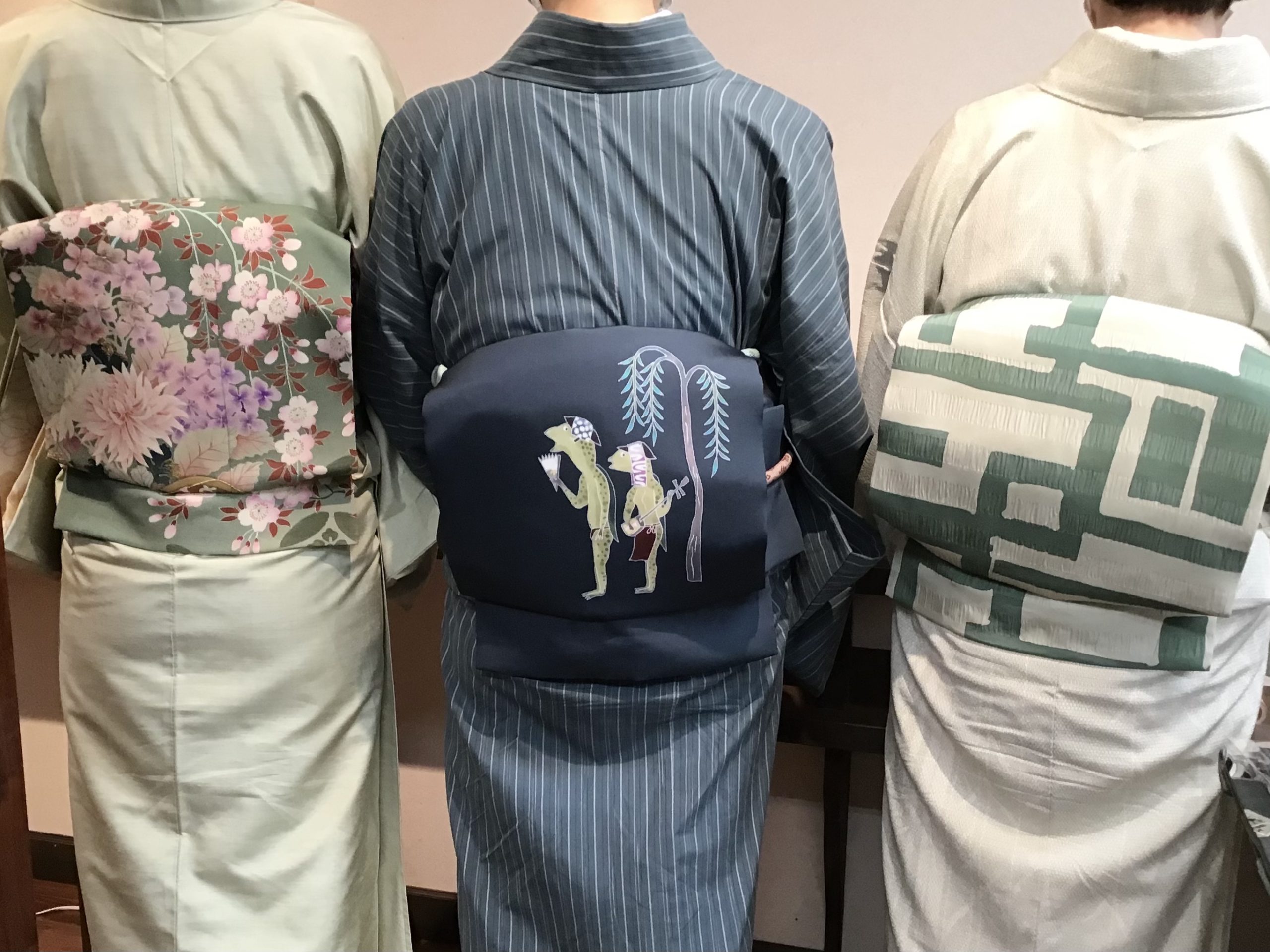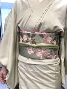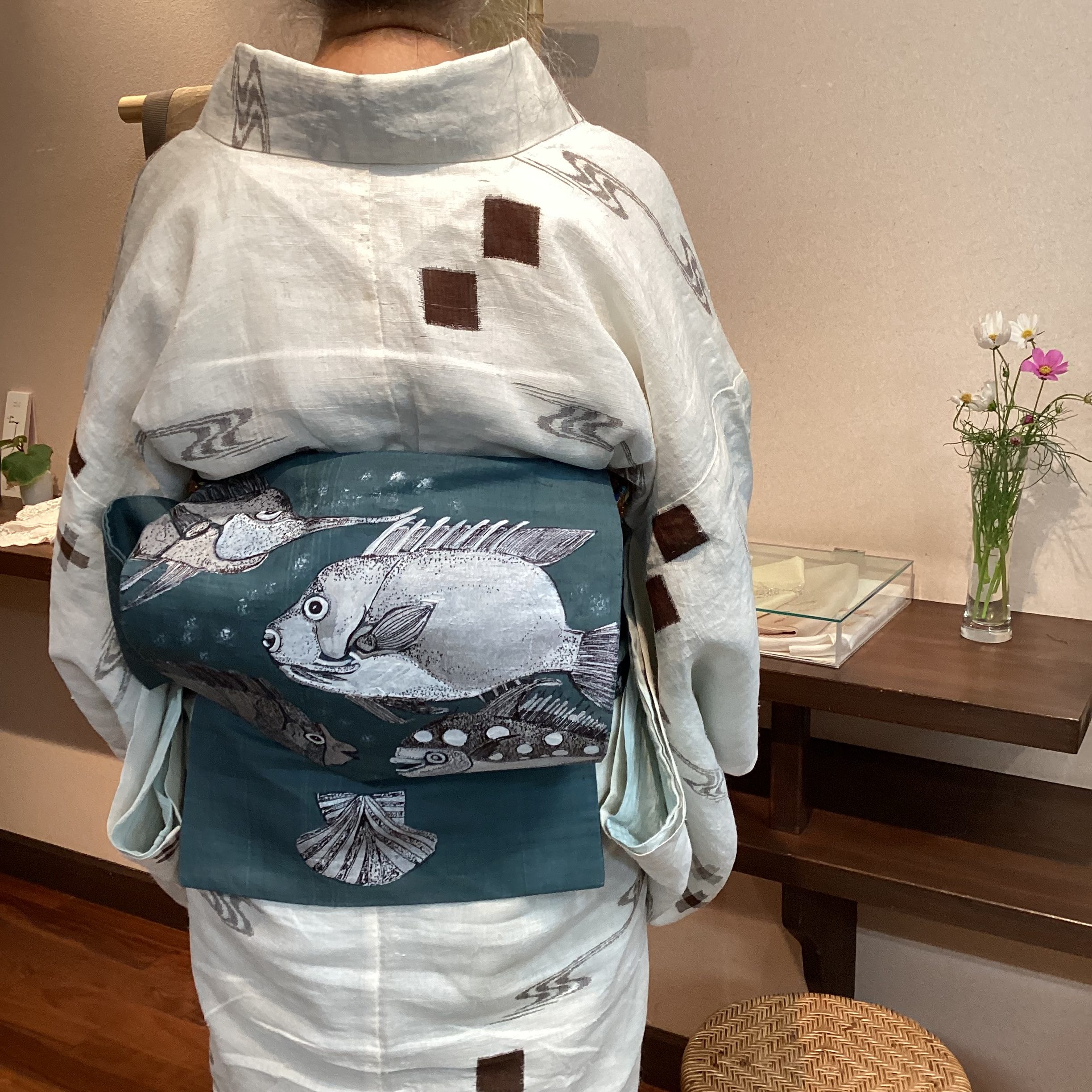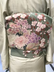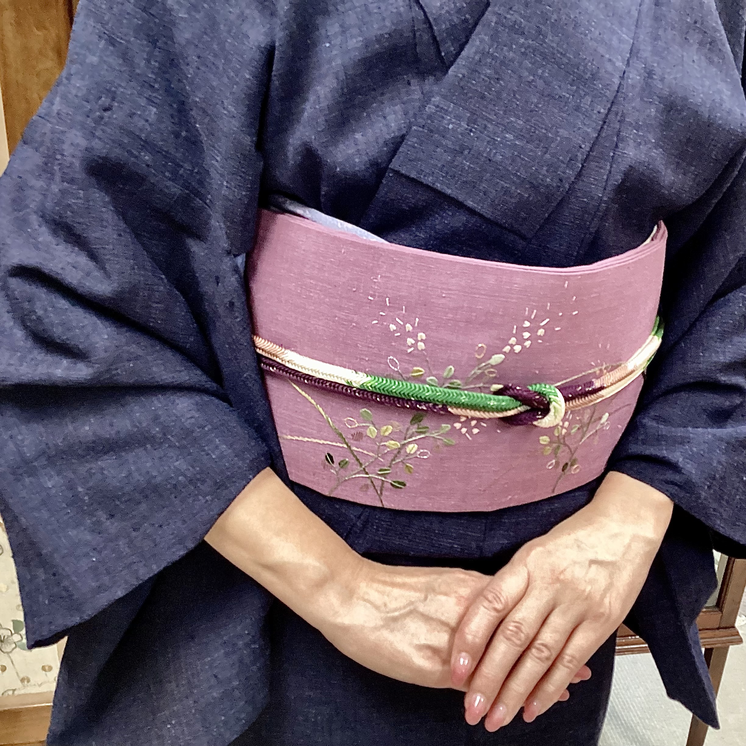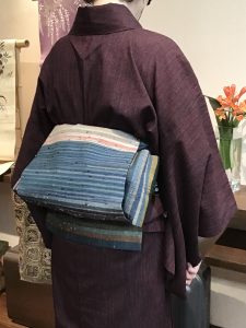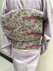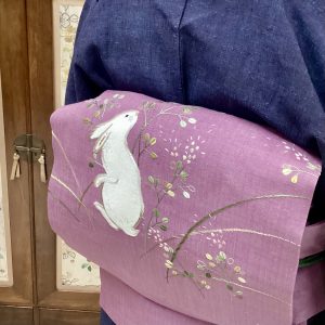 灯屋2オリジナルのうさぎのコラージュとススキと萩が刺繍された帯を合わせられました。少し青みがかったピンク色の紬地の帯は優しい雰囲気。