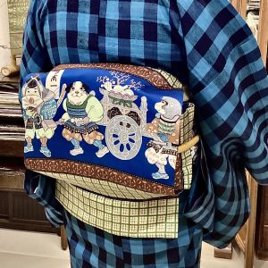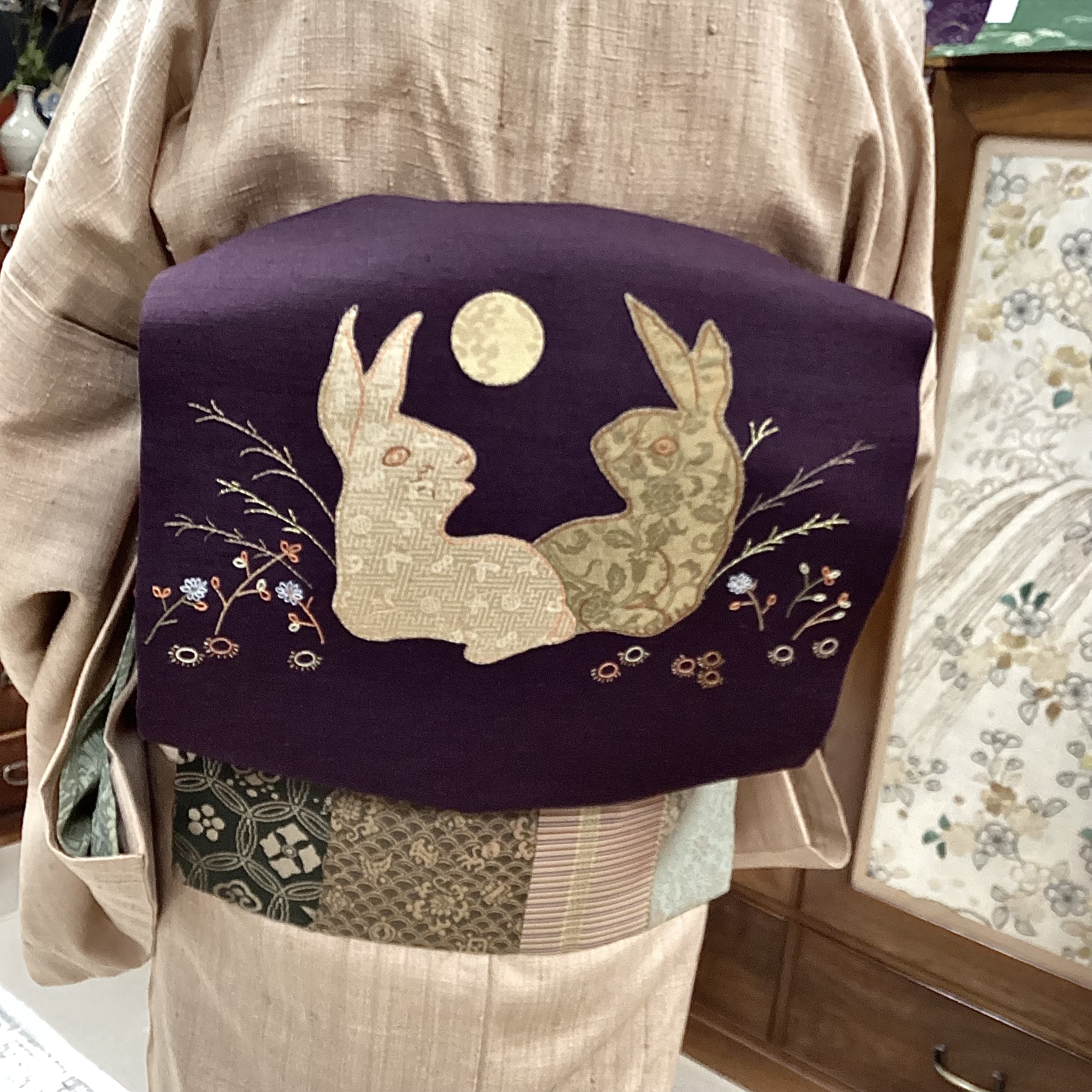 次にご紹介するのもやはり灯屋2オリジナルのコラージュ帯。2匹の月見うさぎと垂れは名物裂をはじめとする古布で拵えました。
