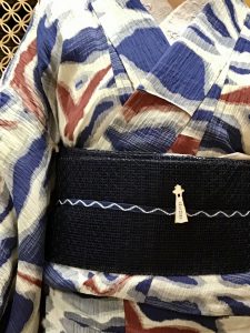 波の地紋様にカモメが織られた錦紗の単衣に合わせる帯をご希望頂き、灯屋2オリジナルの刺繍帯をお仕立てさせて頂きました。出来上がりまでには、お時間を頂戴いたしましたが、帯の地色をお着物に、ヨットの色や大きさをお召しになる方に合わせて決めました。