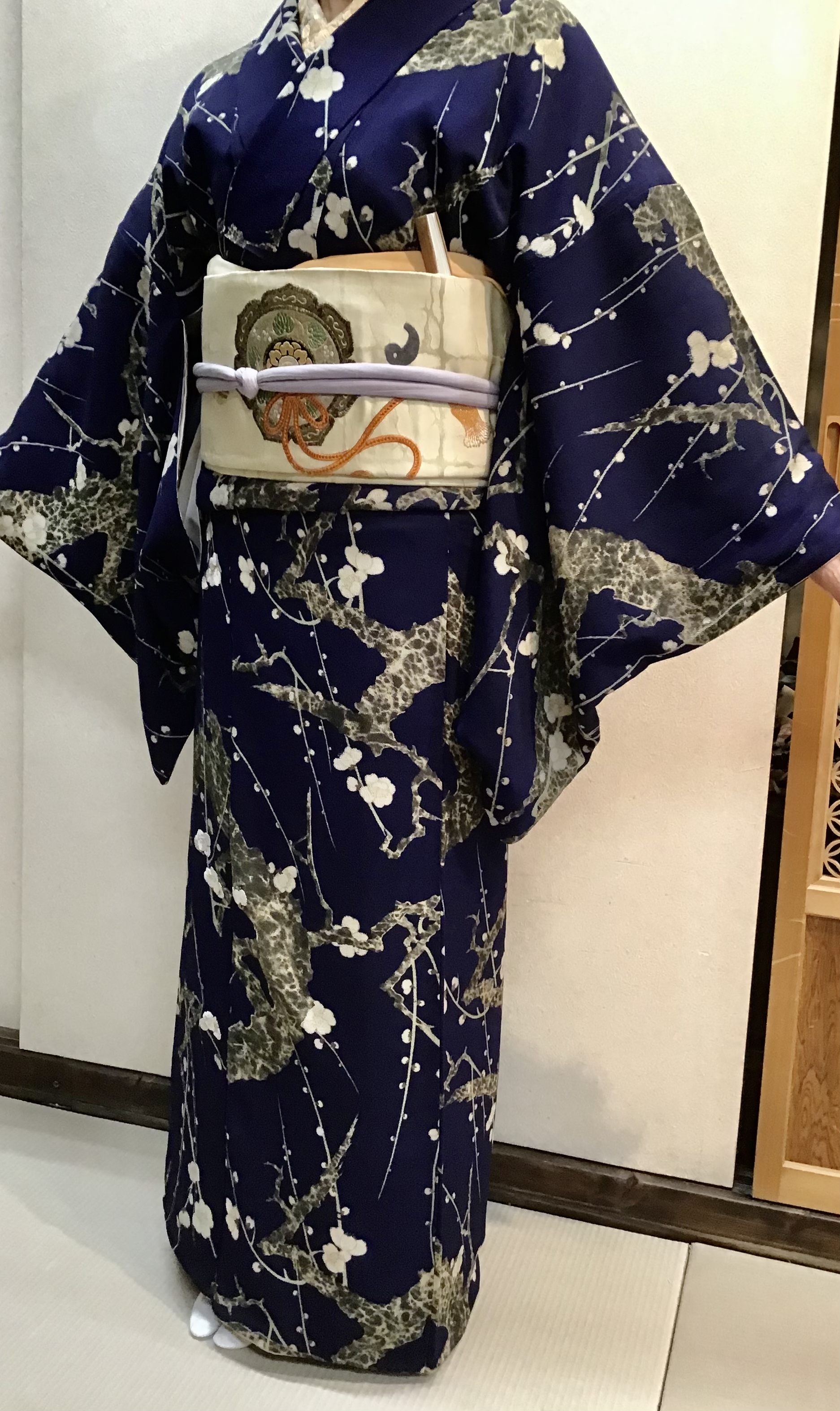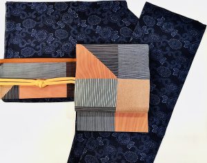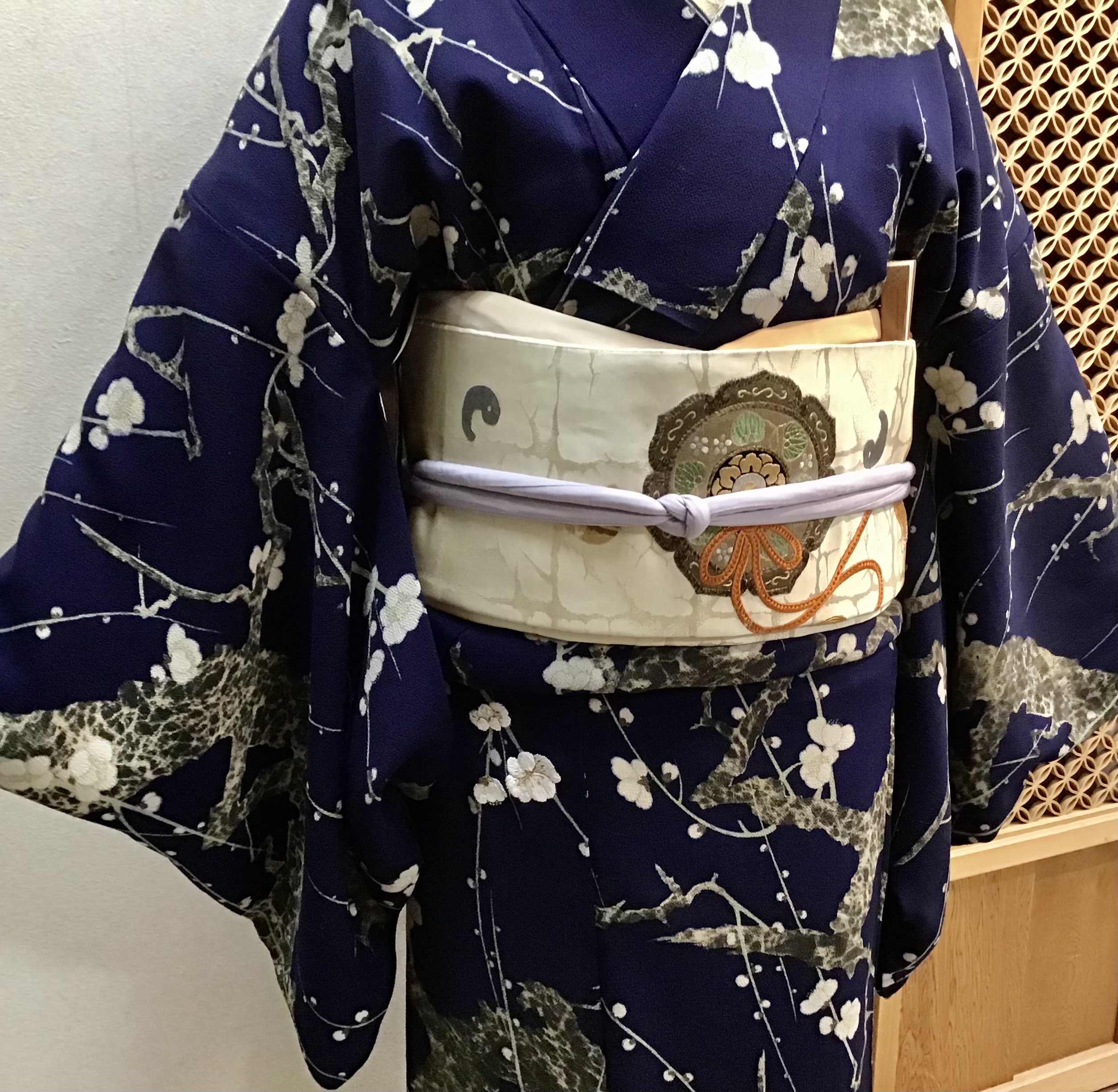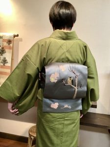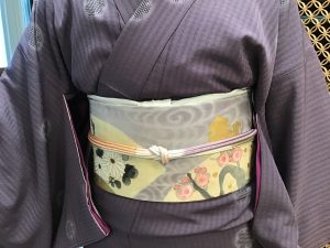 今回合わせた帯は、横段地に梅の花が飛び柄で型染めされた名古屋帯です。