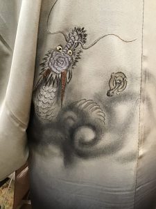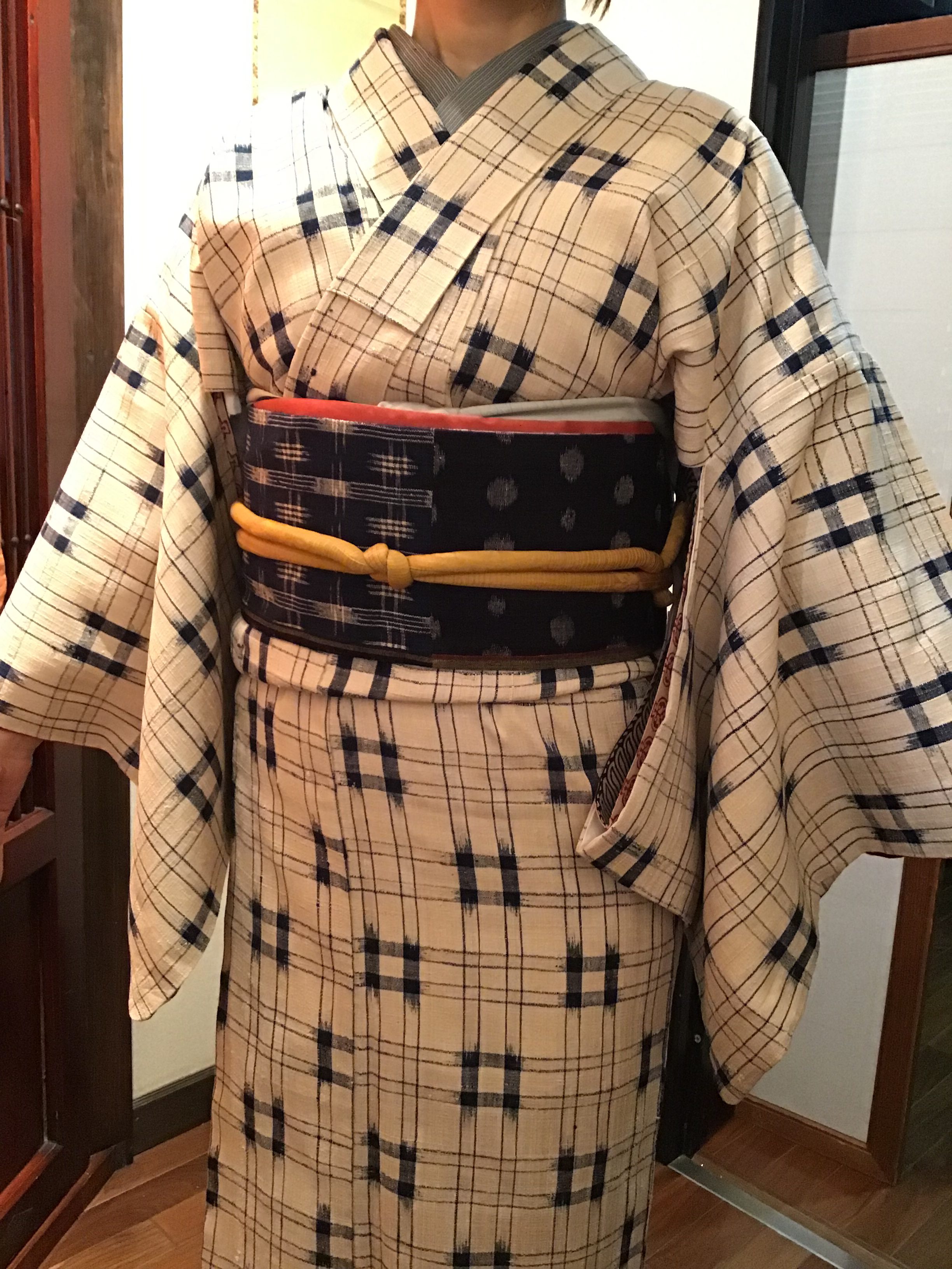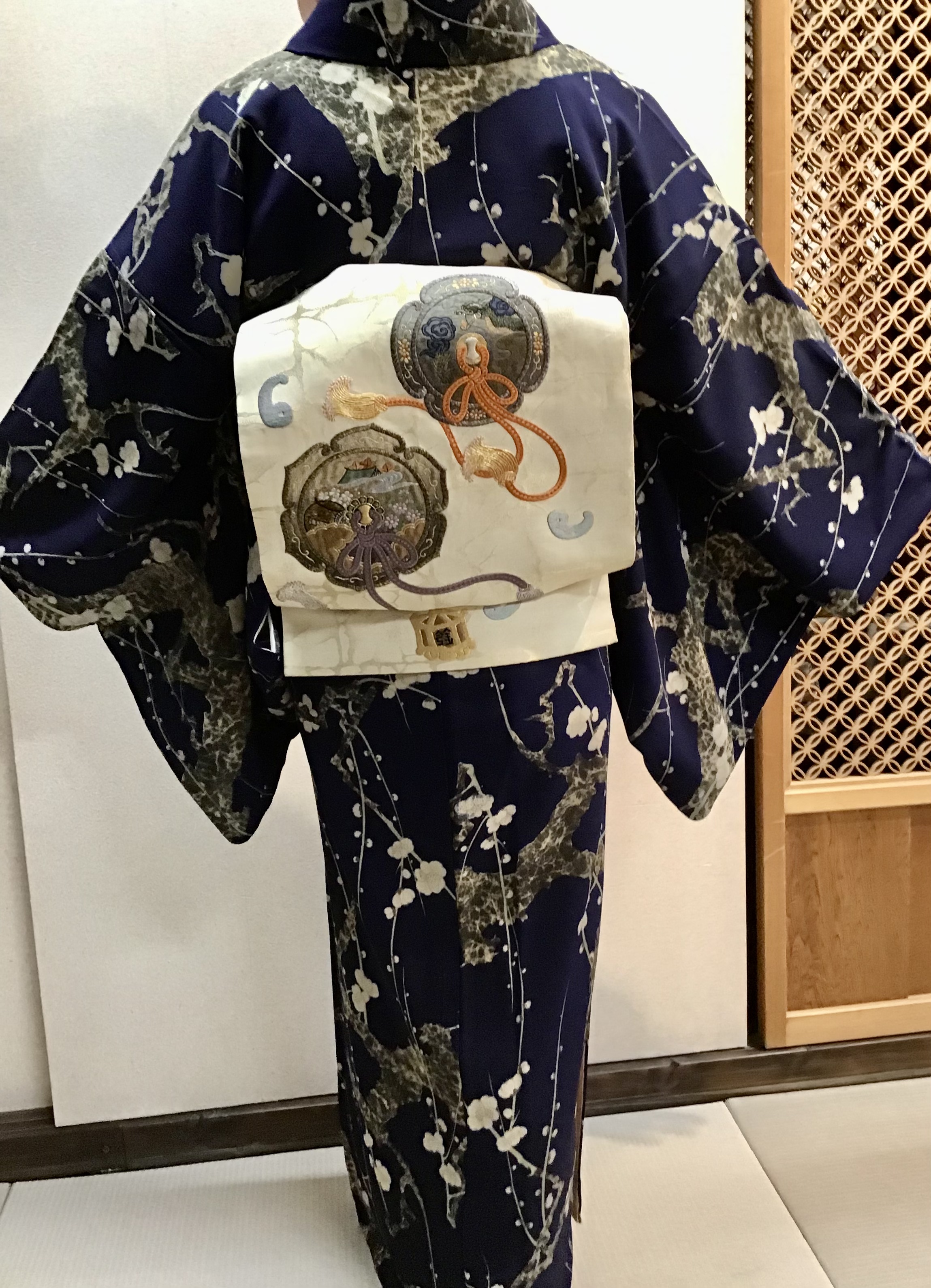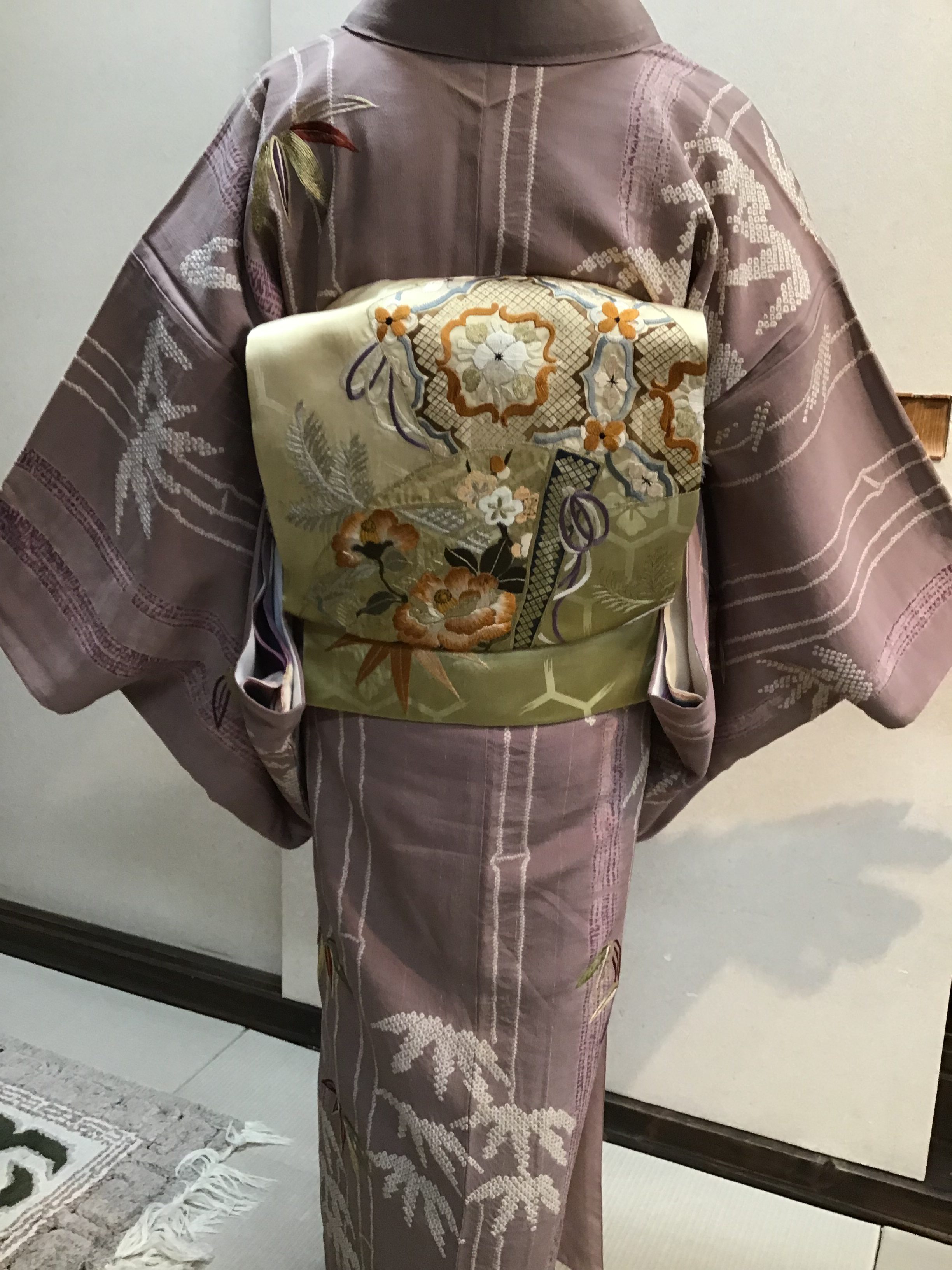 今回合わせた帯は、横段地に梅の花が飛び柄で型染めされた名古屋帯です。