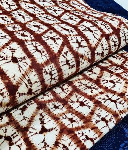 コーディネートのご紹介は、藍染の着物に茜絞りの名古屋帯です。