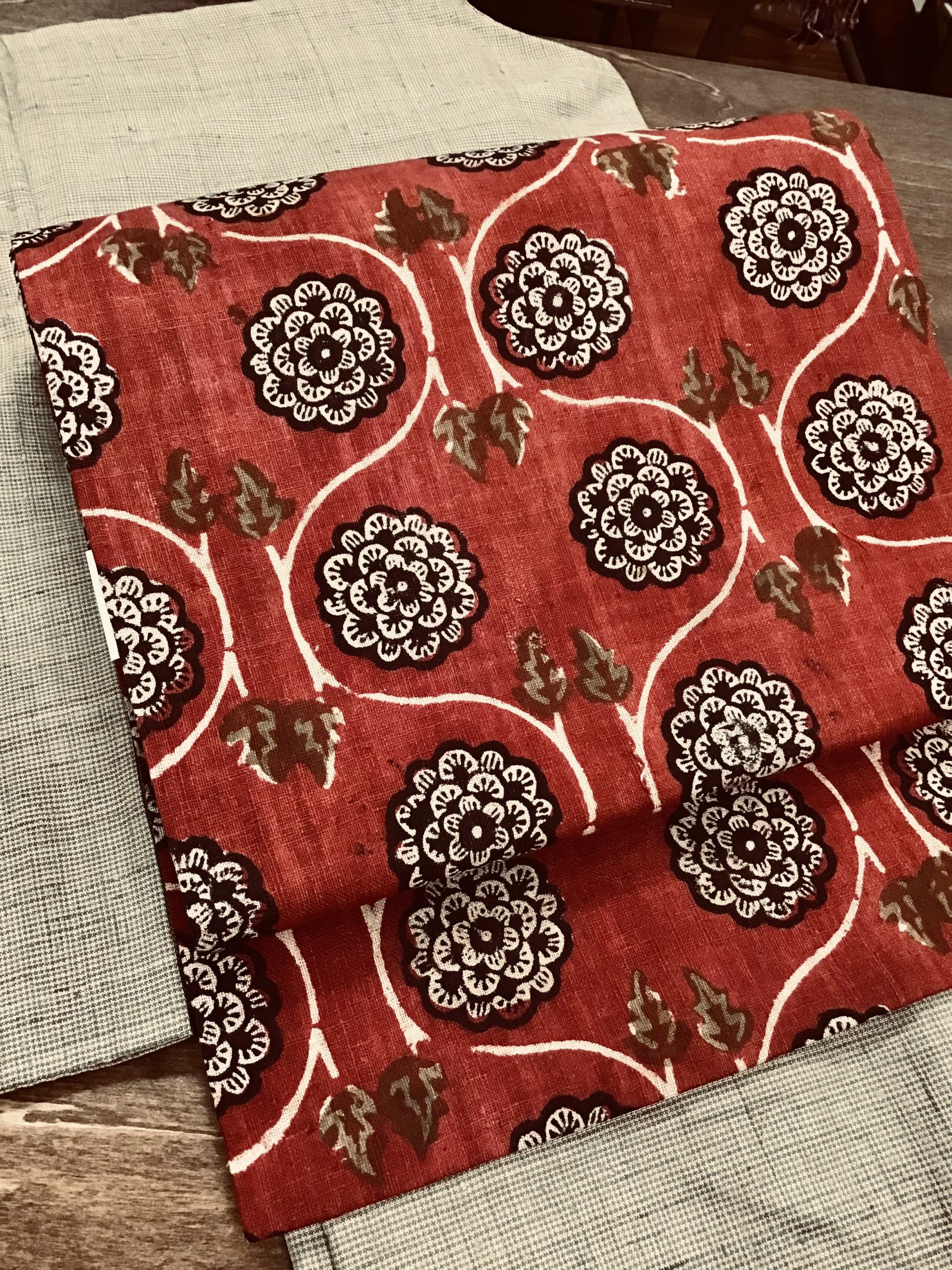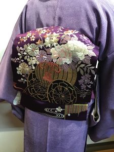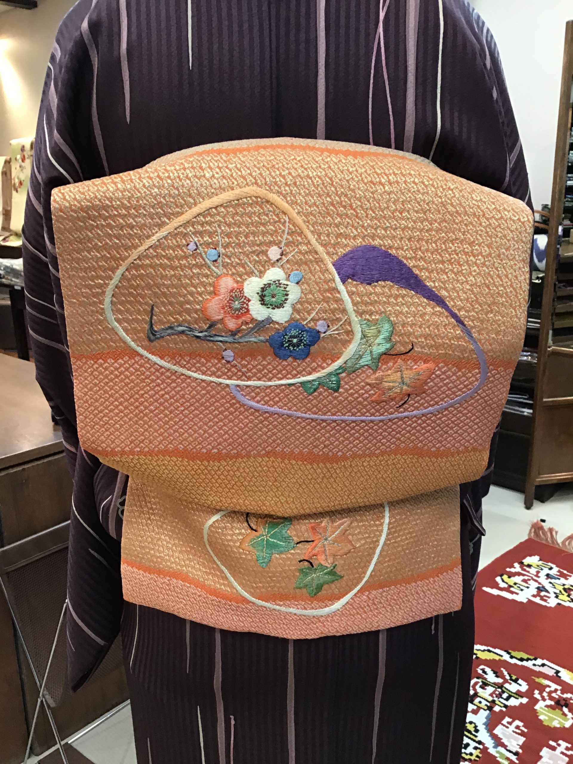 今では、もうなくなってしまった纐纈織りに貝合わせを刺繍した帯、梅や青楓が、美しい。