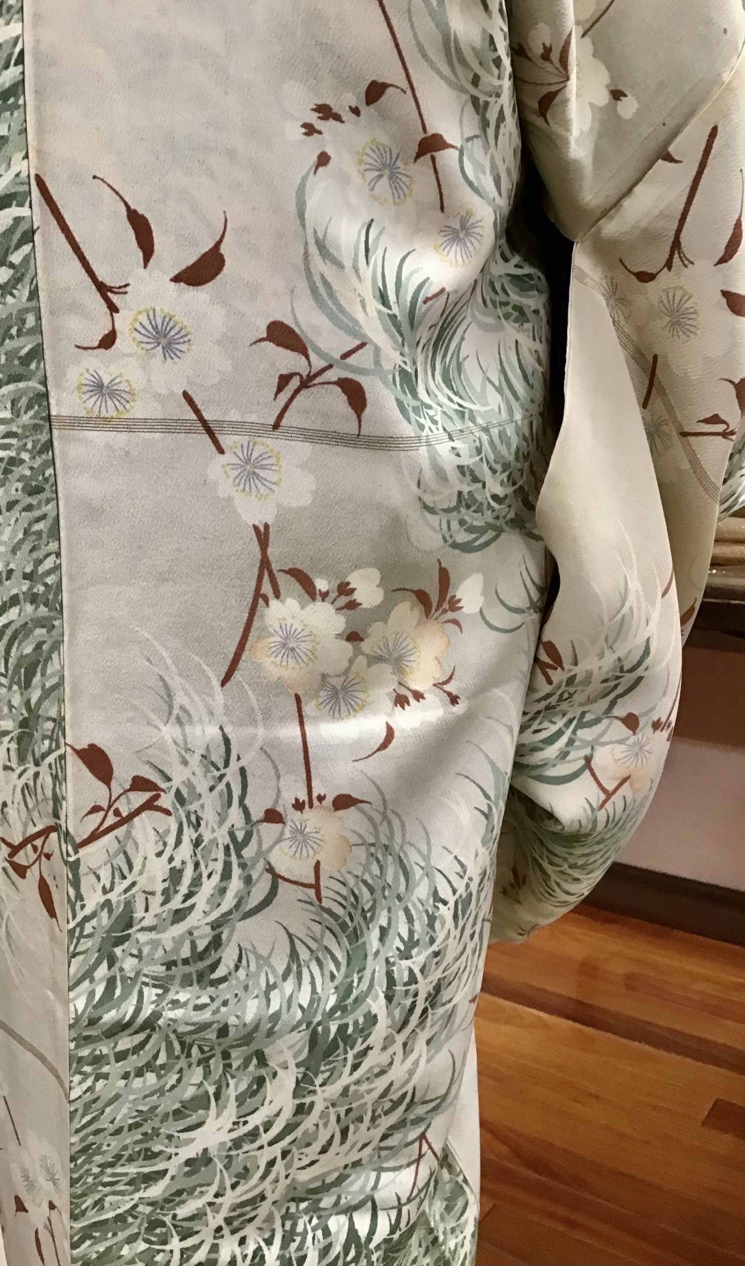 思わず見惚れる風景が、品の良い地色に染めと刺繍で表現された美しいお着物です。
