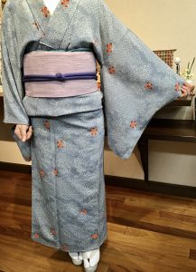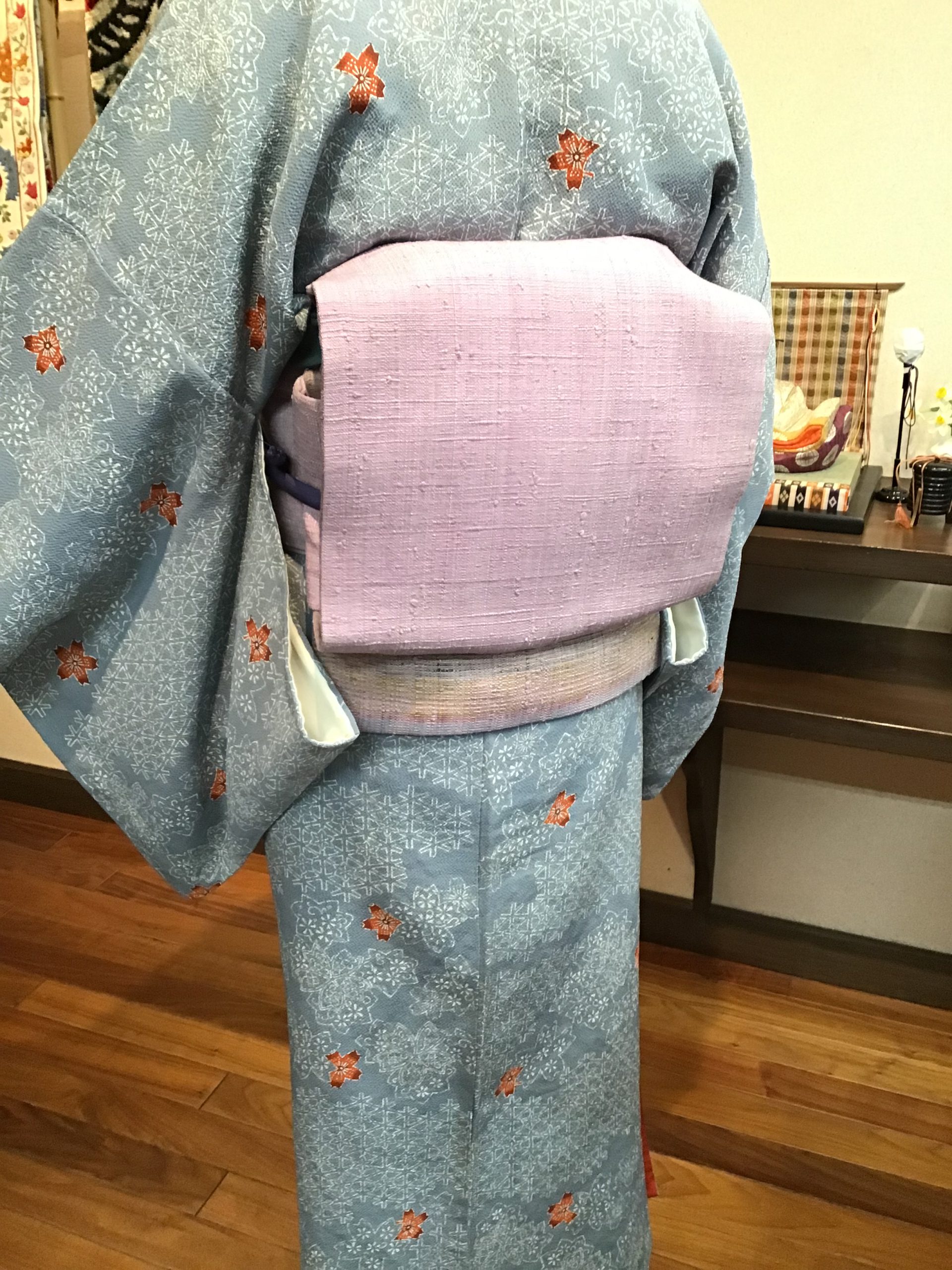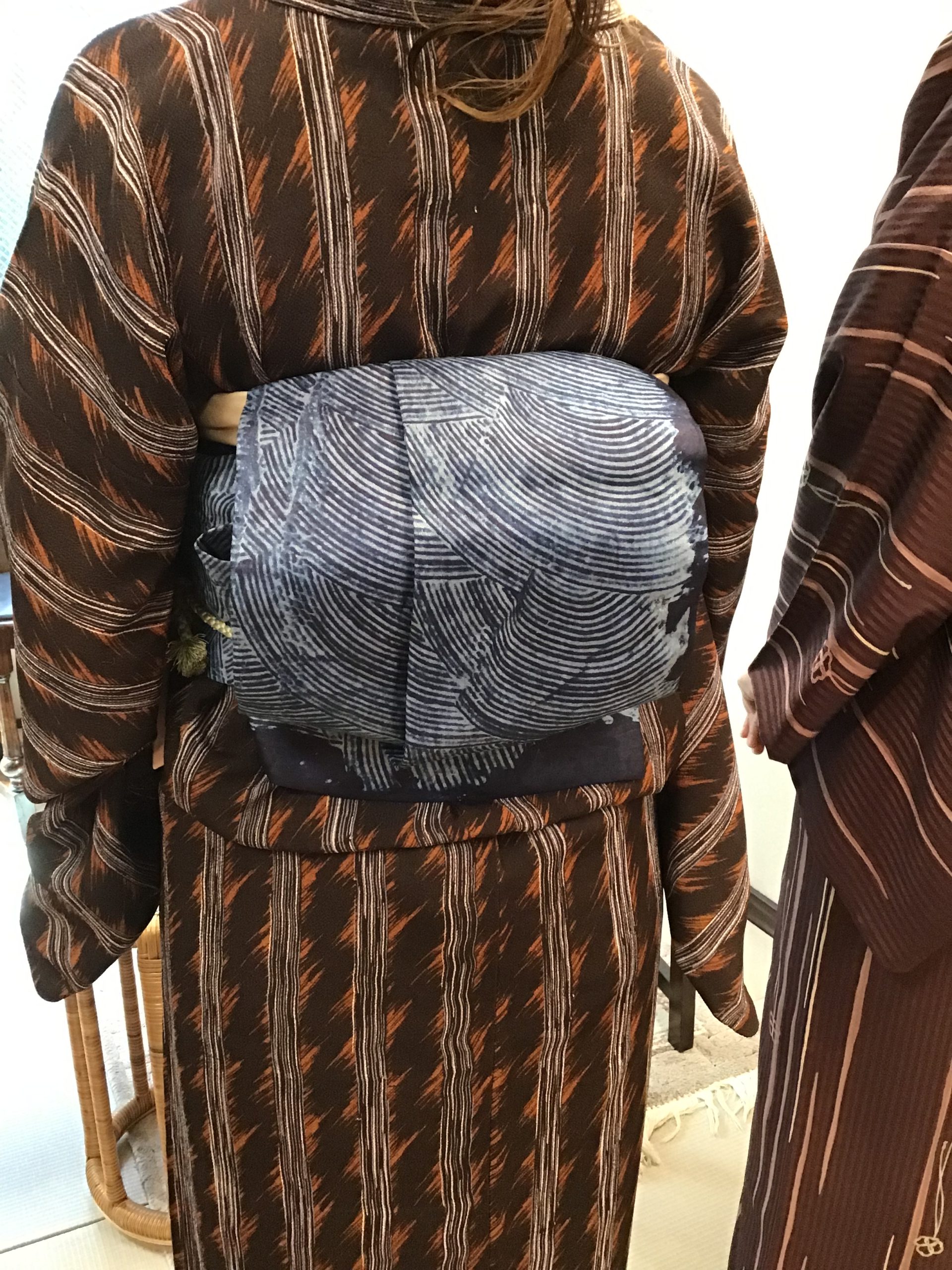 縮緬の小紋に半幅帯を割り太鼓に結んで、帯は、アフリカの藍染めです。