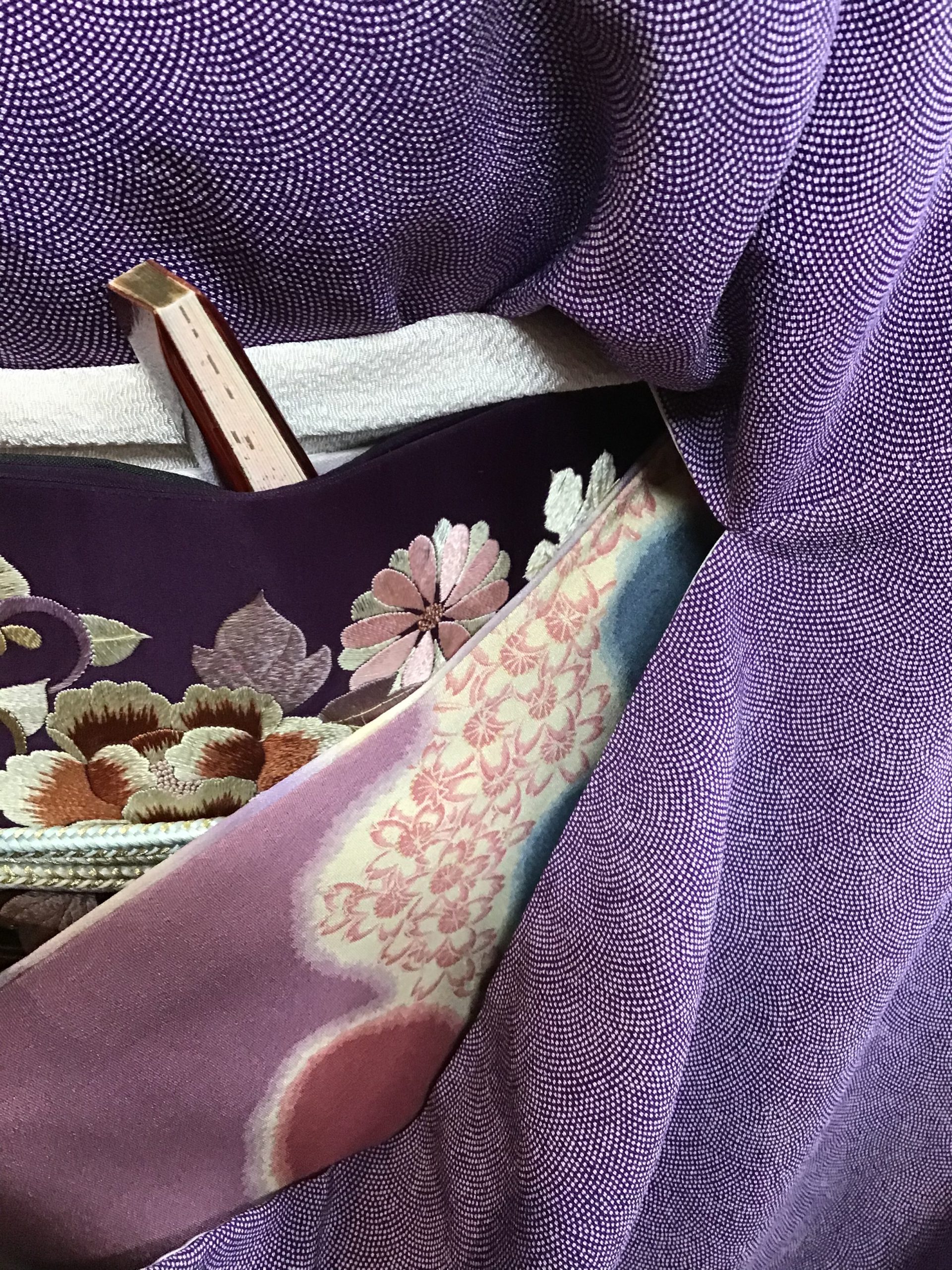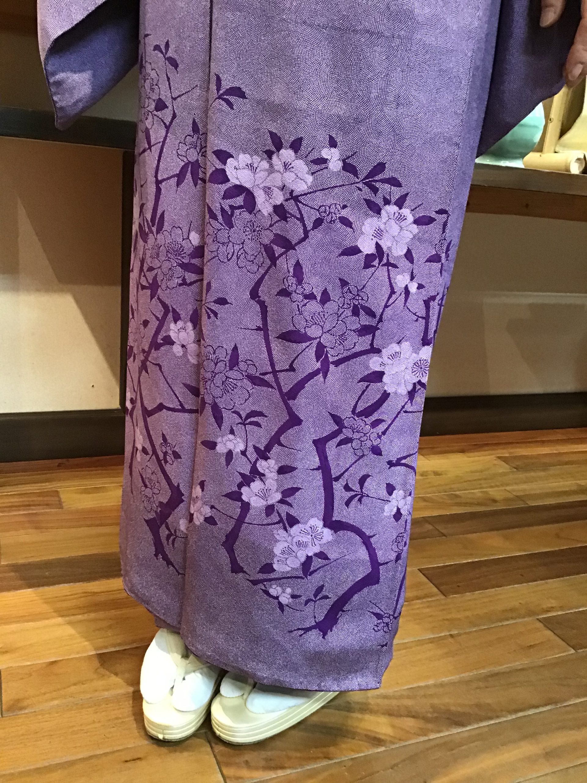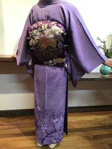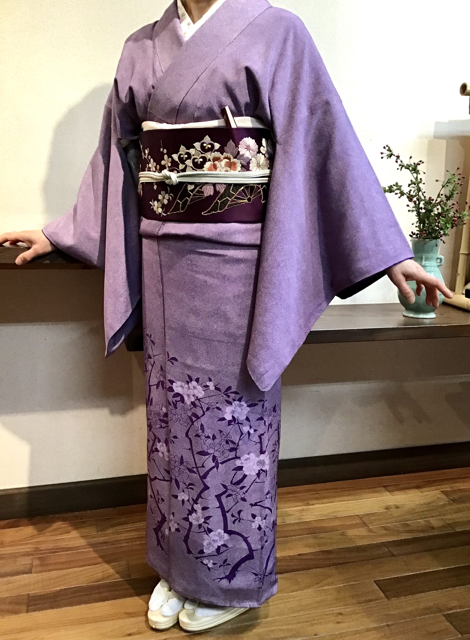 小宮康孝作桜の付下げと刺繍帯、白に紫で染められた江戸小紋の上に咲いた桜が、華やかな美しさを奏でています。