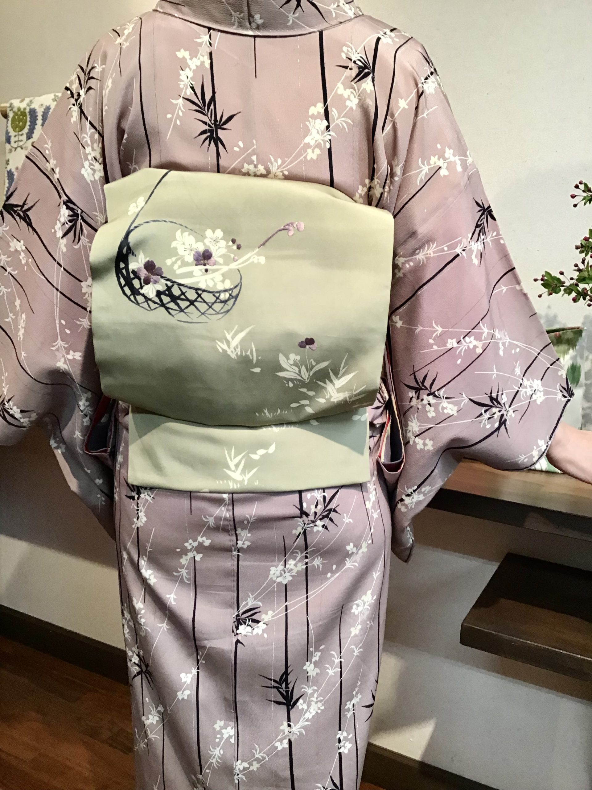 蕨の籠と可愛らしいスミレ、珍しい染め帯ですね。
