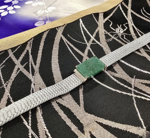 帯揚は、薄い絽のグリーン、丸ぐけは、絽の抹茶色にしました。