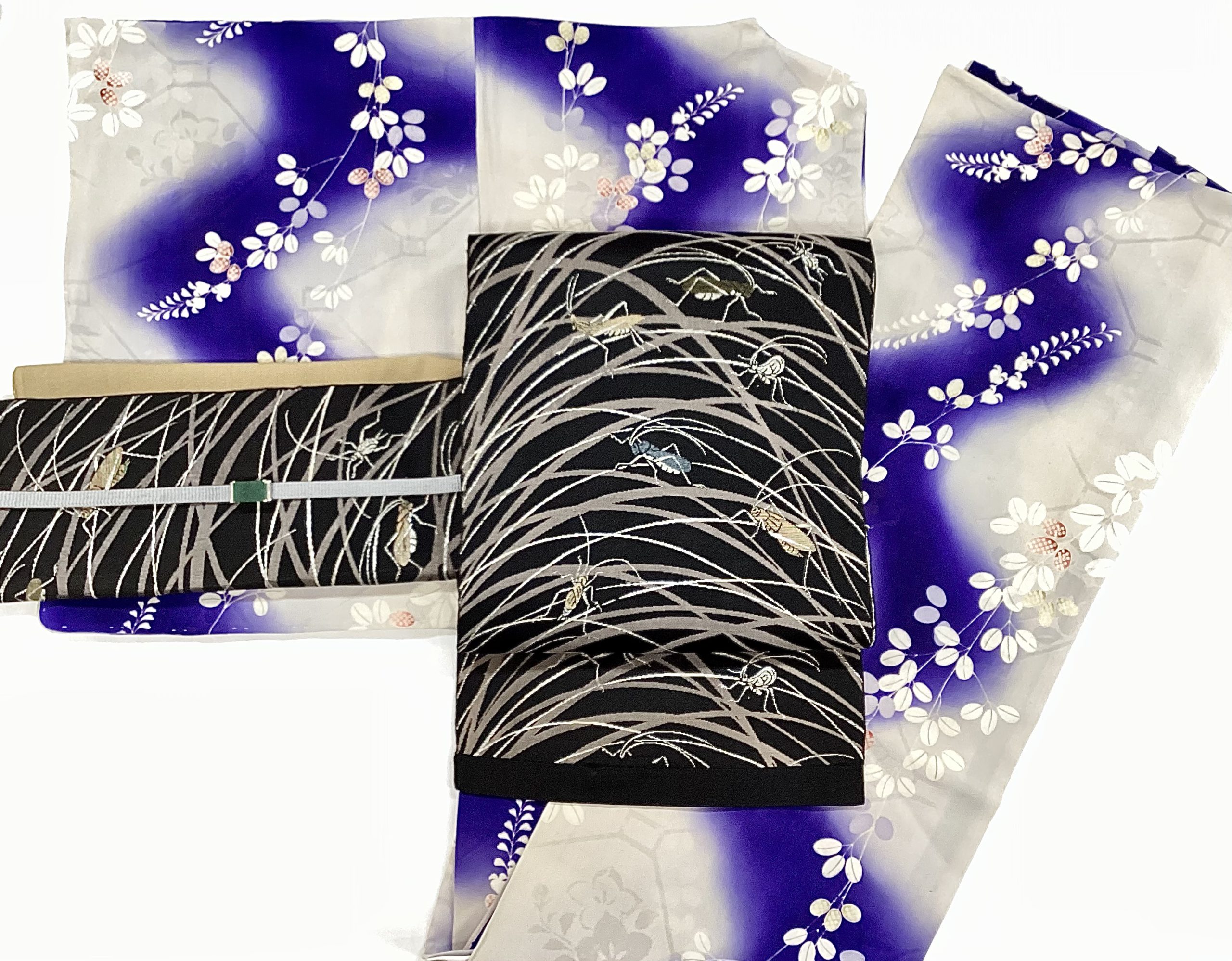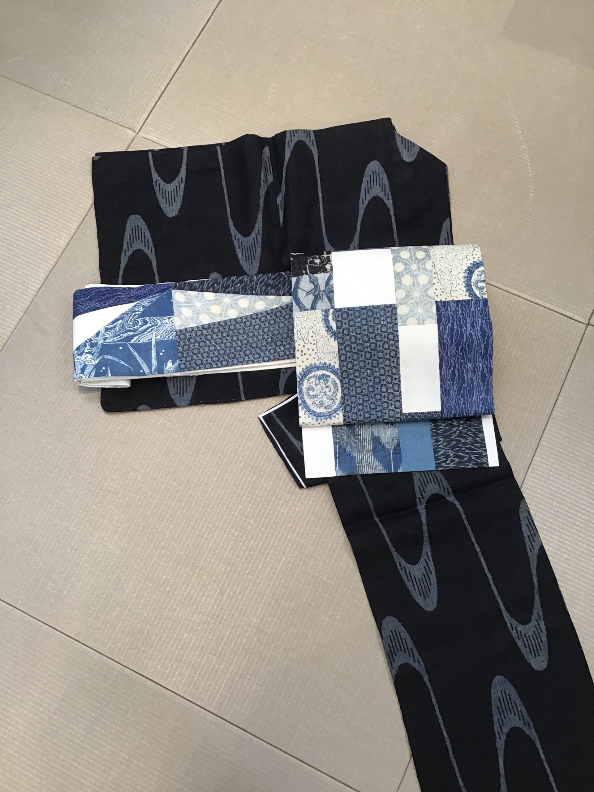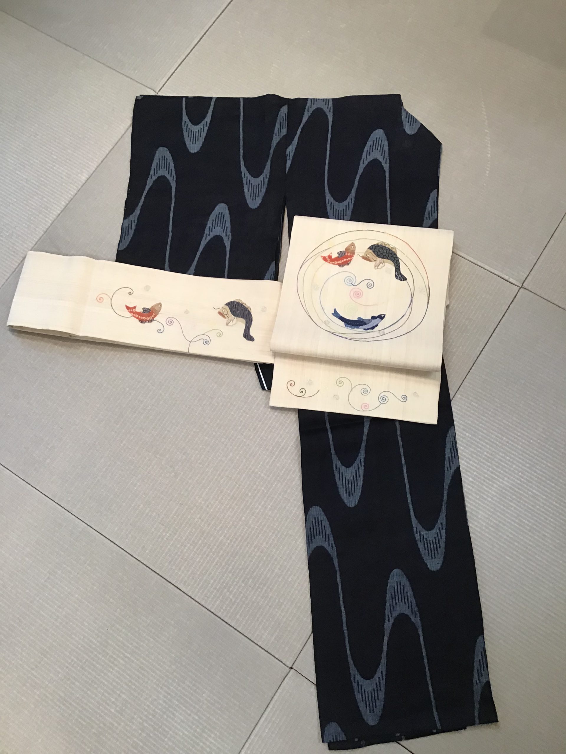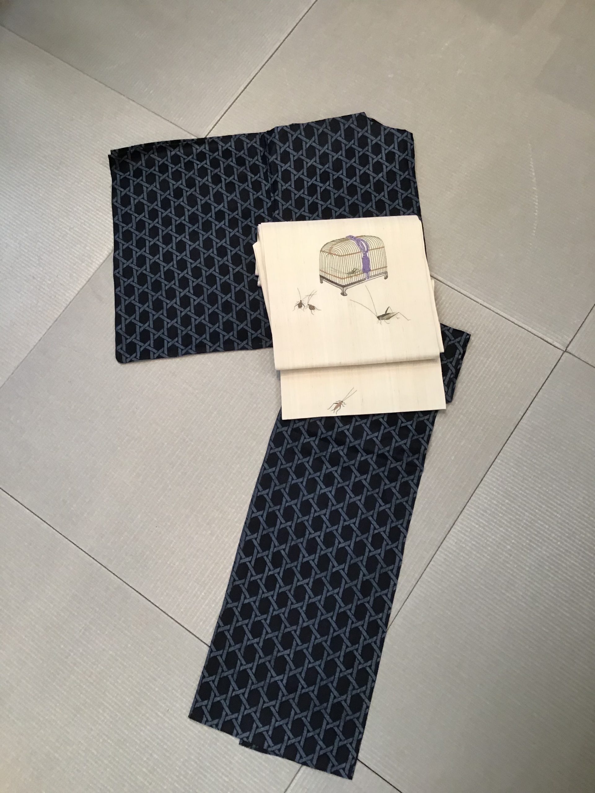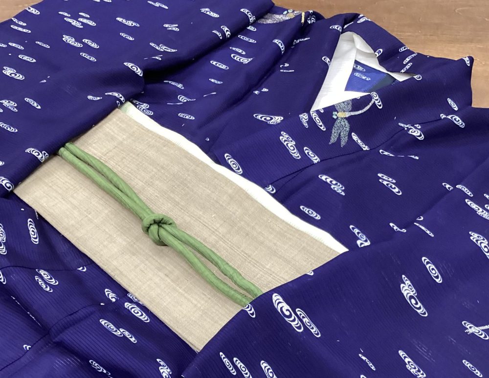 絽の紺地に、いろいろなサイズの観世水が染められて、それだけでも涼しさを感じます。