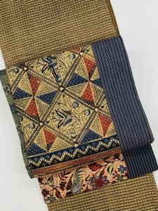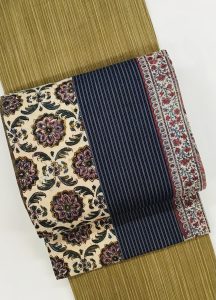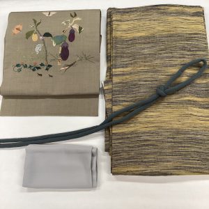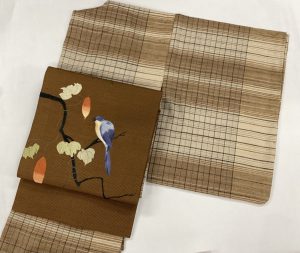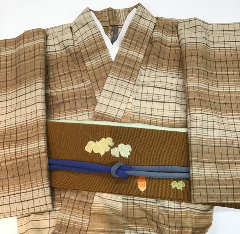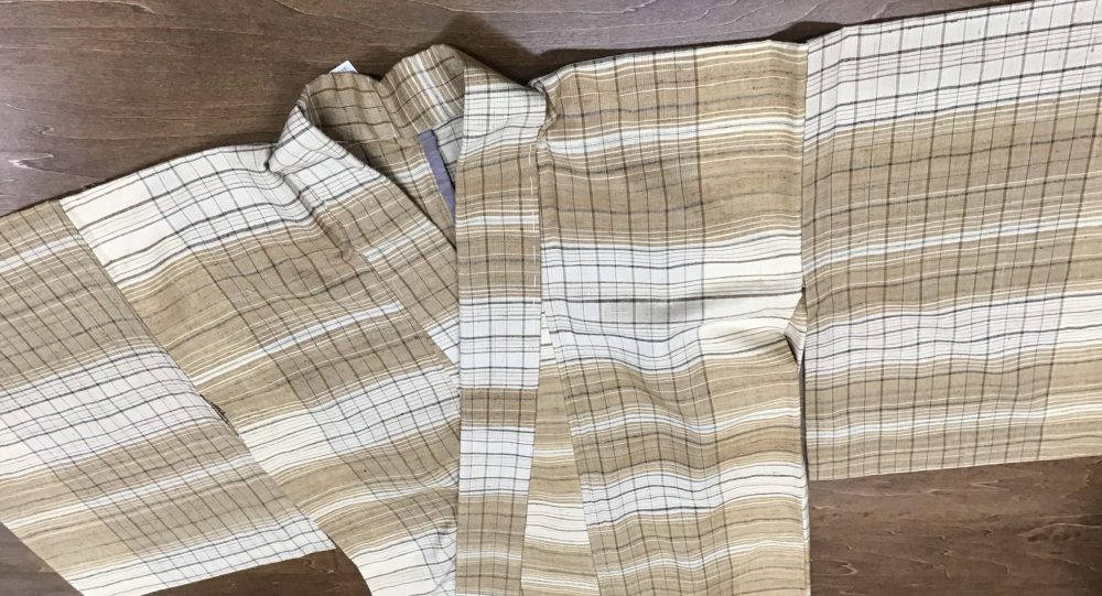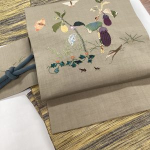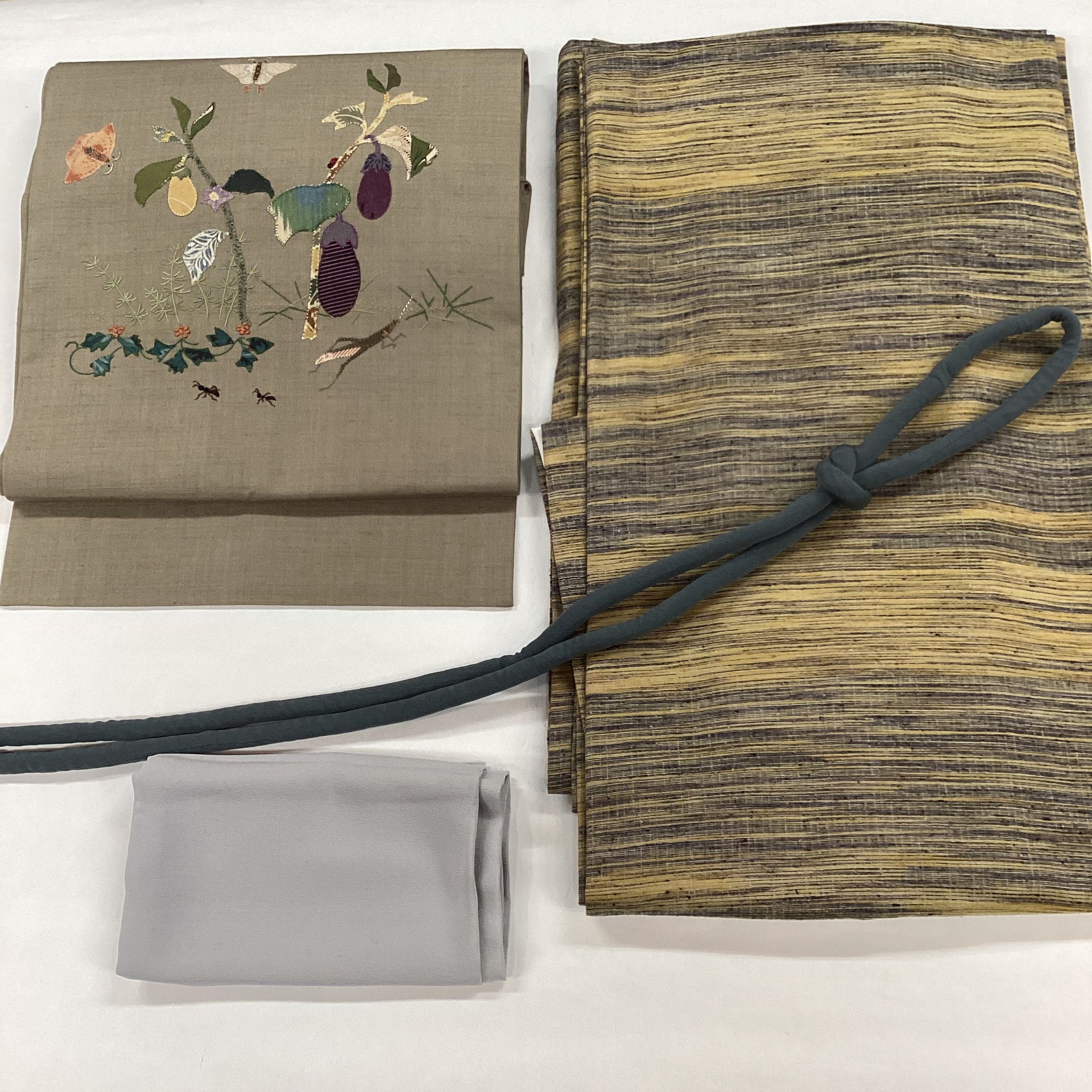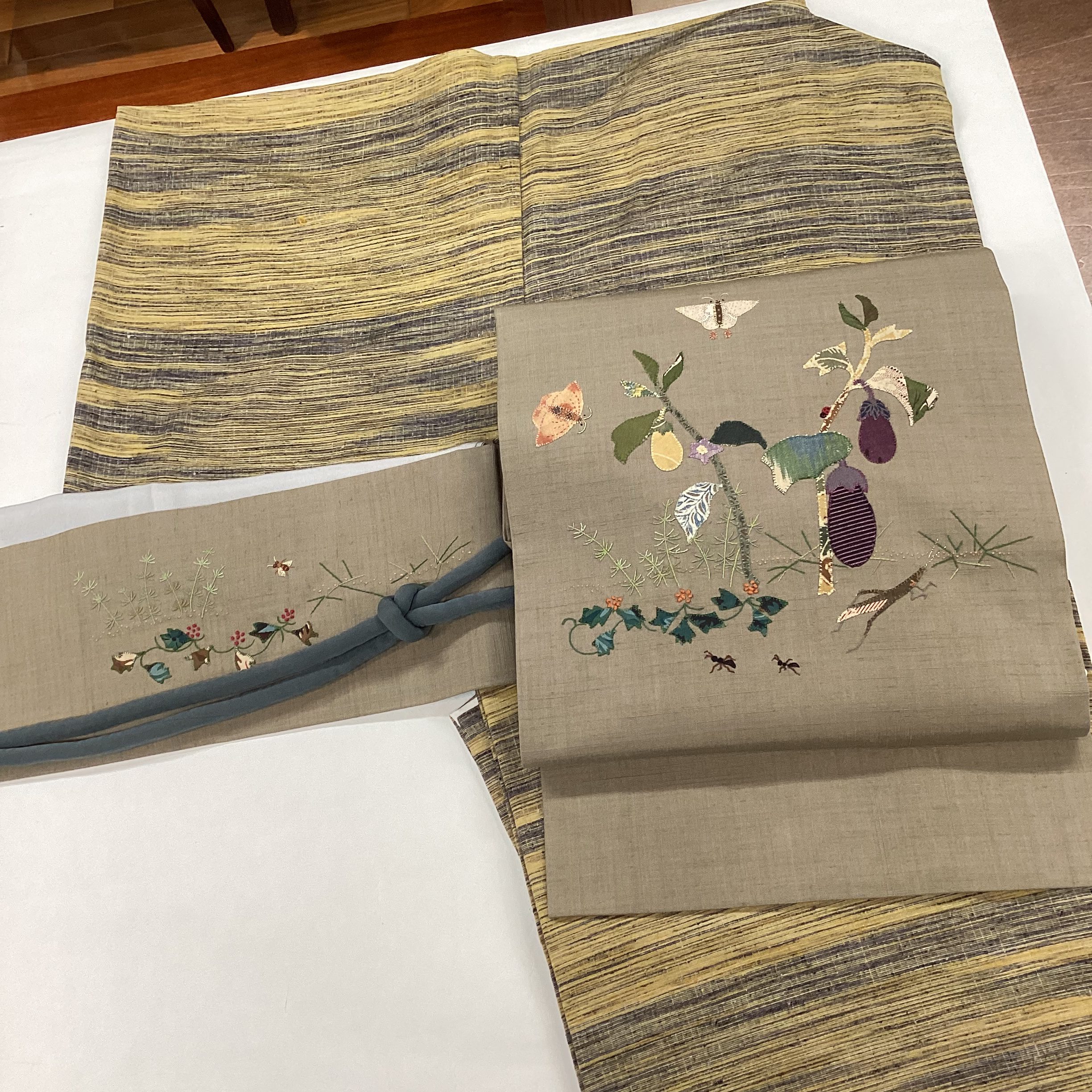 自然の繊維の色合いで縞柄のようになっており、それが、着物の柄の躍動感に、落ち着きを与えています。
