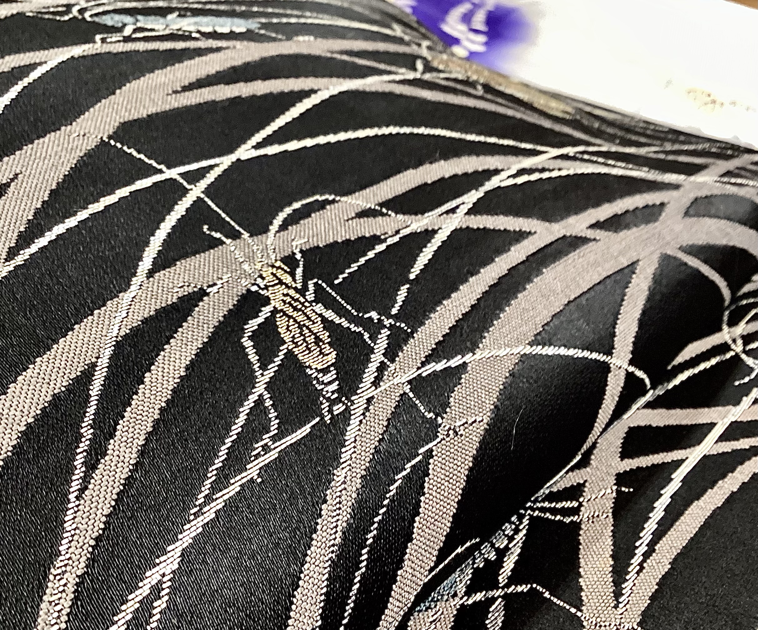 そこに、銀と金、さらに玉虫色の羽の蜻蛉が刺繍されています。