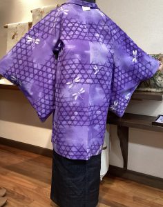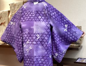 蜻蛉は、夏に多く見られますが、秋空の下でも、水辺をすいすい飛ぶ姿が美しく、着物の柄でも、単衣にも絽にも、良く見られます。