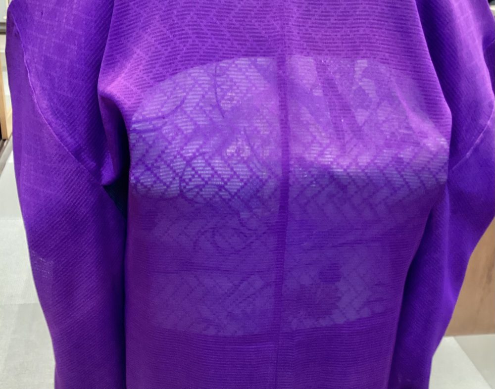 アンティークだからこその、単衣用の生地で作られた、軽くて涼しく、さらに、透け感が何とも言えず美しい、羽衣のような着物です。袖には、白い麻を入れて撮影しているので、実際に着ると、このような感じになります。
