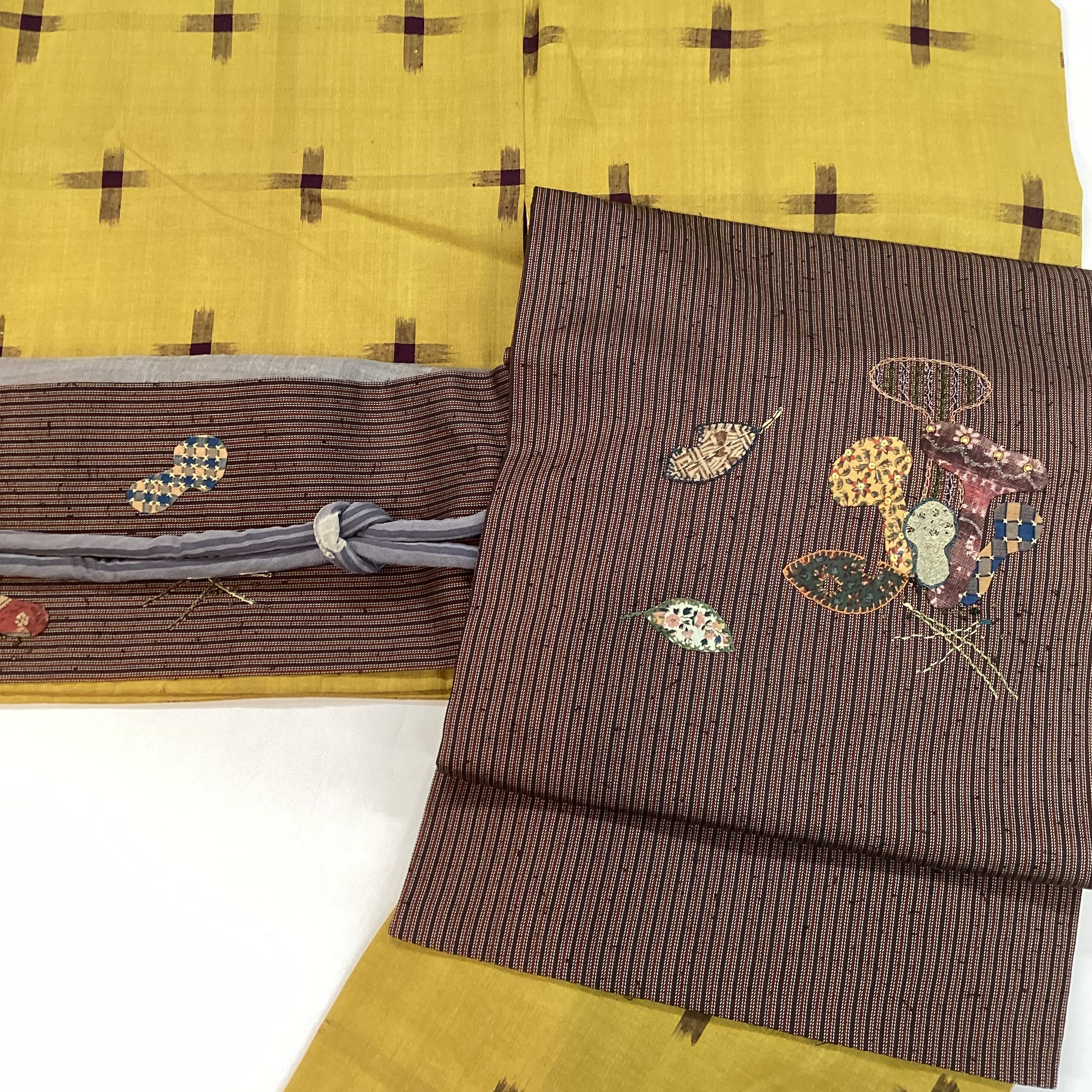 合わせたのは、こちらも新入荷の縞にキノコのパッチワークの帯。