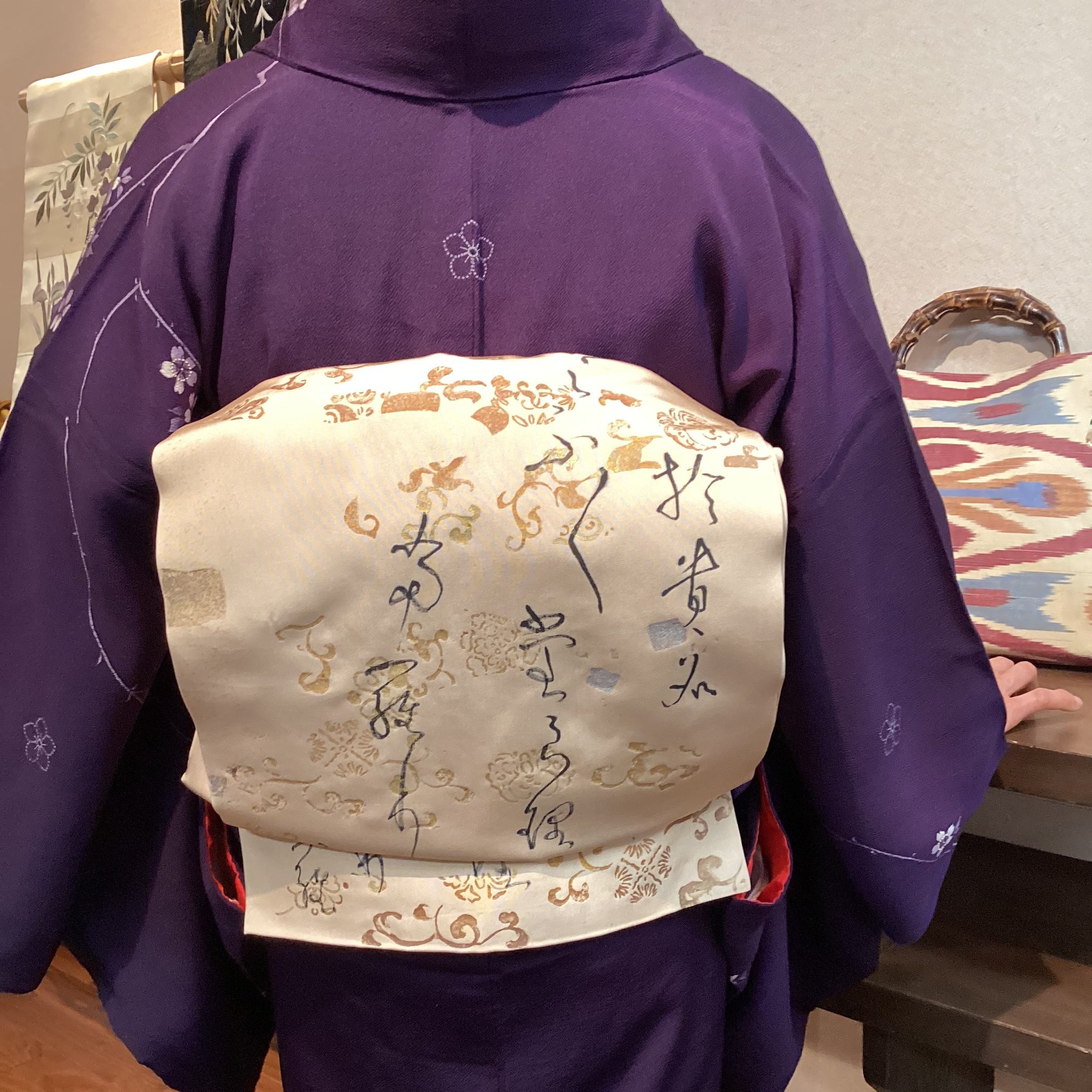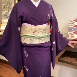 次のお客様は紫に桜模様の訪問着。帯には文字が。そして羽織まで桜の完璧な装い。