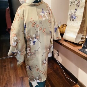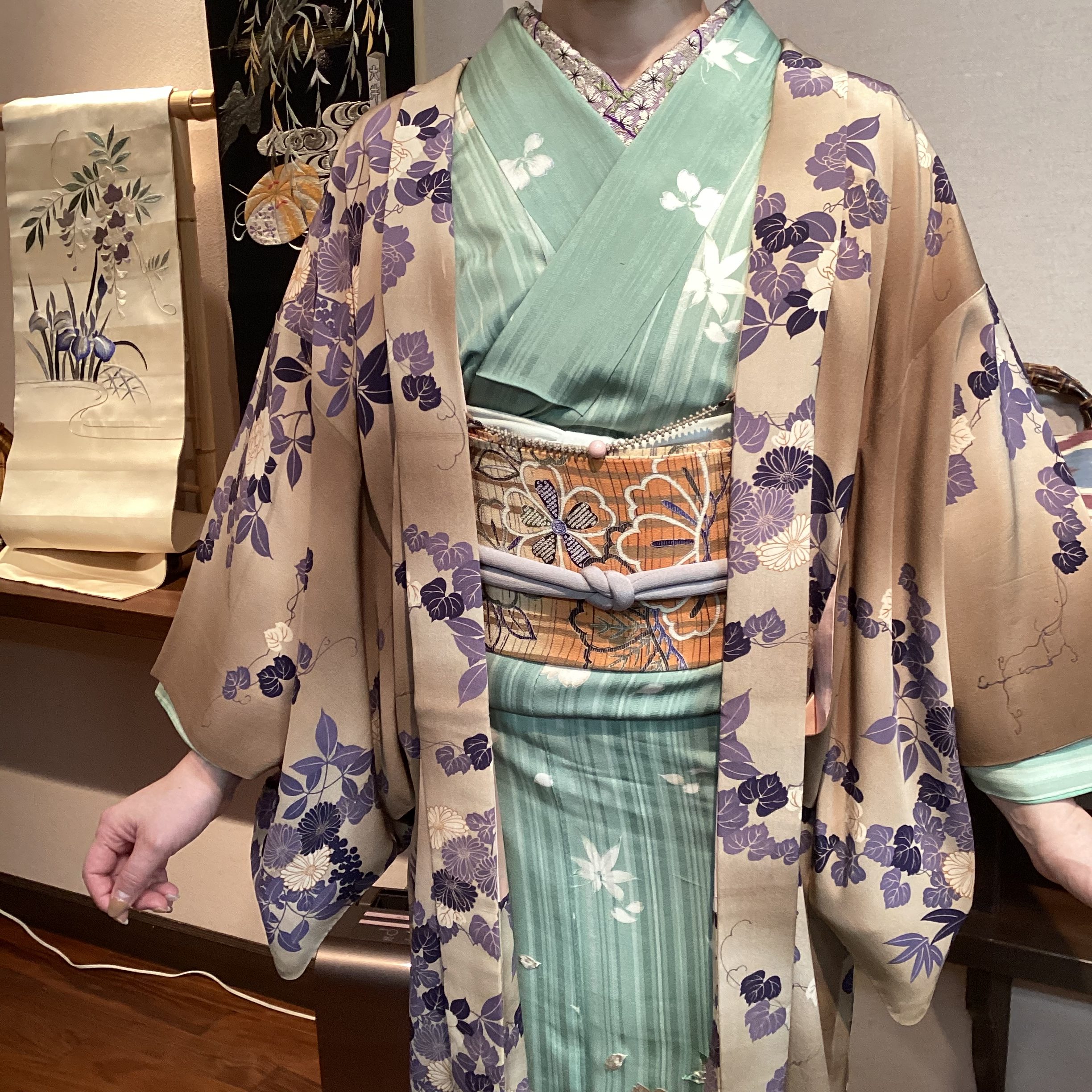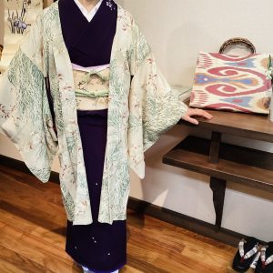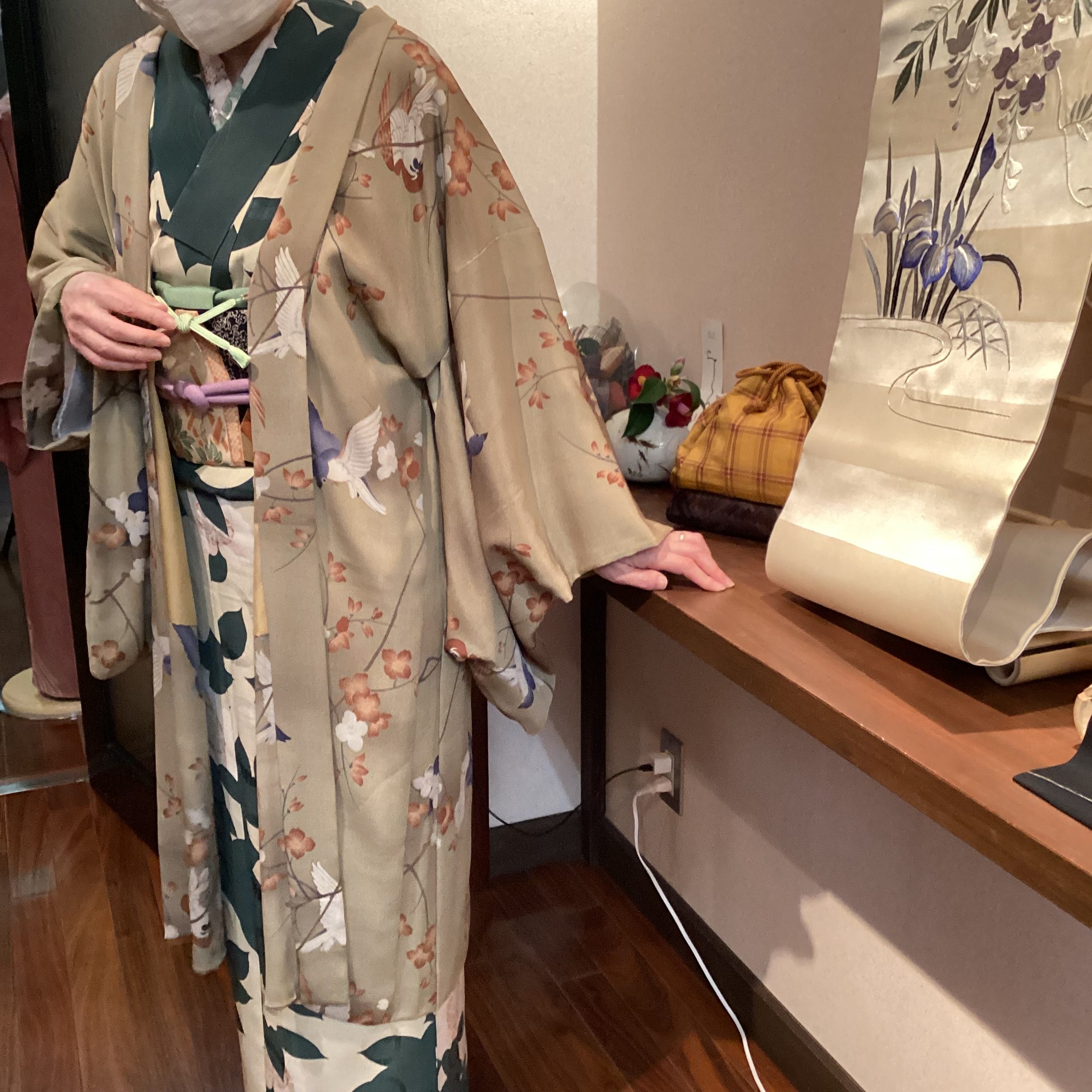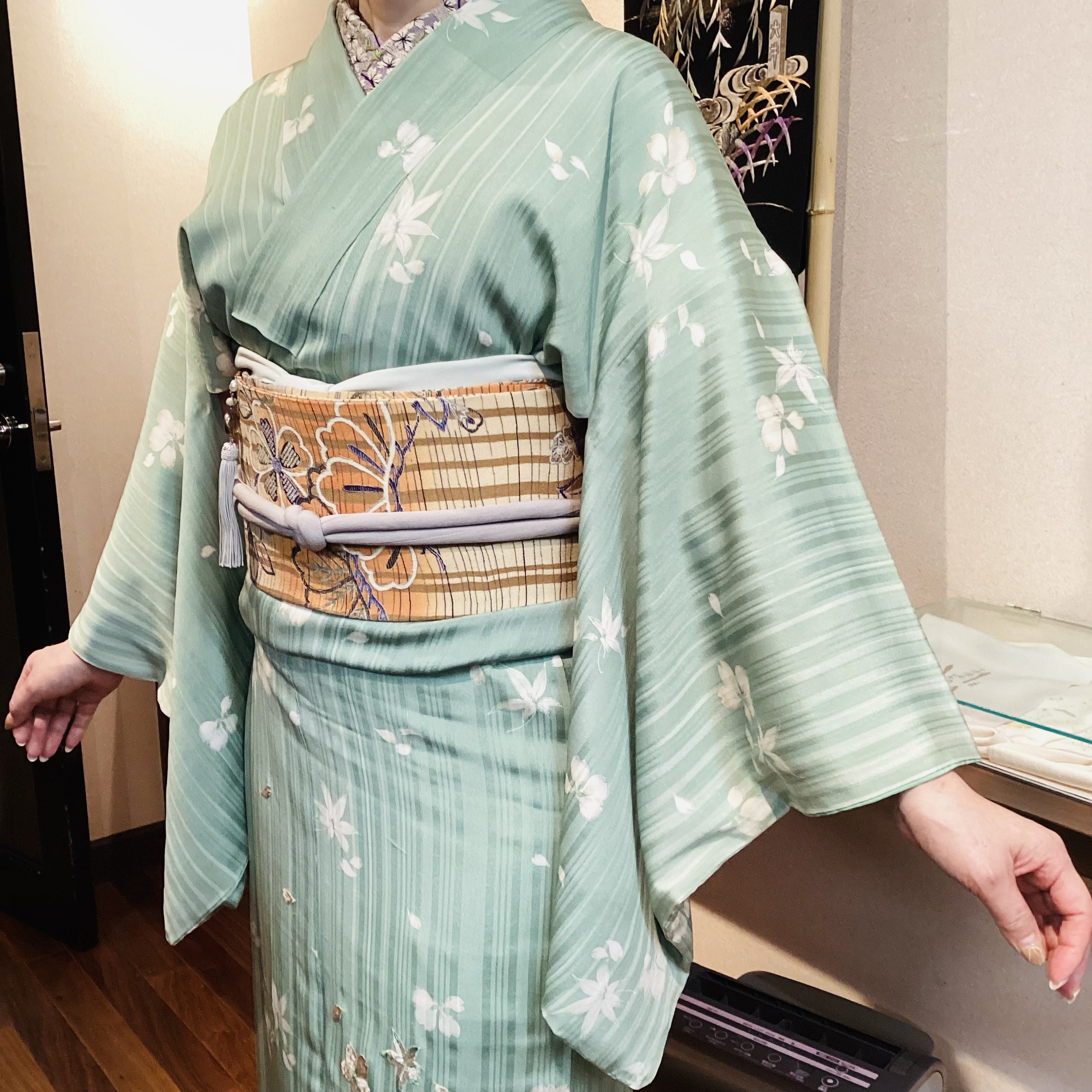 まずは桜模様のグリーンの小紋にイエローの帯、全てが春らしい装いのお客様。羽織も軽やか。