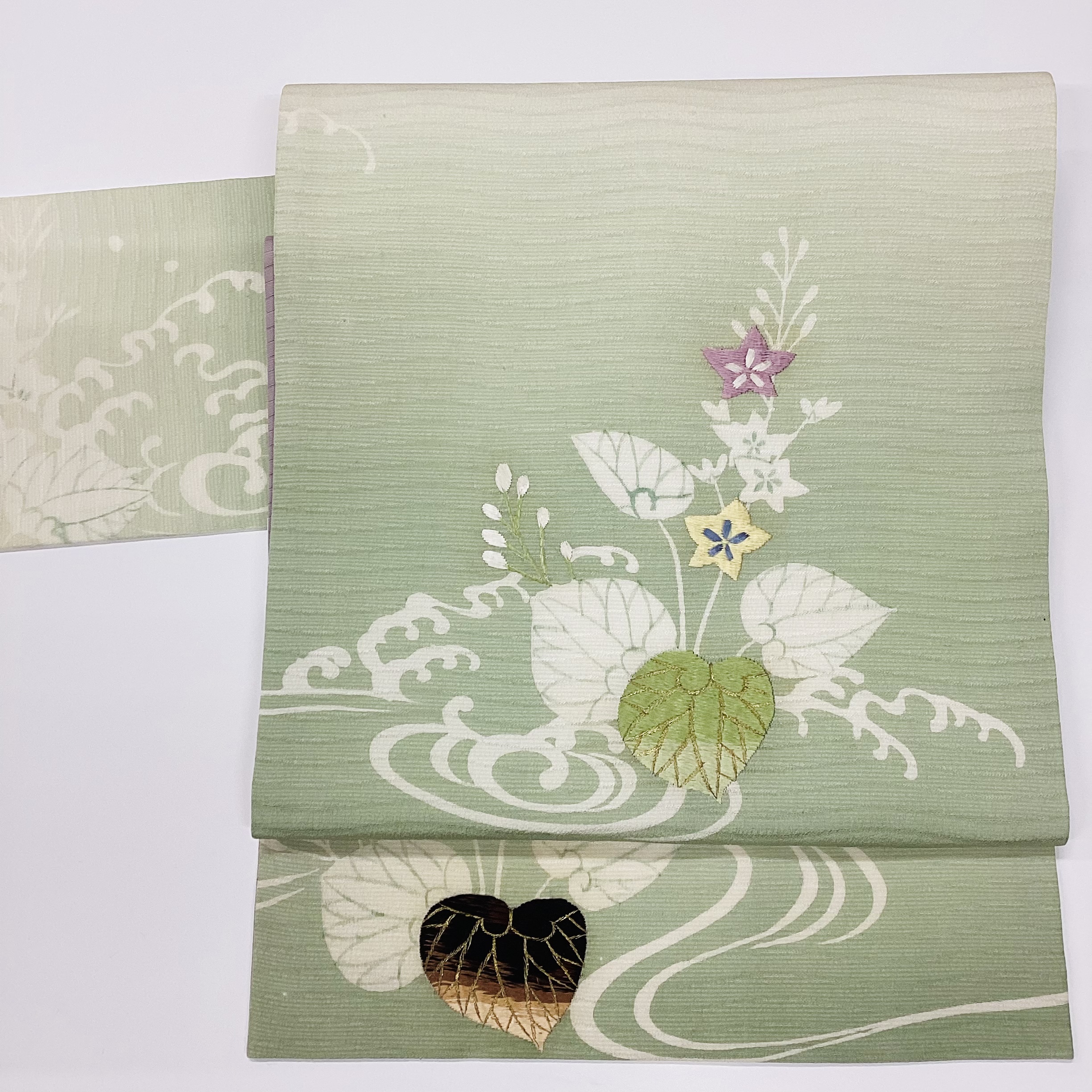 丸帯の片割れなので、暈しの色目といい、水葵の姿といい、どこか品格が漂っています。