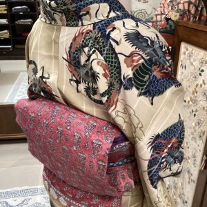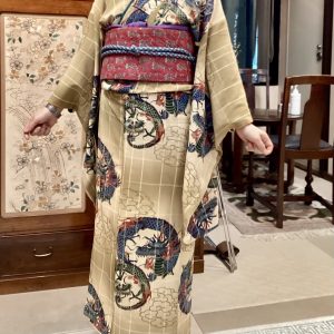 まるで麒麟のような色合いの個性的な着物も浦野理一ならでは。春に向けて明るいコーディネートにしてみました。