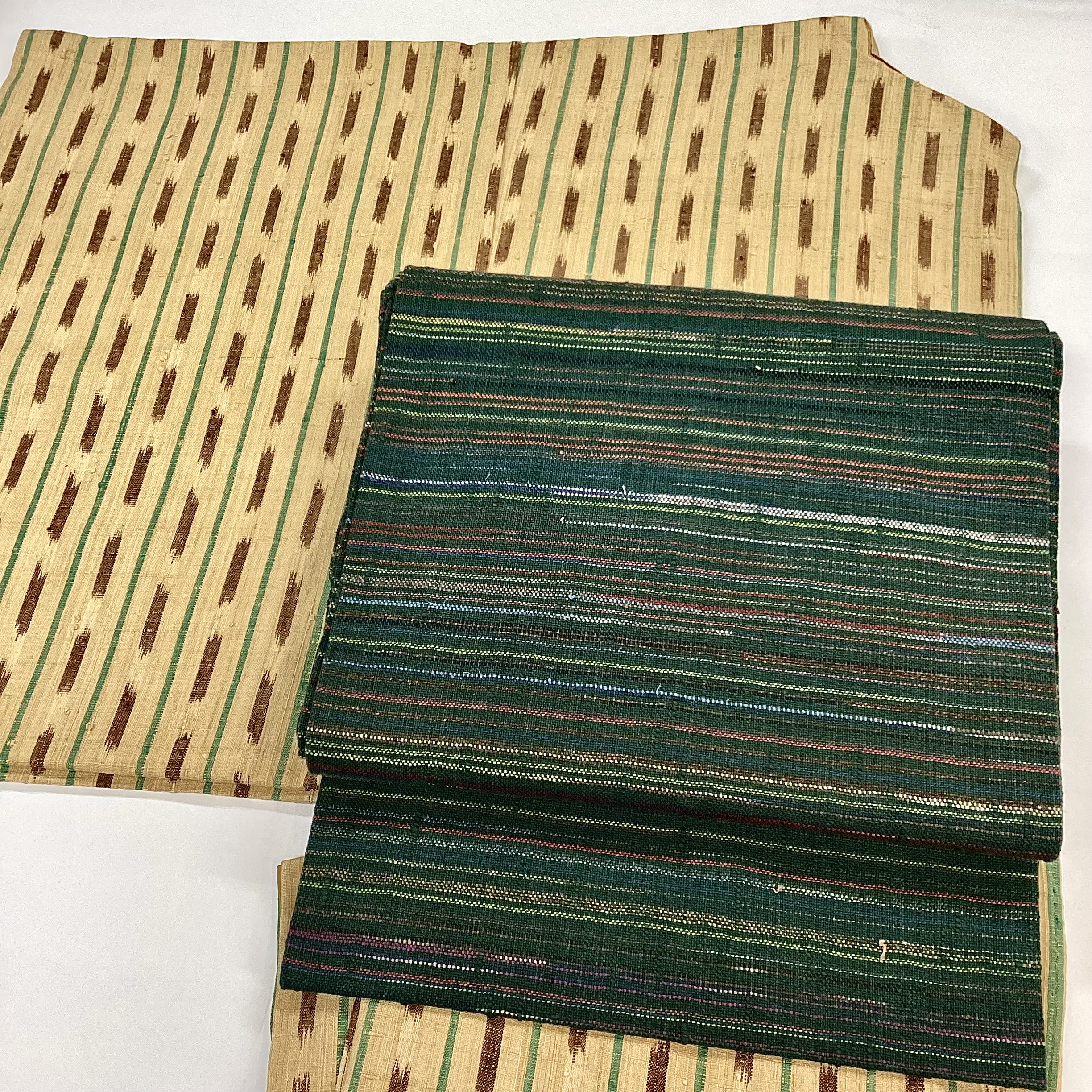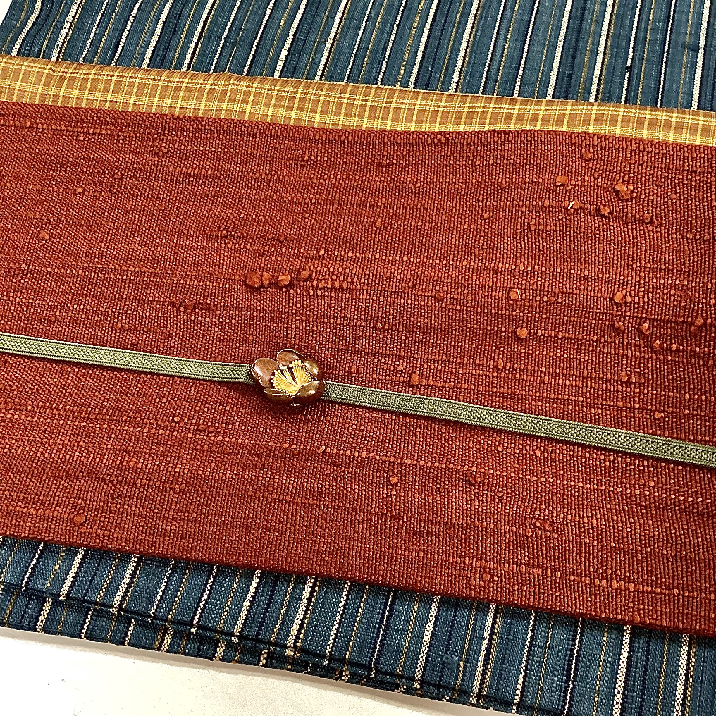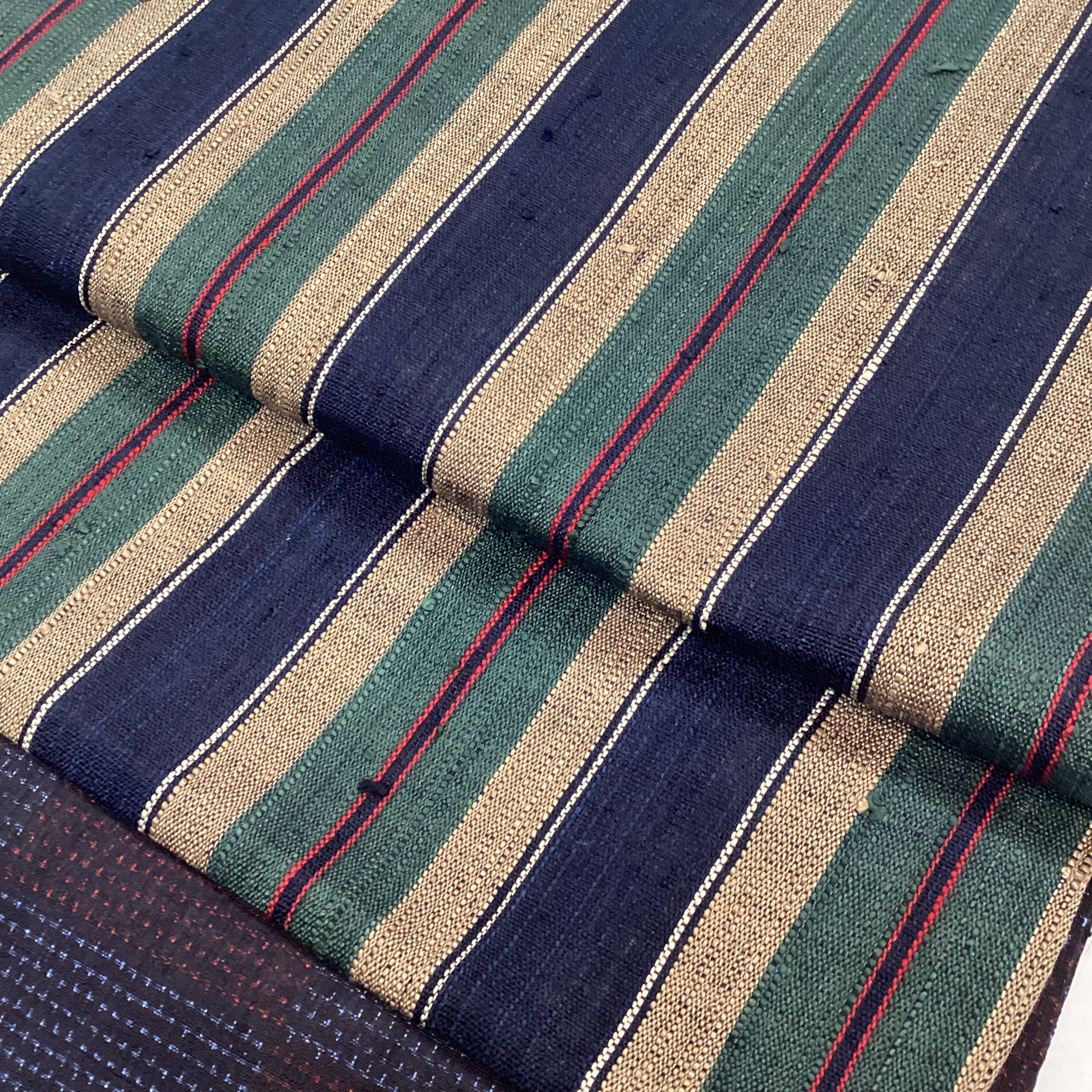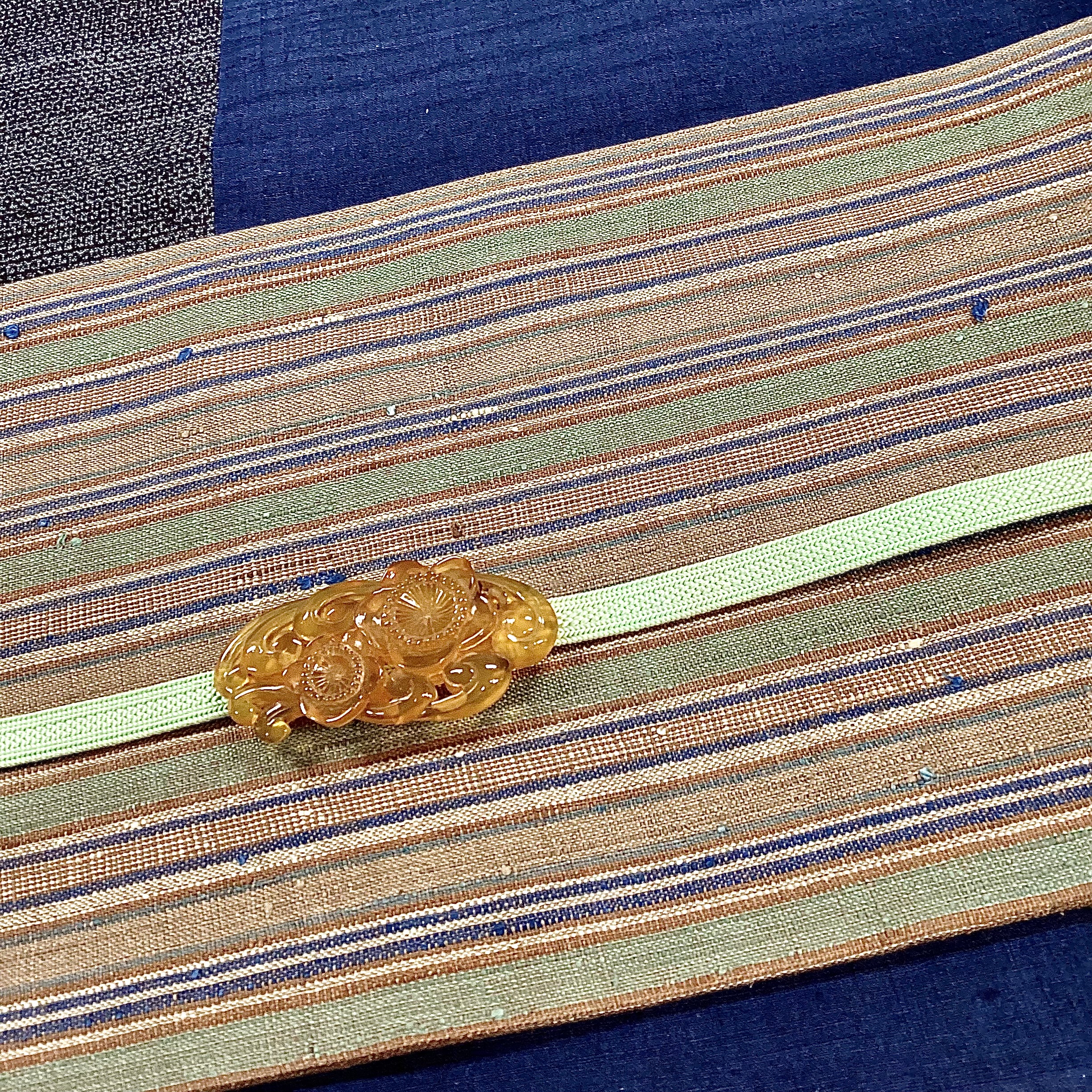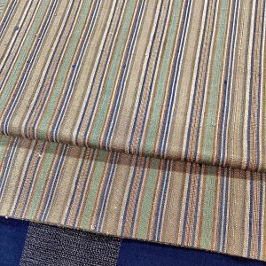 緑の細い縞の帯。色々な色が入っていますが、意外と無地感覚でご使用いただけます。