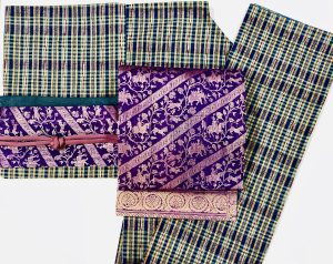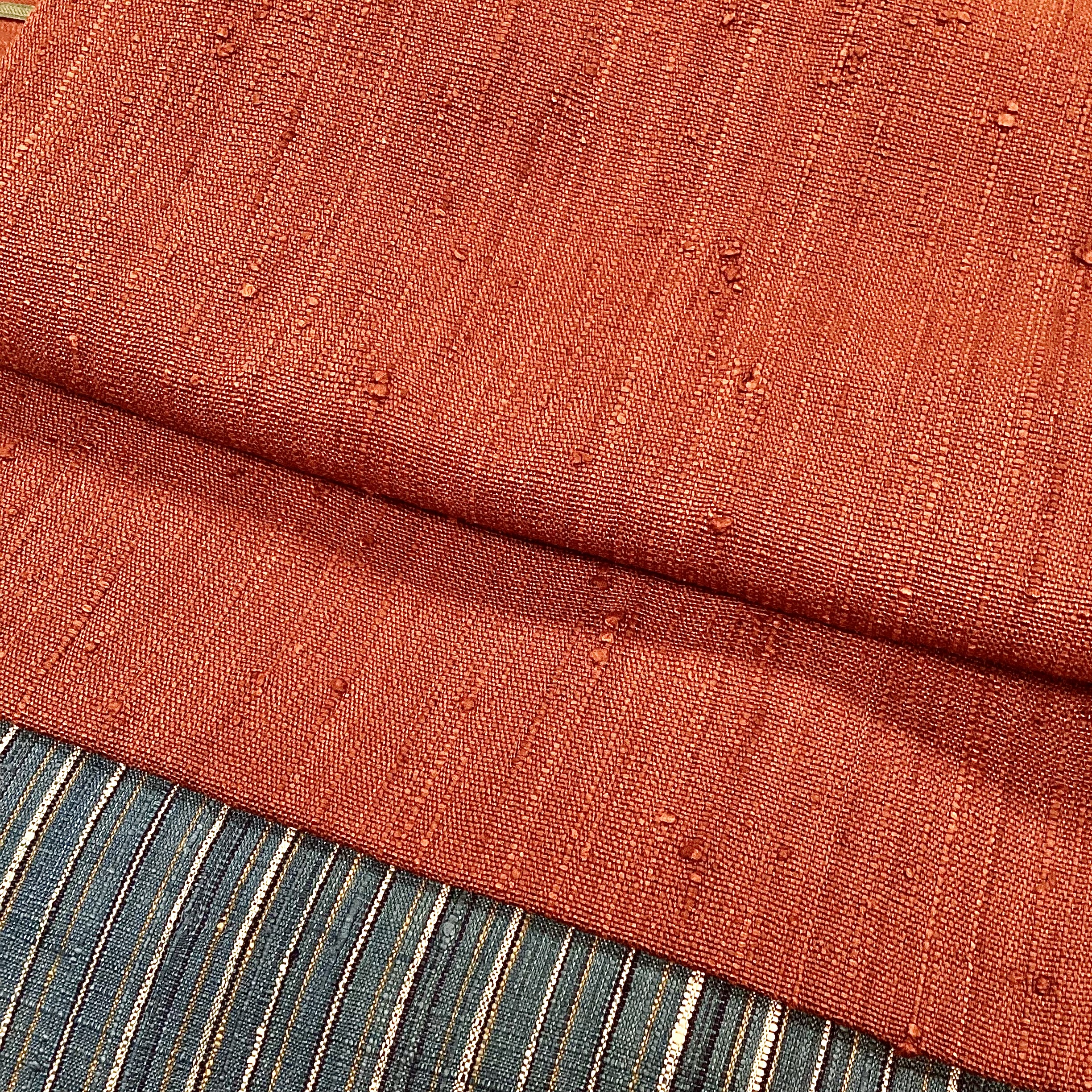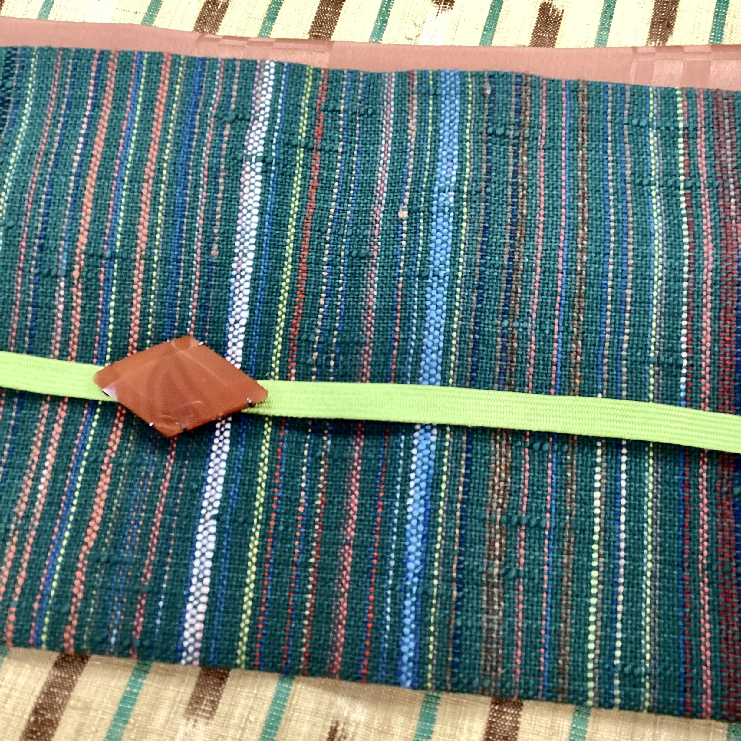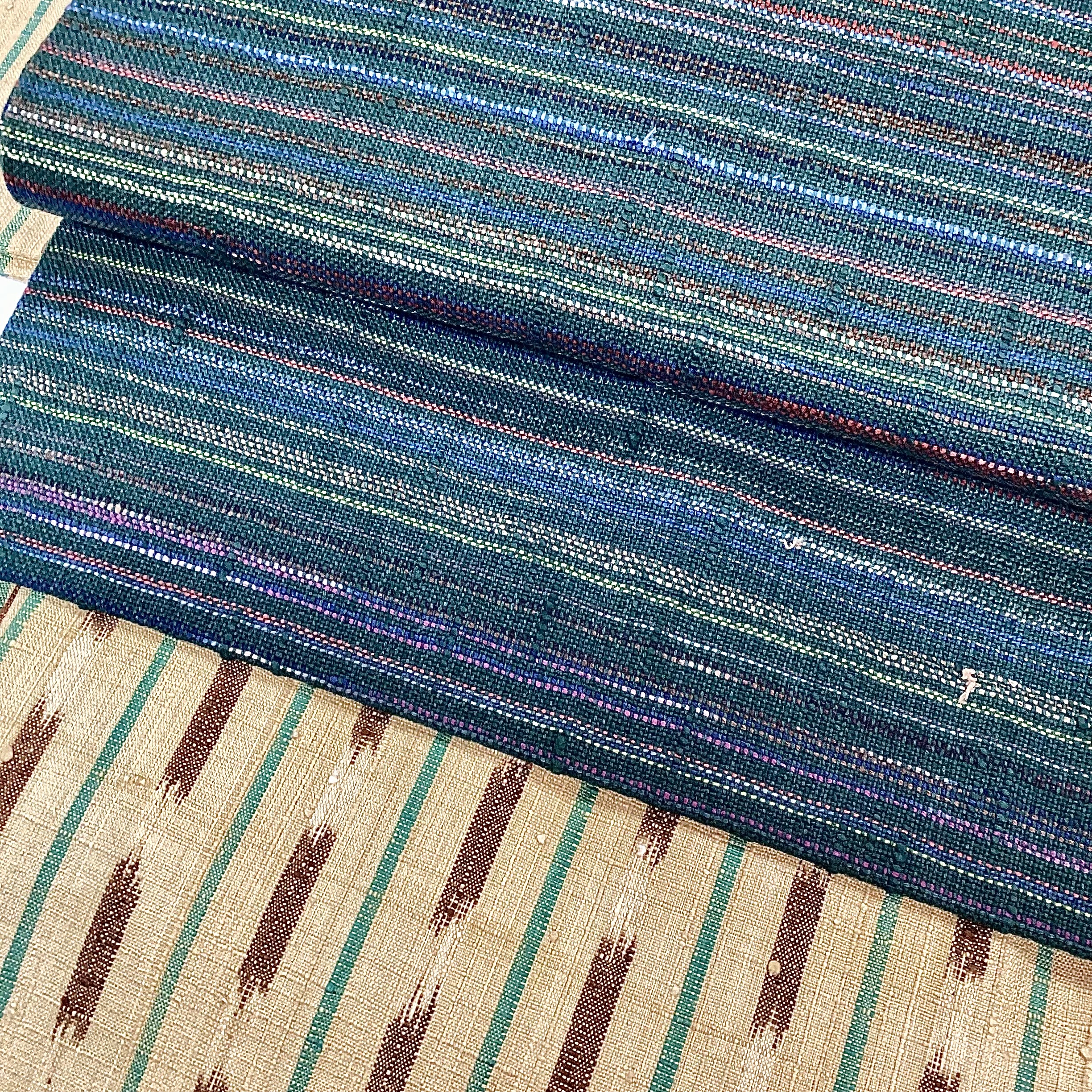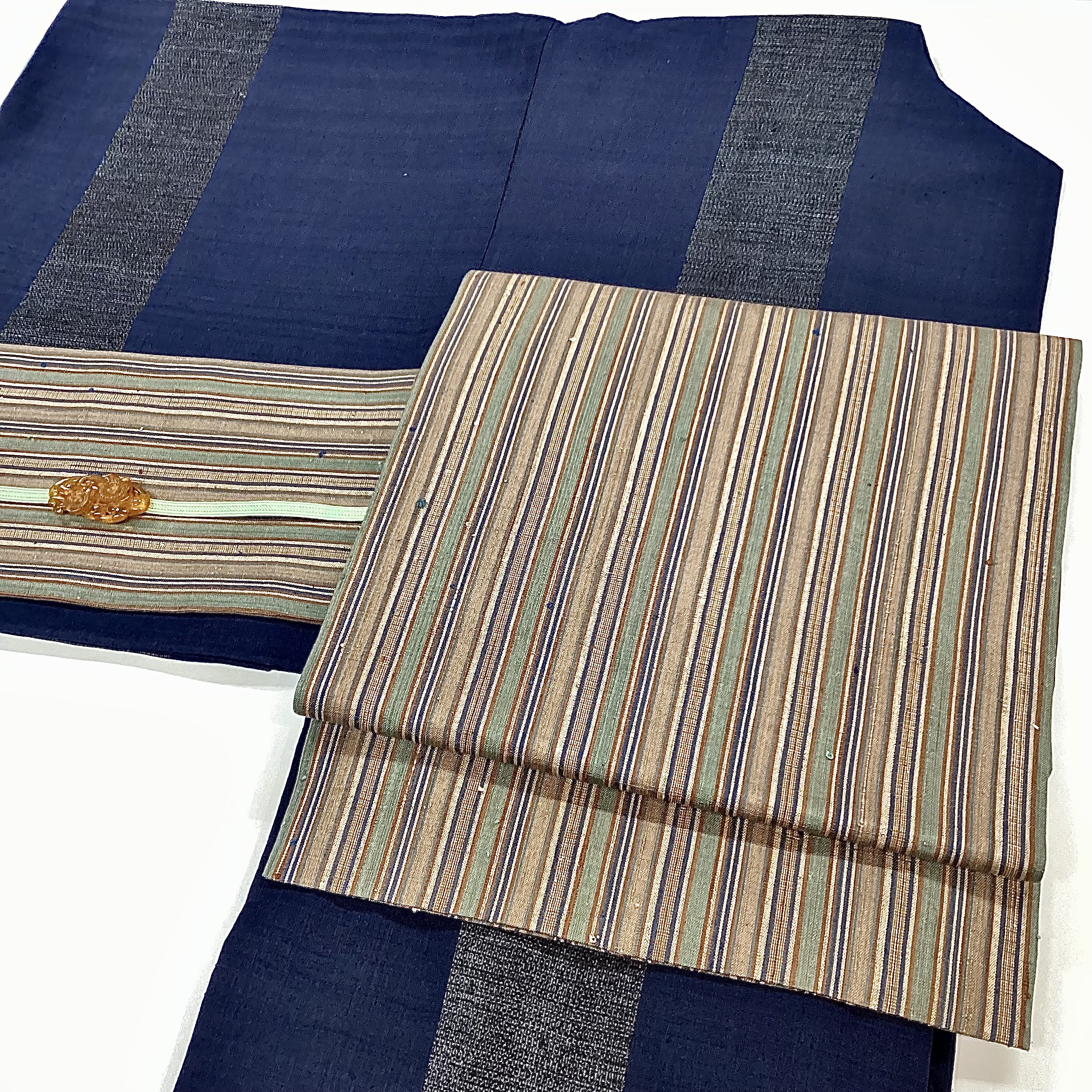 緑の細い縞の帯。色々な色が入っていますが、意外と無地感覚でご使用いただけます。