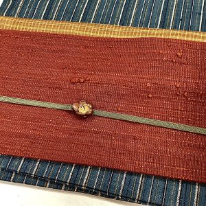 23-11-24 浦野理一縦縞着物 308,000円裄1尺7寸5分、身丈4尺1寸2分、23-11-51浦野理一無地赤銅色帯132,000円、銅梅帯留49,500円(全て税込)