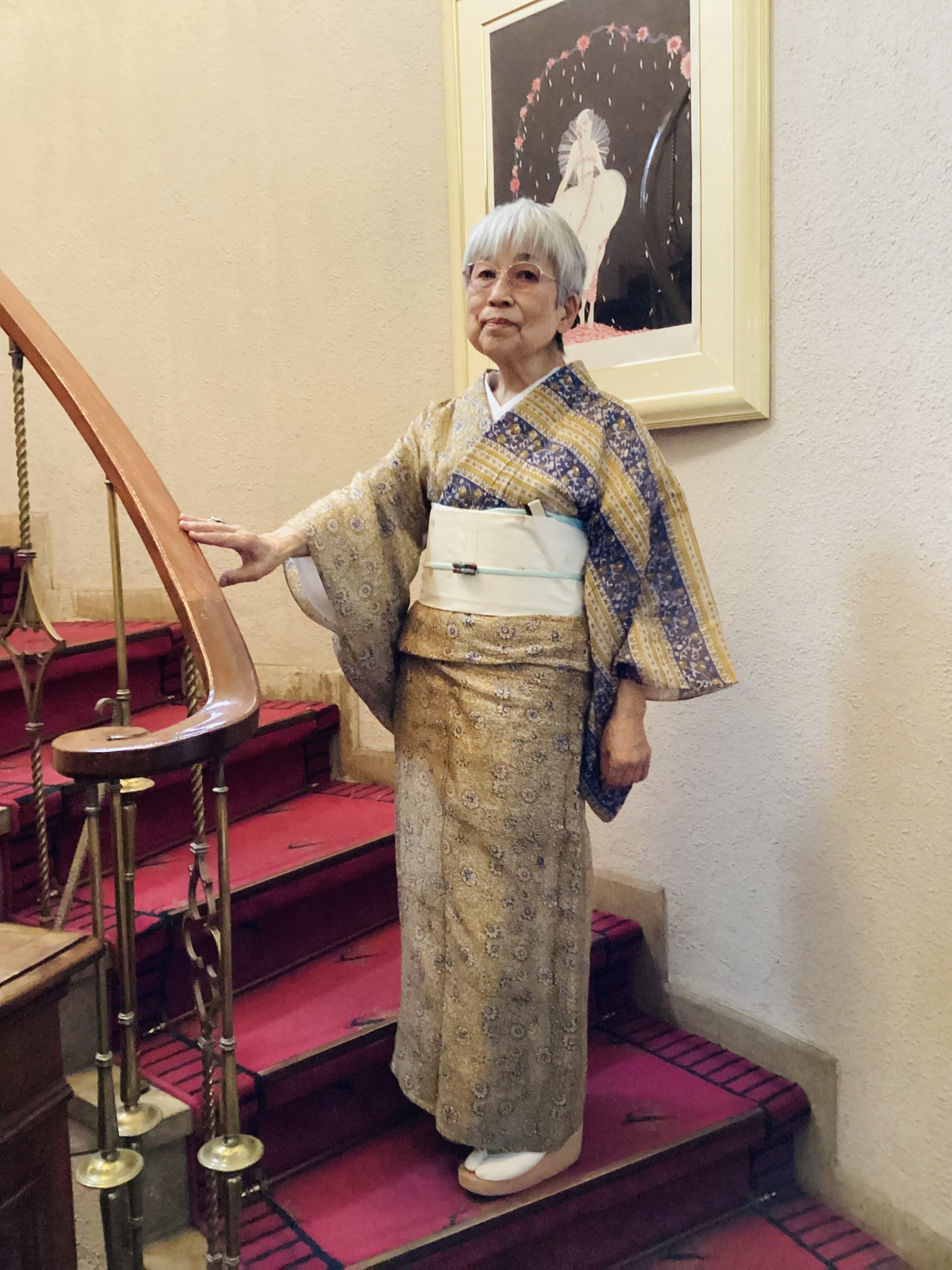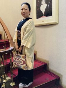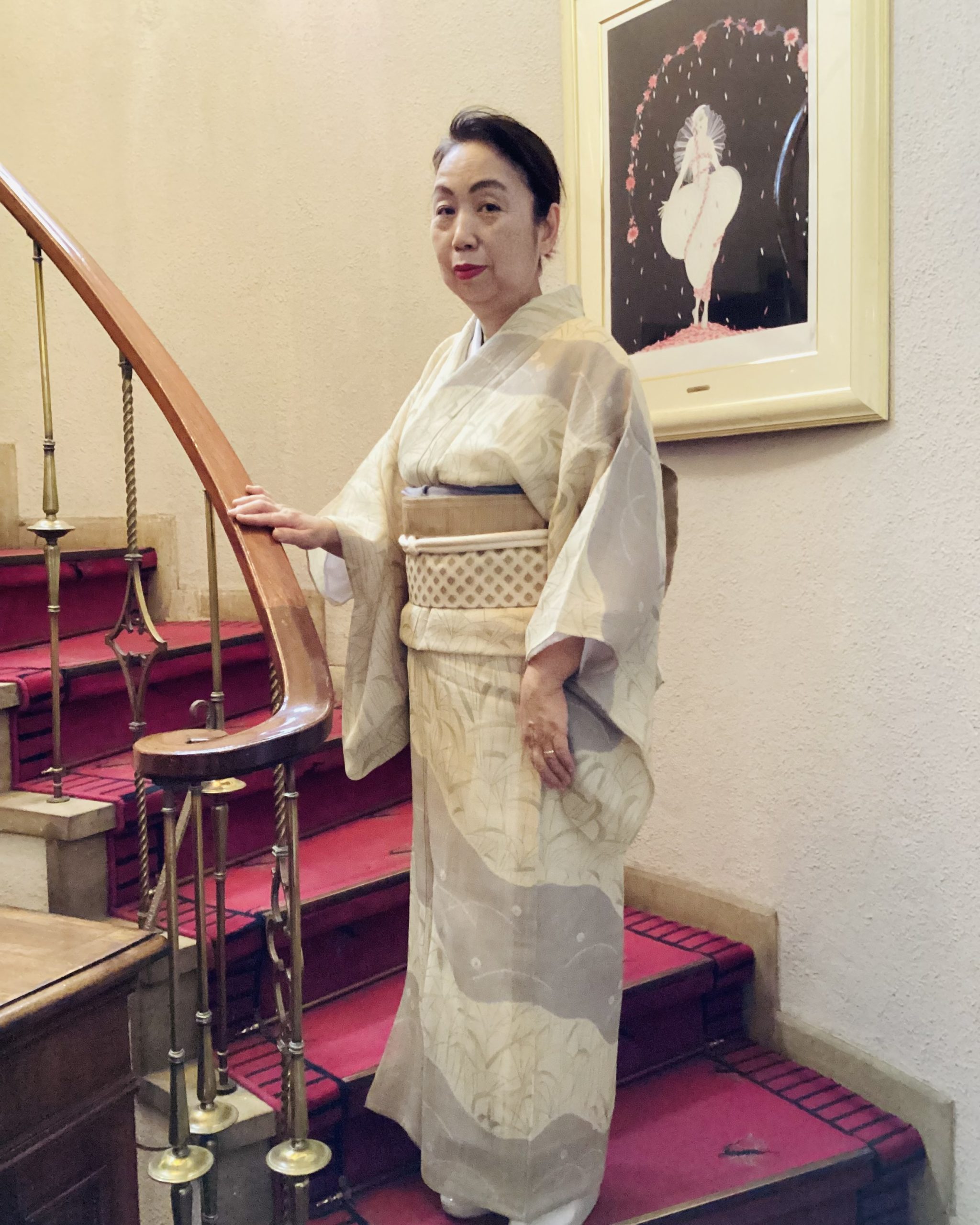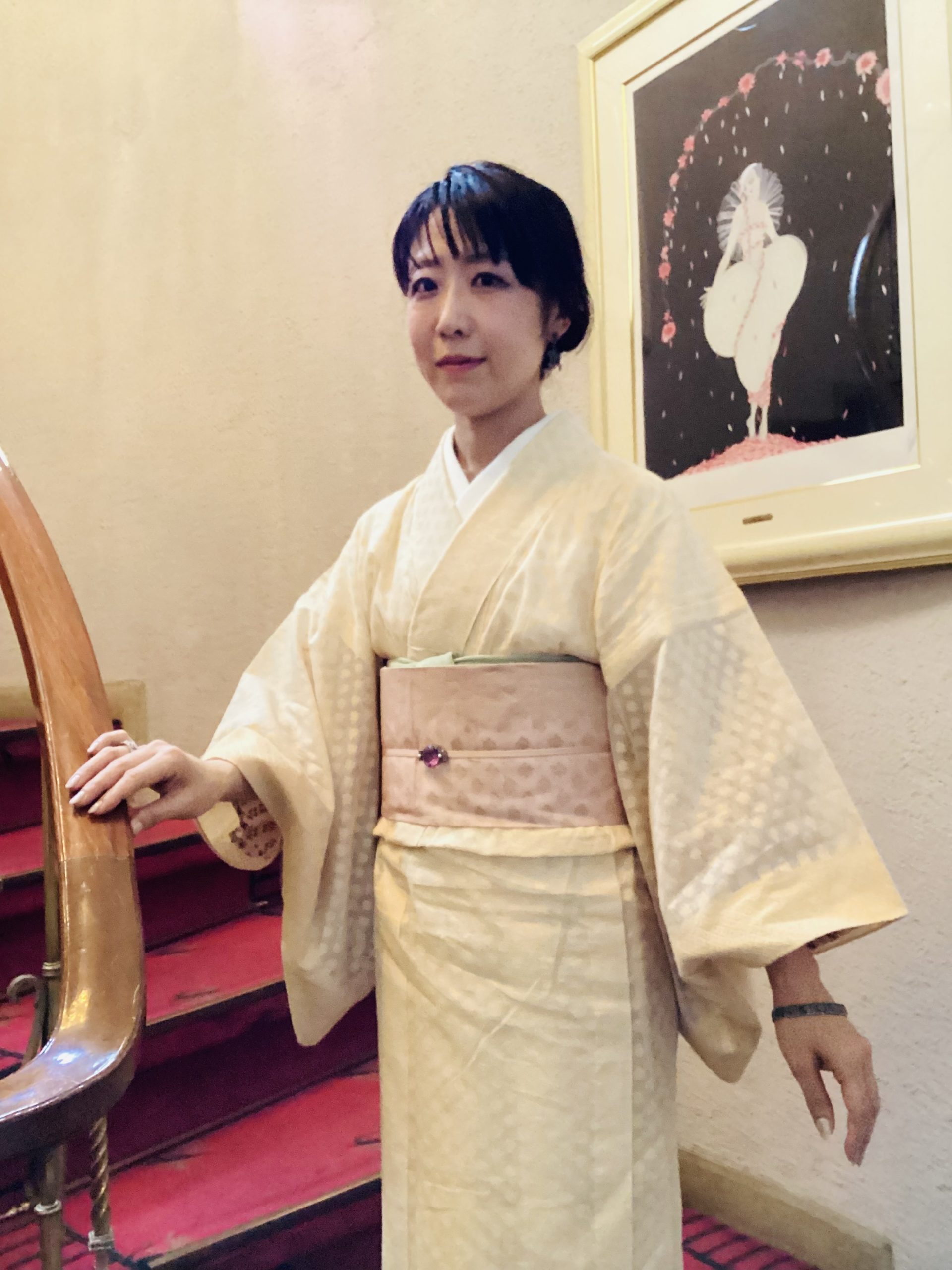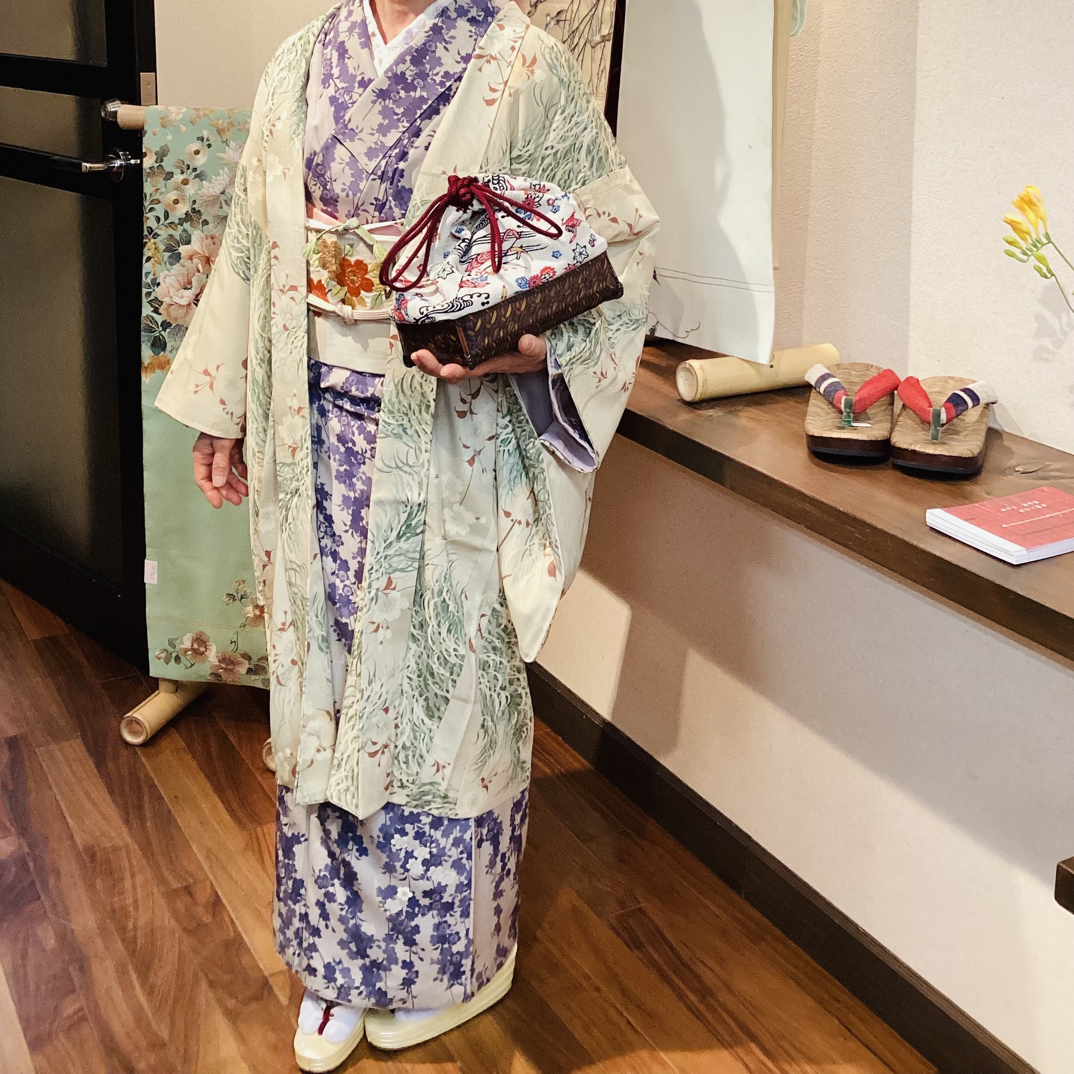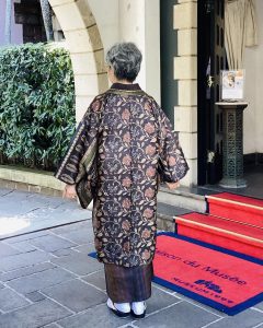 こちらはアンティークの単衣のお着物に、外国布の帯とバッグでコーディネートされ、ドレスコートに合わせて参加して下さいました。