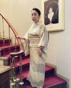 会場の素敵な洋館の階段でパチリ。こちらのお客様は以前当店でご注文いただいたサリーのお着物をお召しになっています。