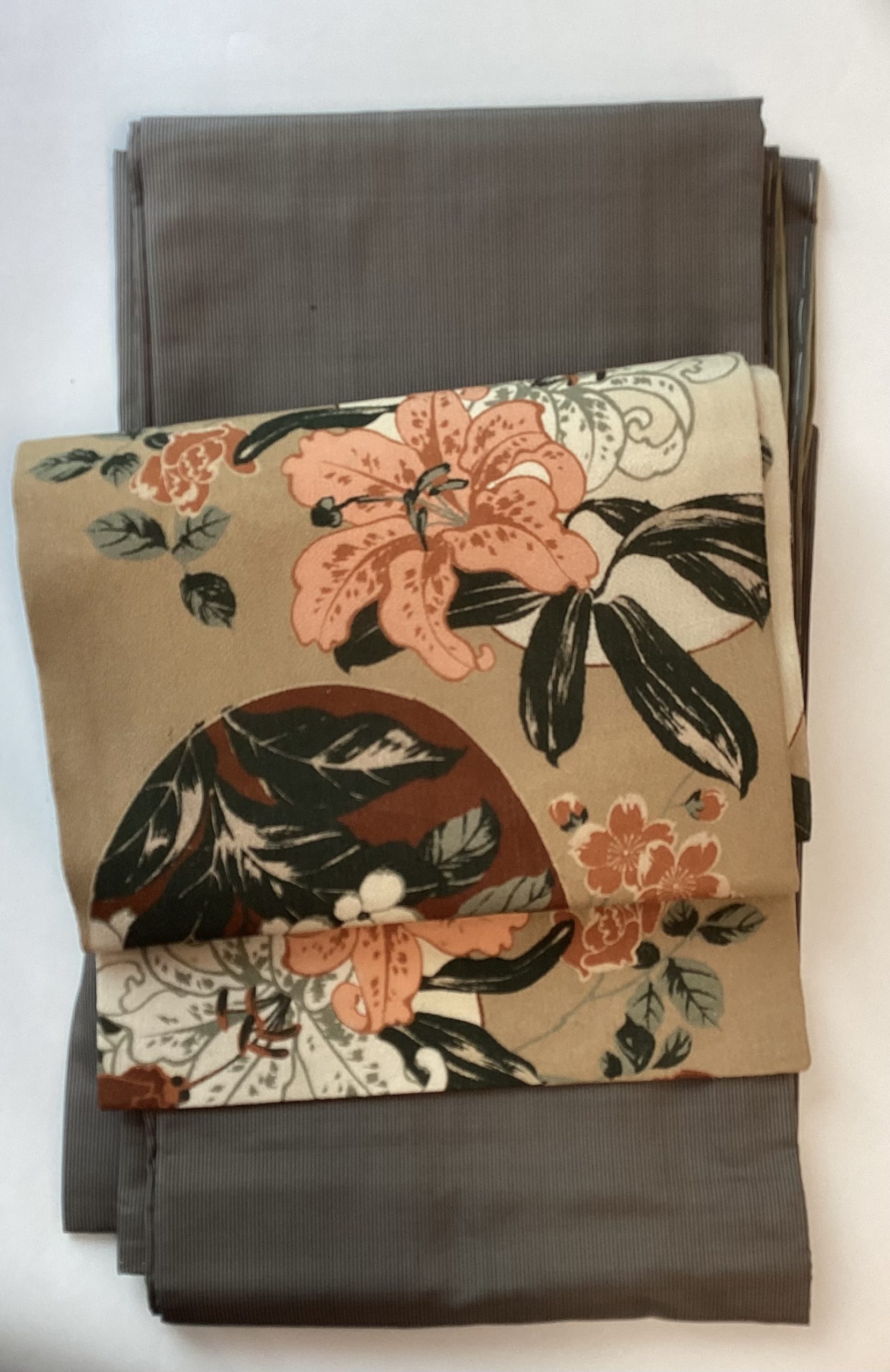 茶の縞の粋なお召しにちりめんの染め帯。春から初夏の百合、薔薇などを大きく散らしたオシャレな帯。