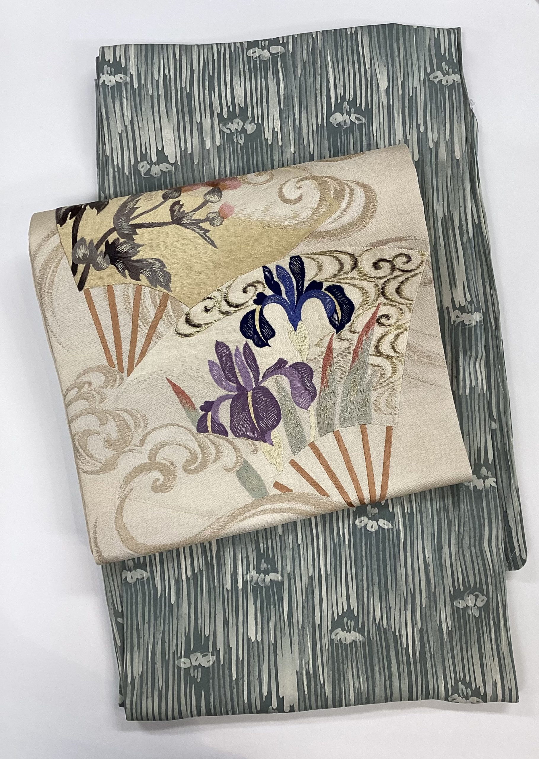 緑がかったブルーグレーの地色にデフォルメした菖蒲を染め拔いたやさしい小紋に、扇の上に菖蒲、アザミを刺繍した綺麗な帯の取り合わせ。