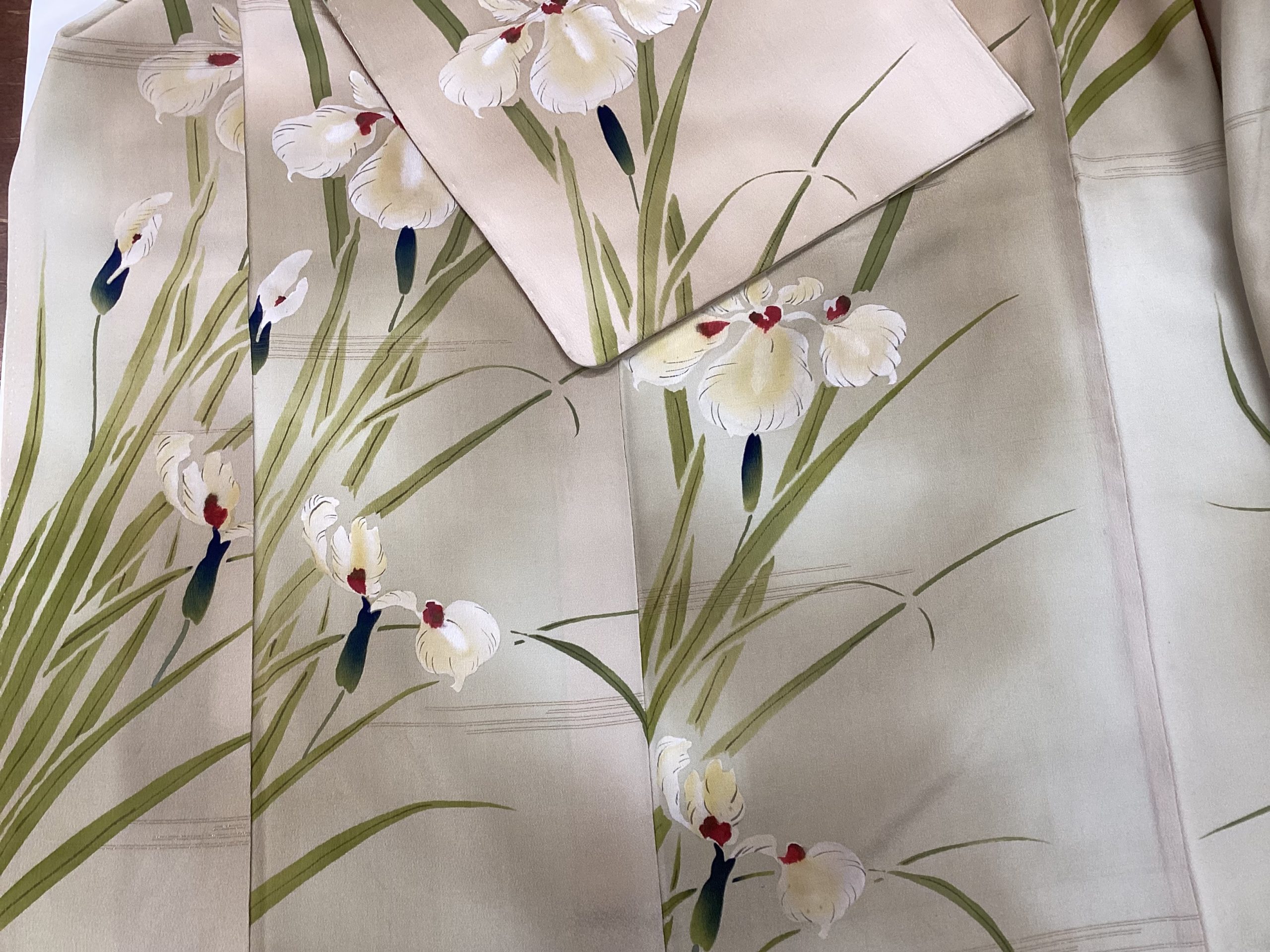 クリーム地に咲き誇る菖蒲を大胆に描いたお着物、まさにいまが着どき、着物の醍醐味を味わっていただける素敵な小紋です。