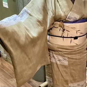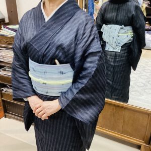 こちらのお客様の帯は能装束の「水衣」のように緯を太くしたり、又は緩く織ることによってなみ打たせた織地。