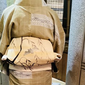 柳に蝙蝠の刺繍の帯で、まさにぴったりの銀座結びで大人の装いですね。