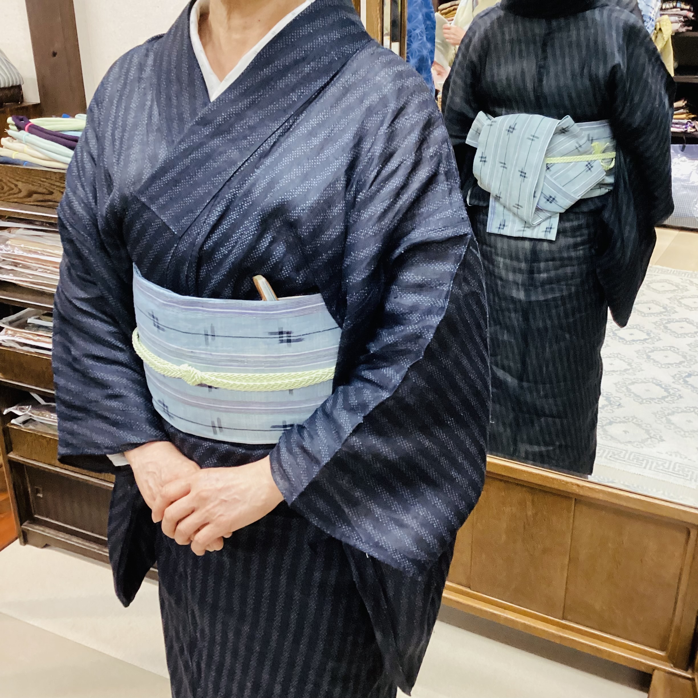 糸の細い上質な斜めの縞の宮古上布には、琉球壁上布から作った半幅帯を合わせて。