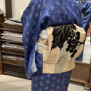 その上にたわわに実った葡萄を色濃く刺繍してあります。お手持ちの麻の葉模様の宮古上布は色も柄も珍しいですね。