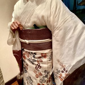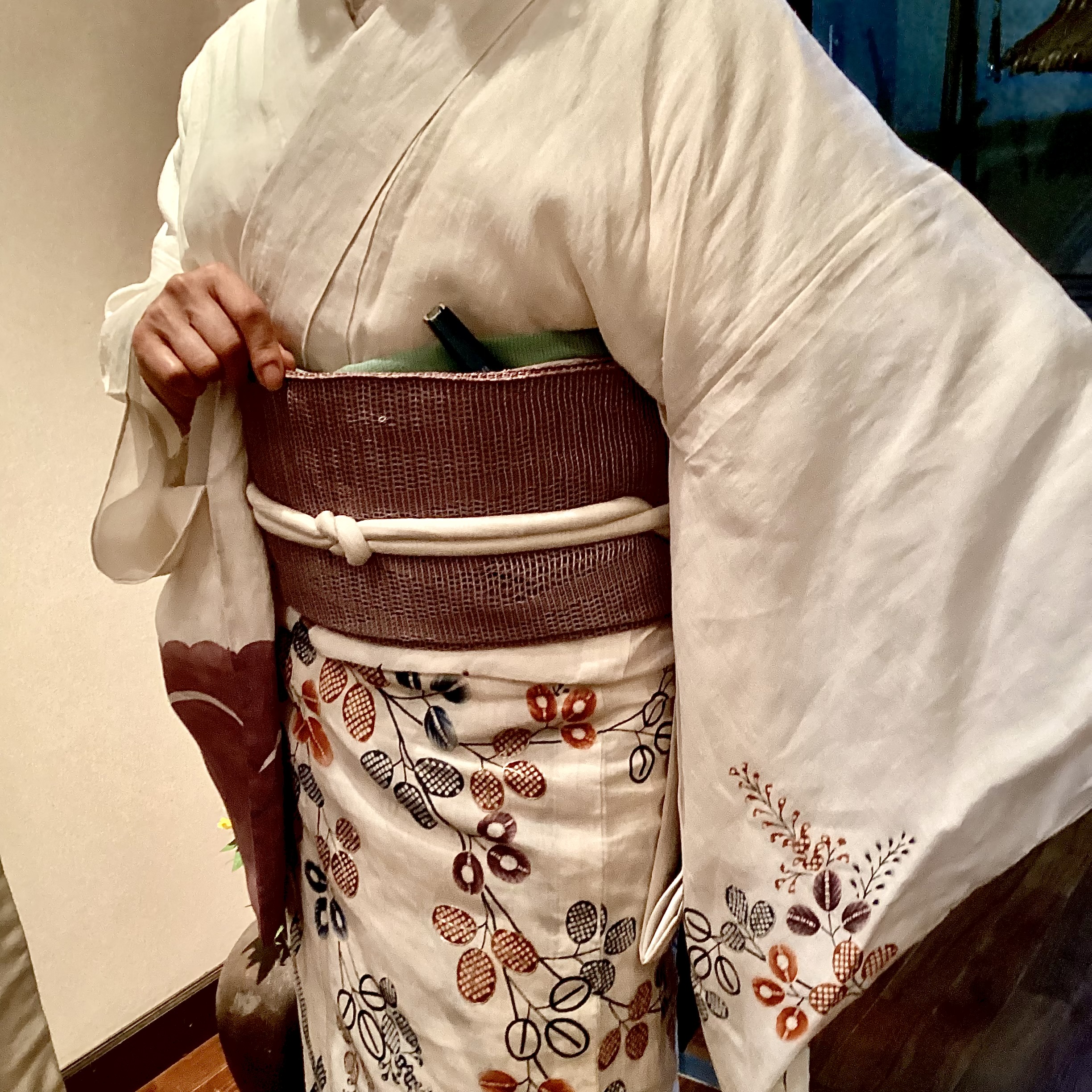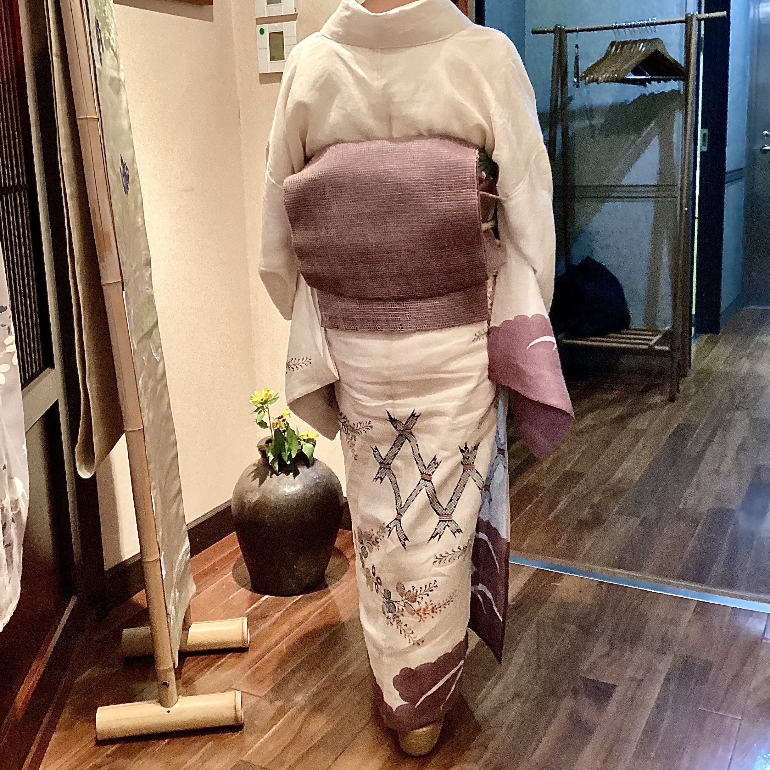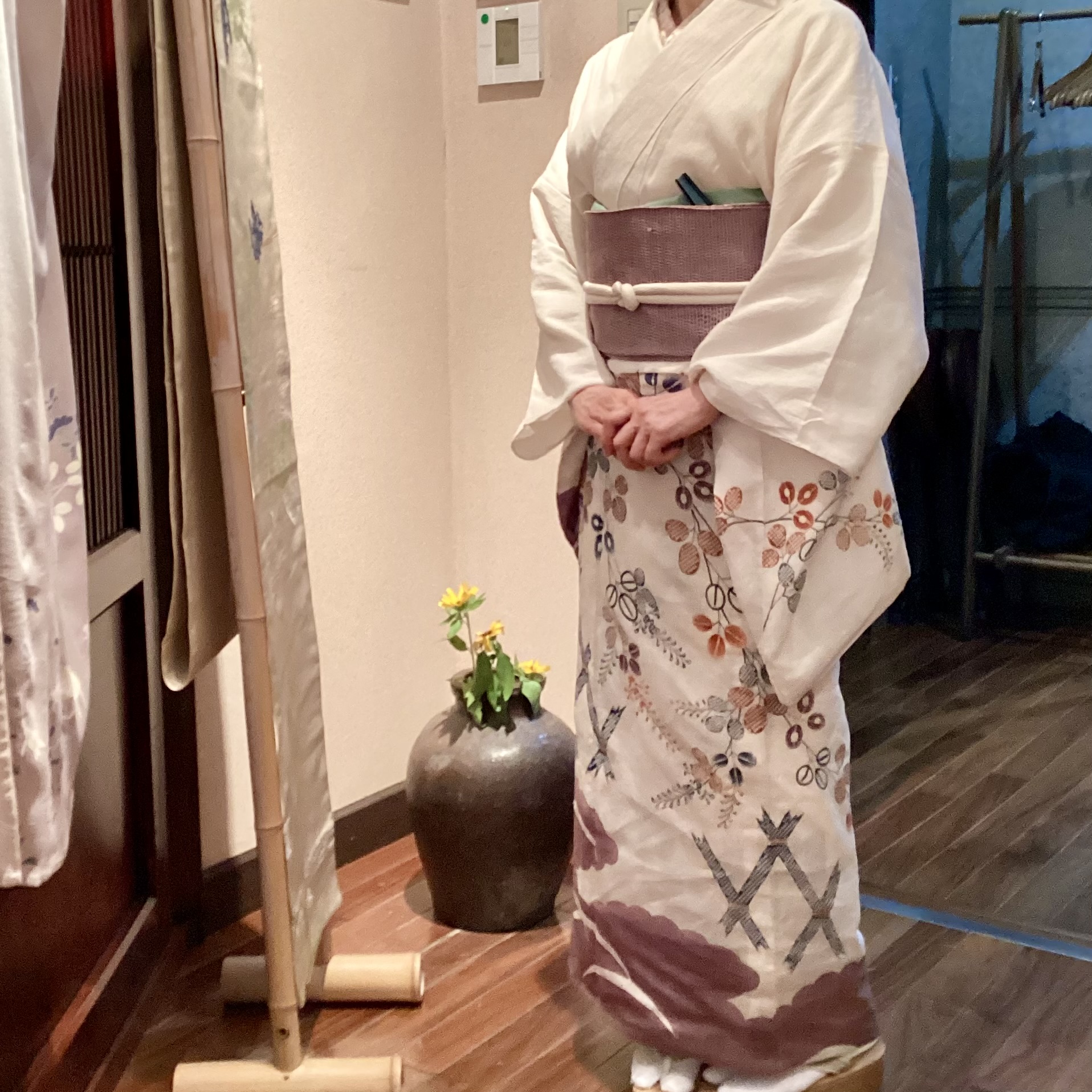 お客様の装い〜夏の華やかなお出かけ着 本日は夏の華やかなお出かけのお客様です。 こちらは元はお引きずりで、袖も長く、夏の婚礼衣裳だったものをアトリエで工夫してお仕立てなおしたものです。間垣に萩模様、金駒刺繍が施され、秋へ向かう今の季節にお召しになるのに相応しい図柄です。優しい色合いの羅の帯で、夏の華やかなな出かけ着。 いつもすっきりとした着こなしですね。 お写真のご協力いただいたお客様、ありがとうございました。 皆様も着物でお出かけ下さい。