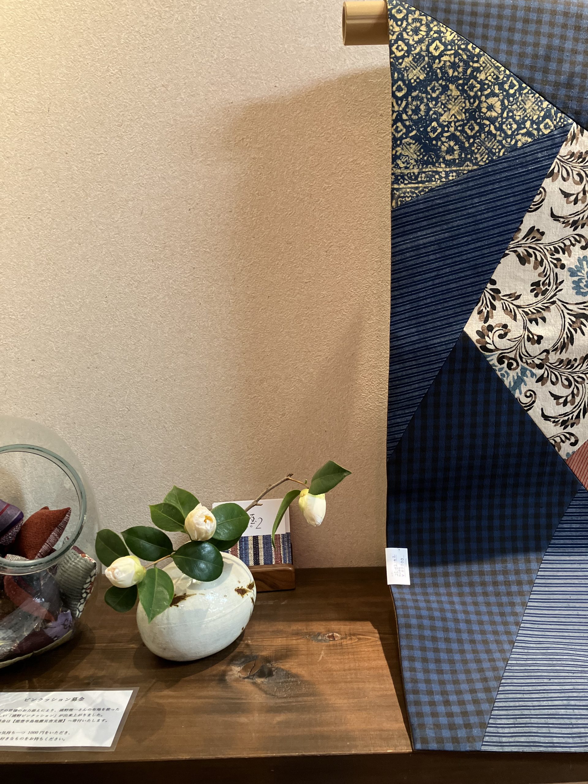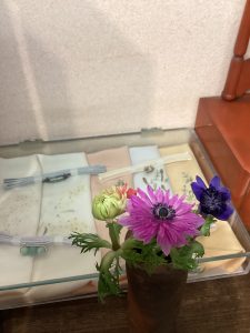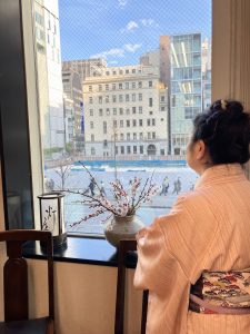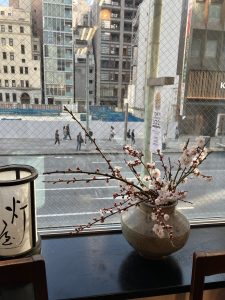銀座店の窓辺と花達 お向かいのメルサが解体され灯屋2からの眺めも変わりました。 なんだか絵の中にいるような雰囲気に。(スタッフがモデルです) 東京マラソンの傍で、店内では花達がひっそりと咲いています。 窓べに置いた花は南高梅。美味しい梅干しになる花です。 今日の銀座店のお花は、春を呼び込むふきのとう 可憐なアネモネ そしてよくお目見えする白玉椿 入口では紅の椿が素敵な寄せ裂帯とお客様をお待ちしております。 また寒さがぶり返すようですね。 暖かな着物でお出かけください。 ご来店お待ちしております。