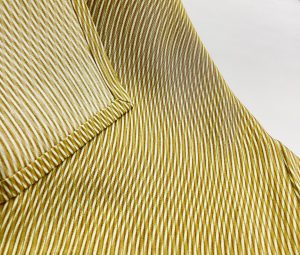 ご紹介の着物は、緑の縞によろけ縞が型染された単衣小紋です。