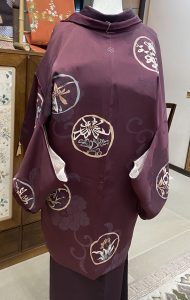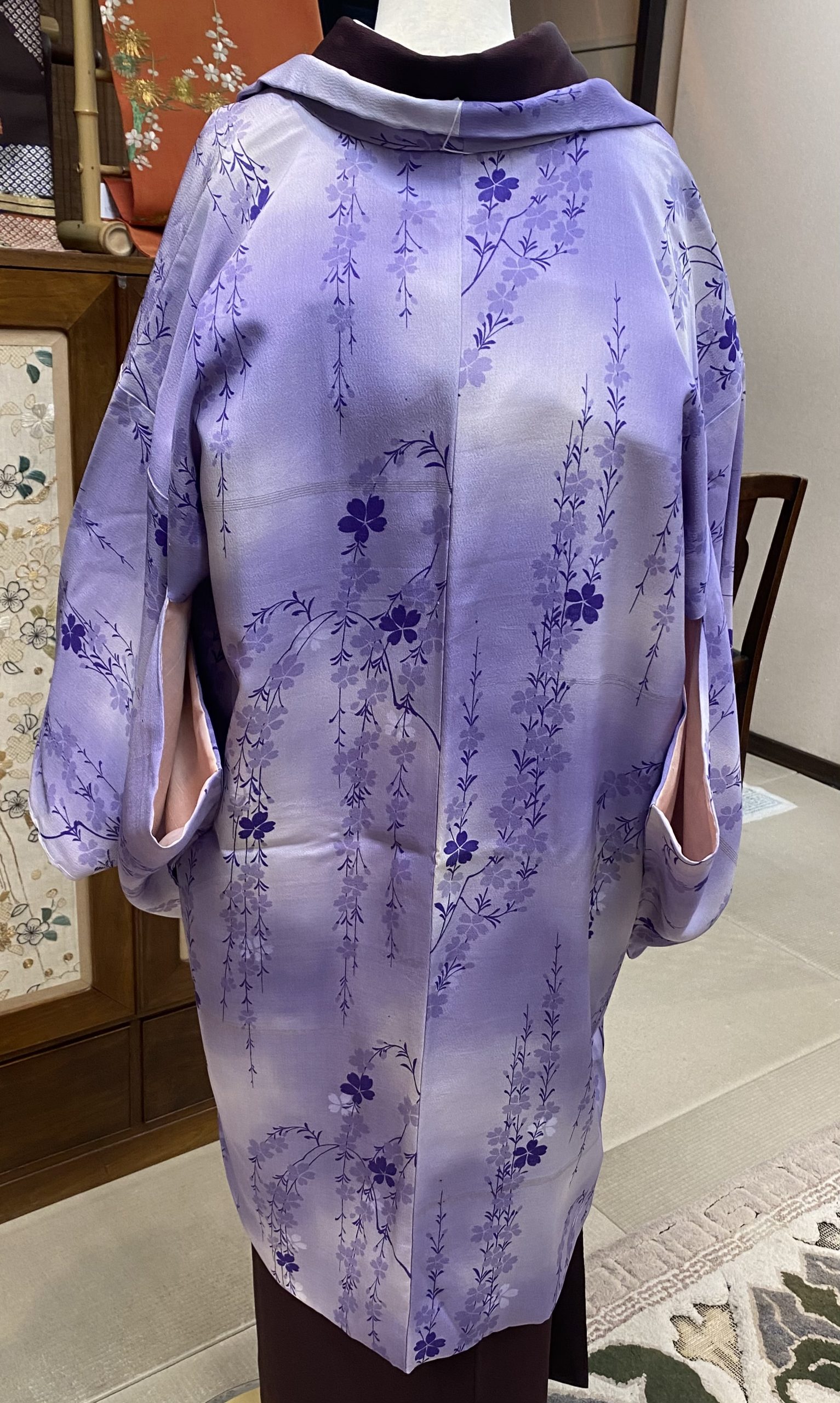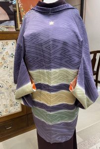 薄い紫に、和菓子を思わせるやさしい色を合わせた羽織は、これからの季節にぴったりです。